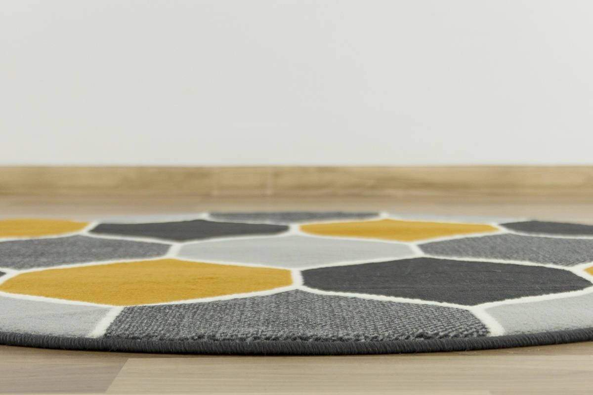Dywan wyróżnia się wzorem składającym się z połączonych sześciokątów w odcieniach musztardowej żółci, szarości oraz grafitu.