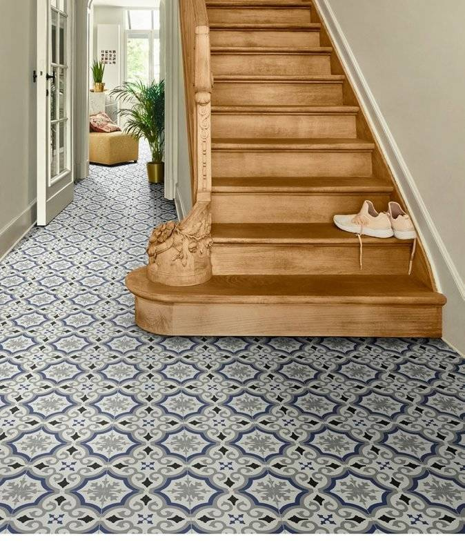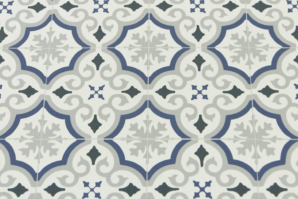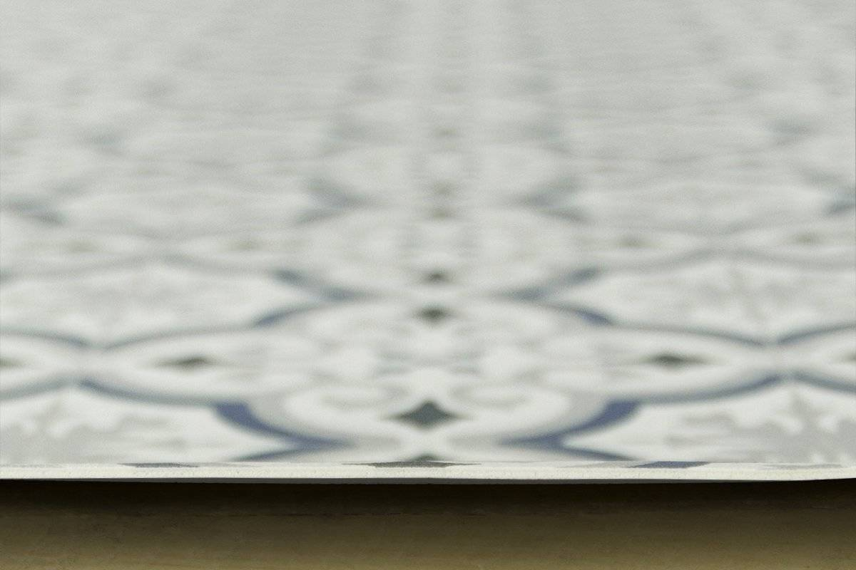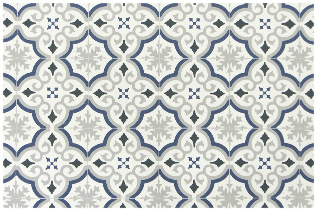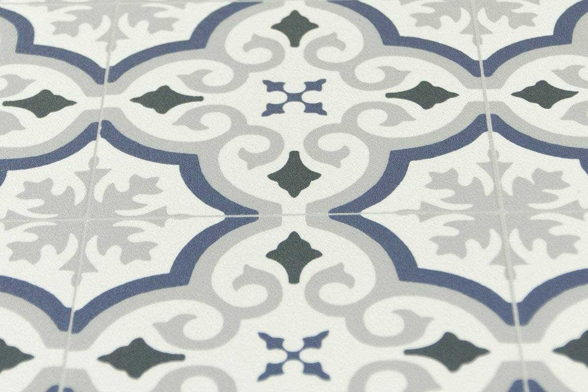 - Wykładzina PCV Texmark Evora imitacja płytek podłogowych w modnym iberyjskim wzorze w odcieniach niebieskiego i szarościach.
