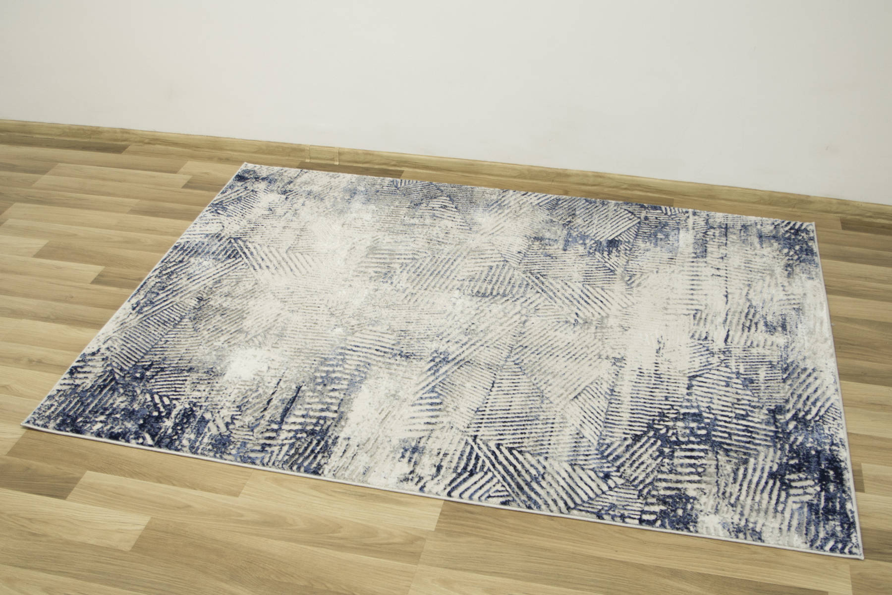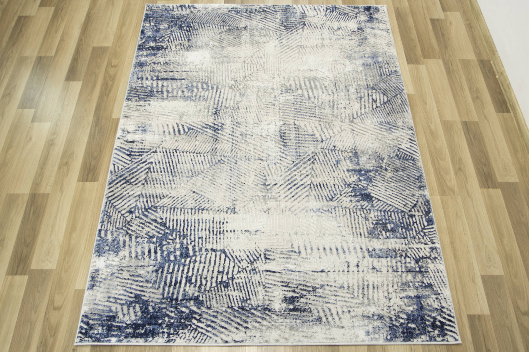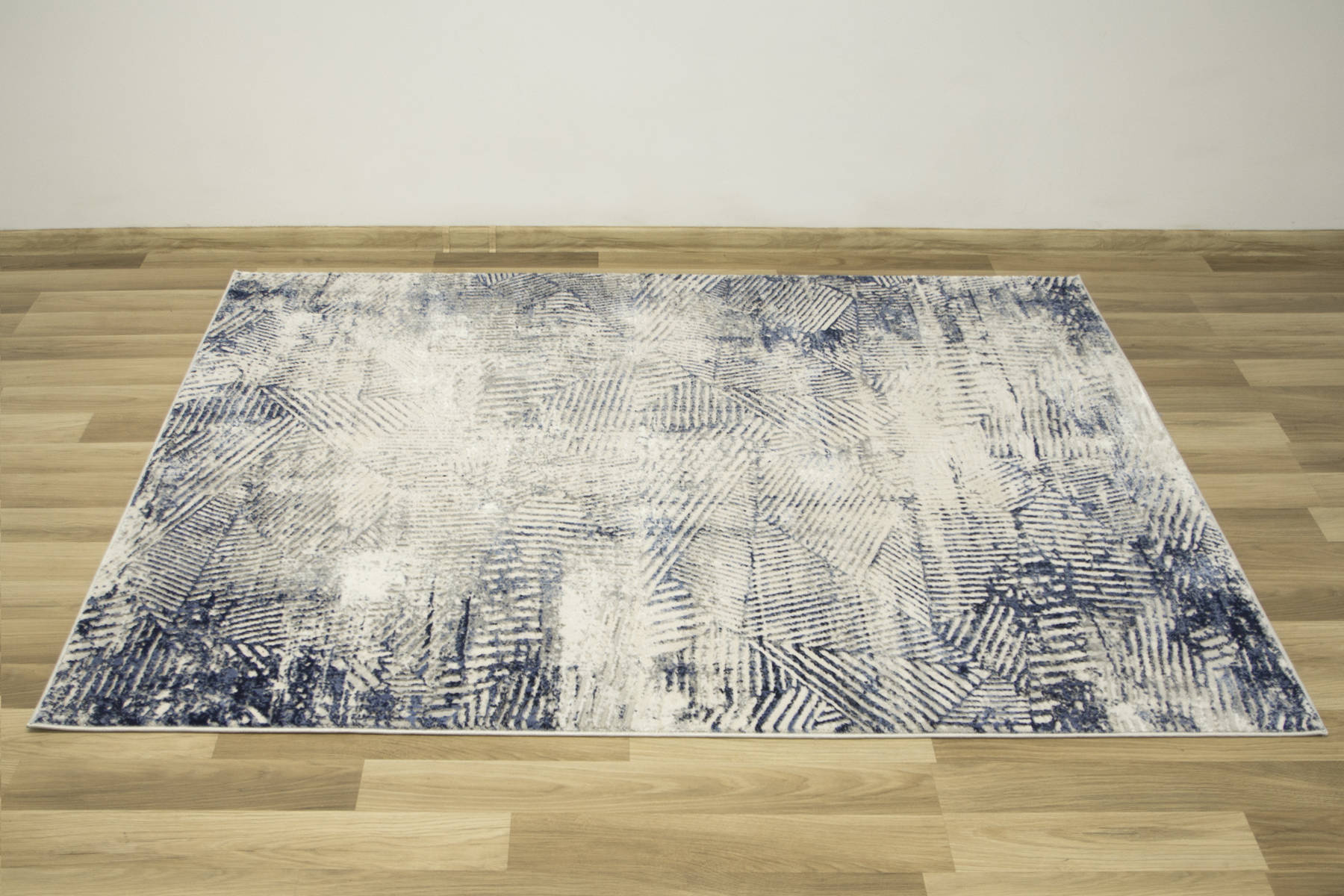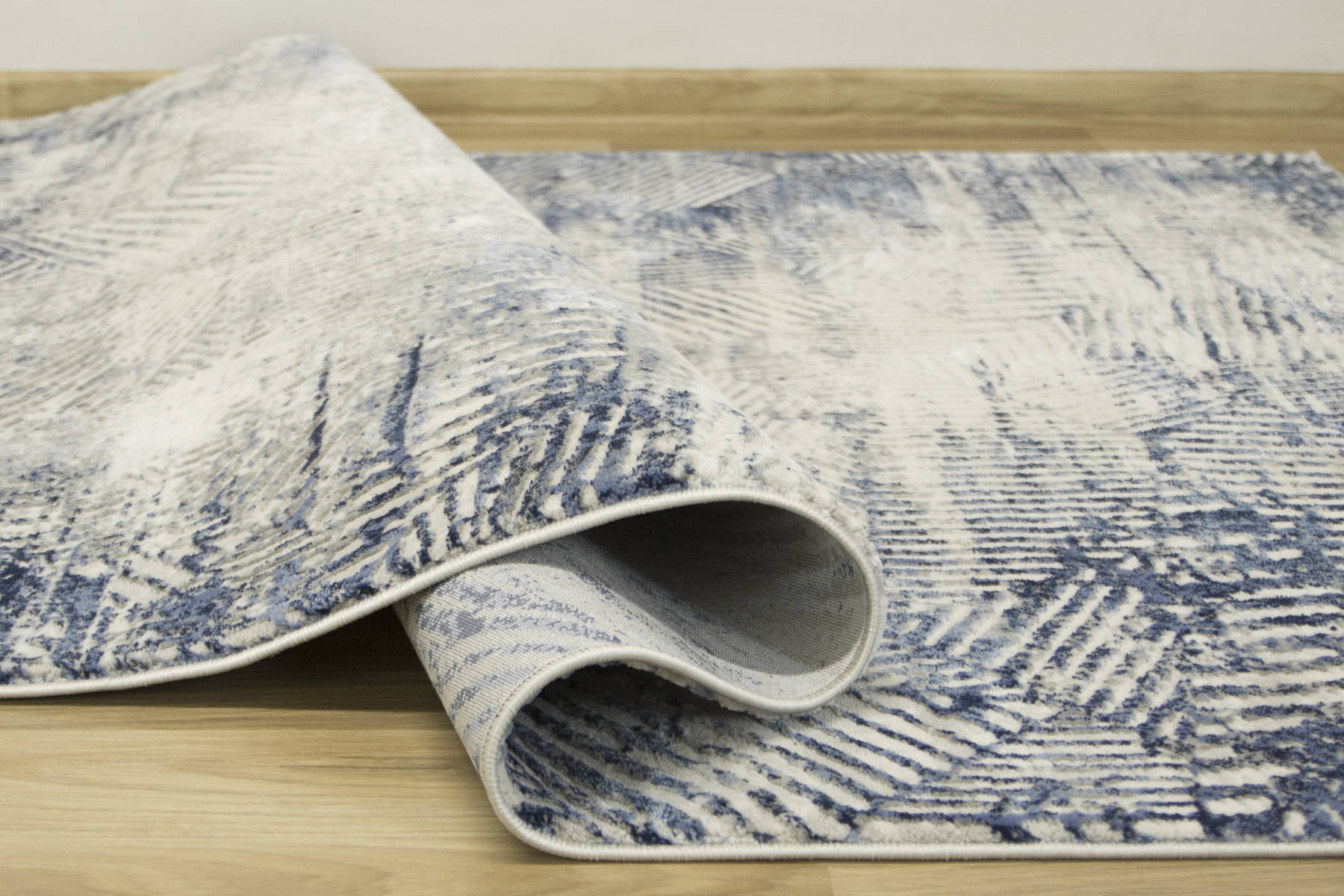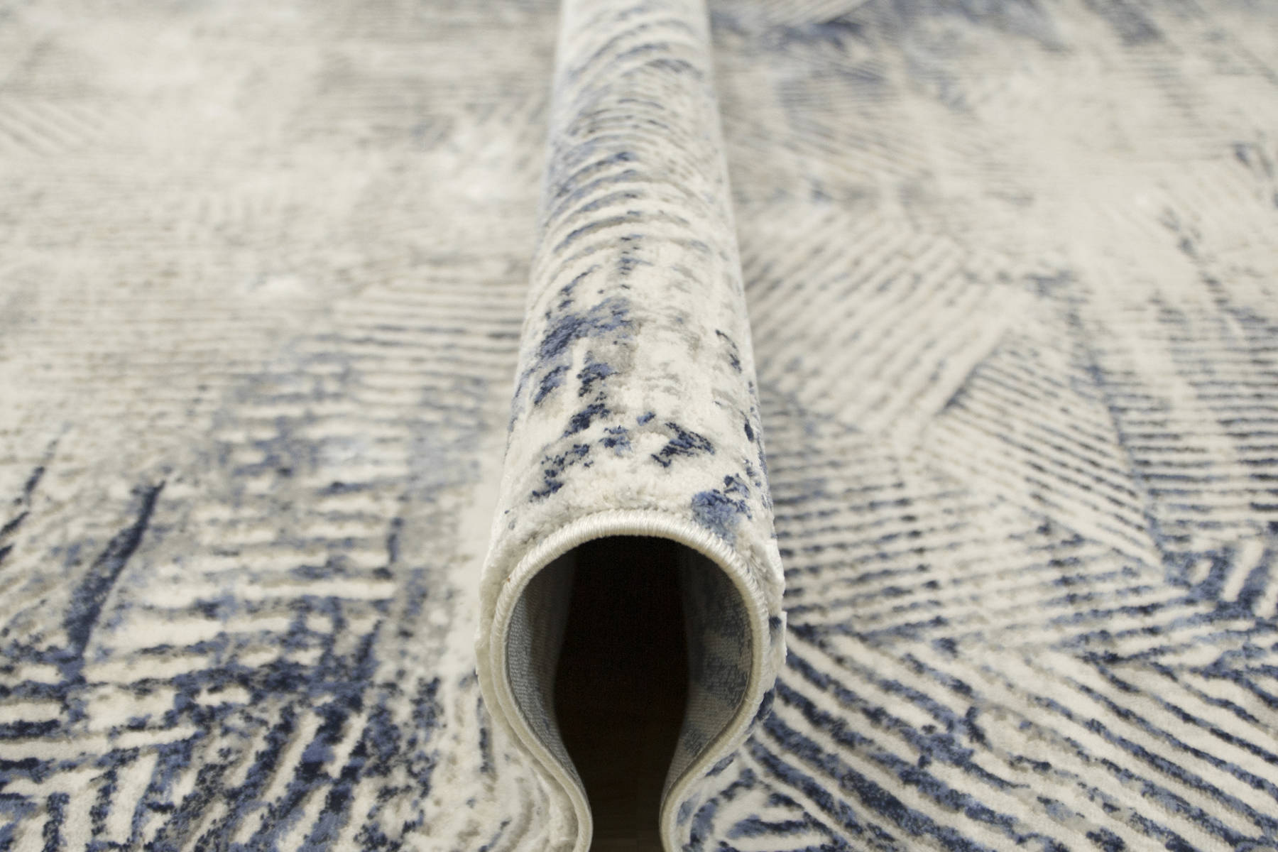 • Nowoczesny, luksusowy dywan Verano o mięciutkim, lekko lśniącym, dwupoziomowym runie z abstrakcyjnym wzorem w odcieniach niebieskiego, granatu, szarości, beżu i kremu, ze spodem wykończonym bawełną