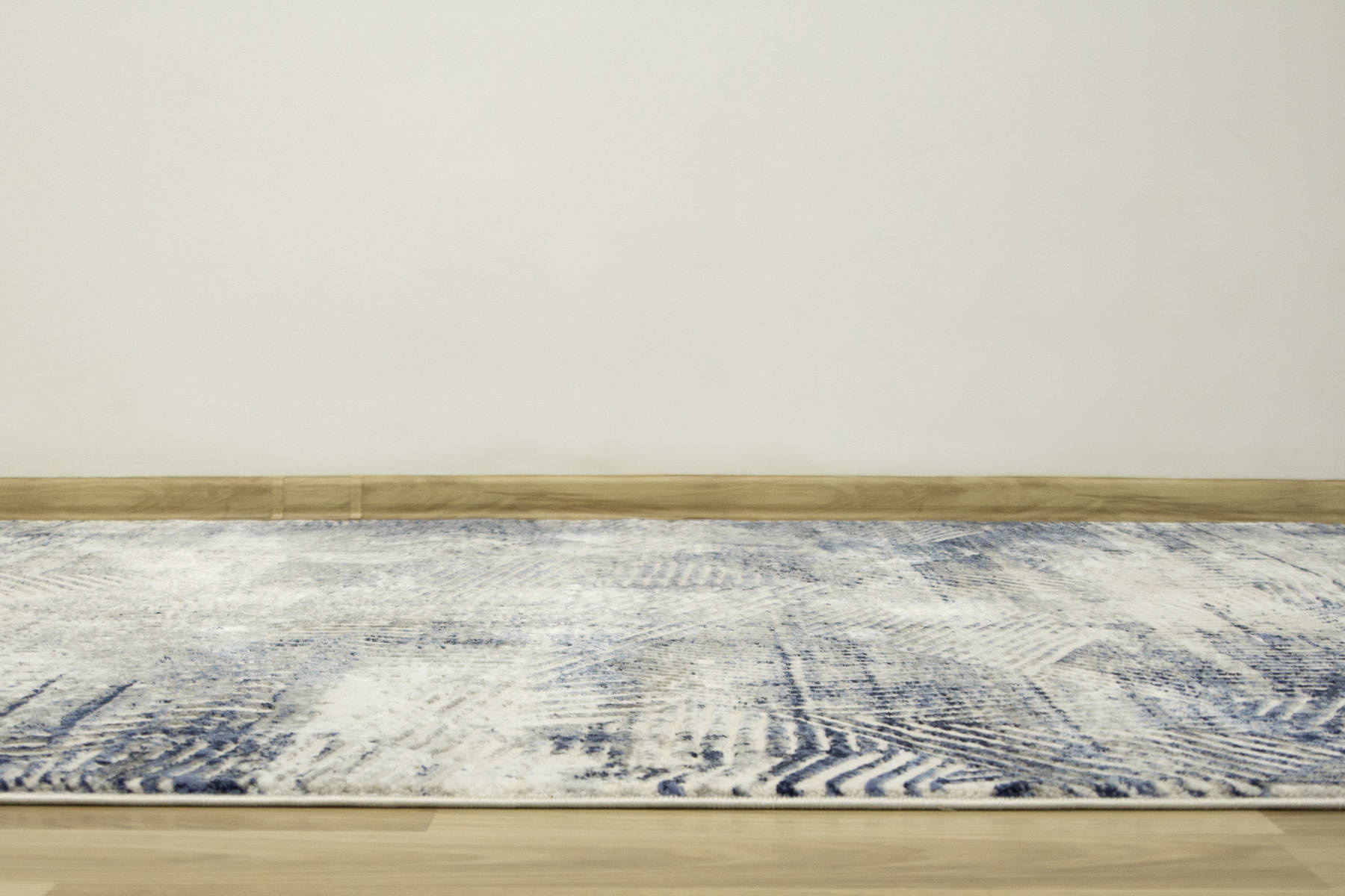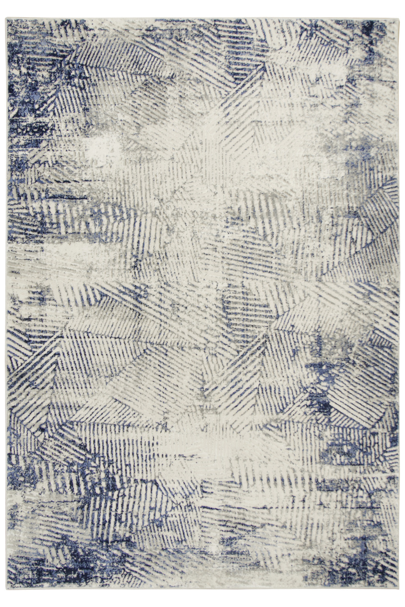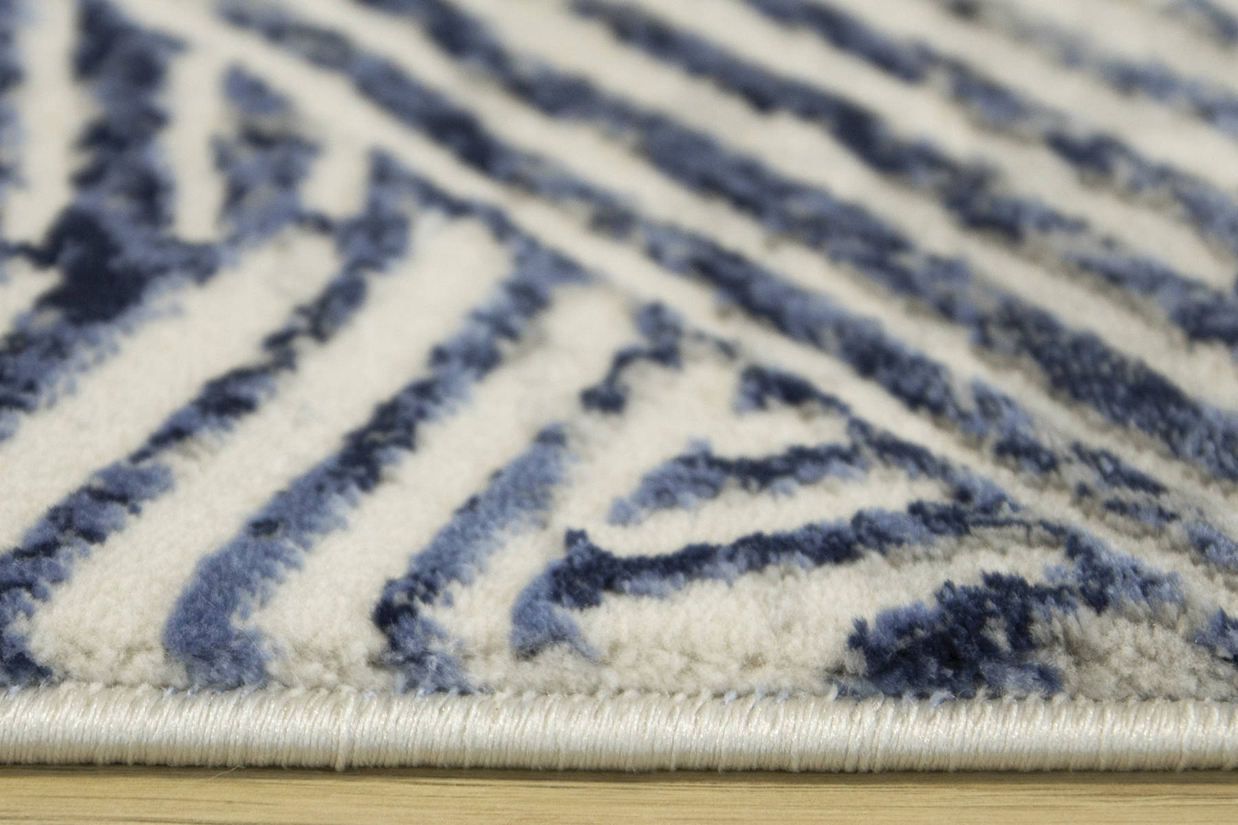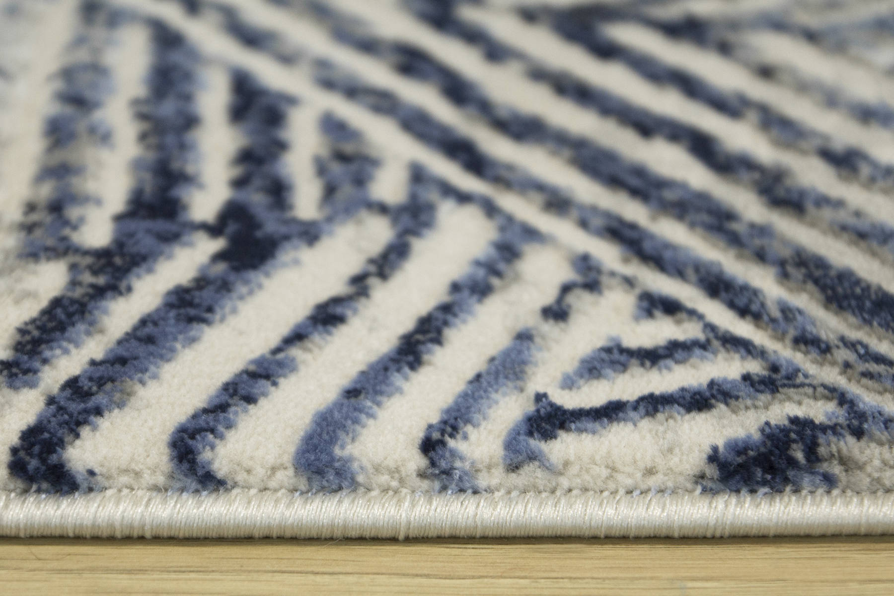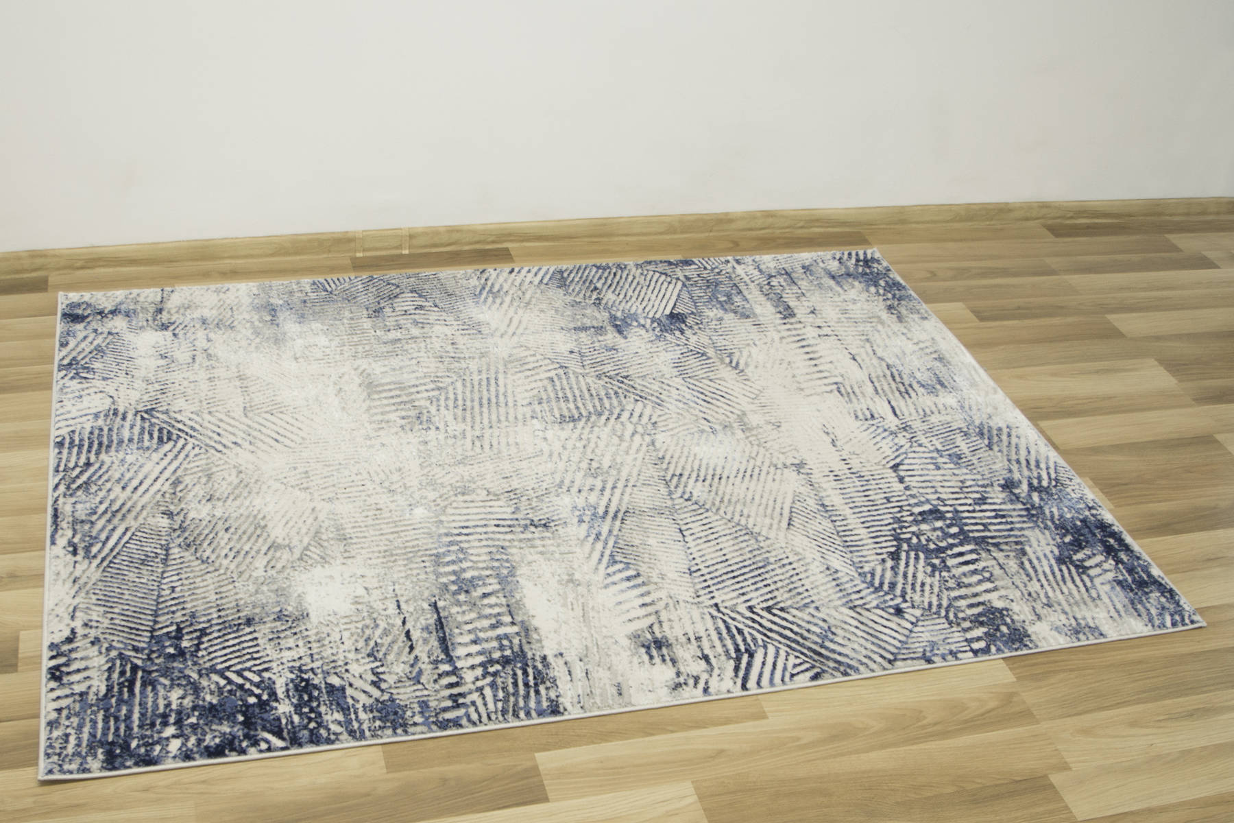 • Nowoczesny, luksusowy dywan Verano o mięciutkim, lekko lśniącym, dwupoziomowym runie z abstrakcyjnym wzorem w odcieniach niebieskiego, granatu, szarości, beżu i kremu, ze spodem wykończonym bawełną