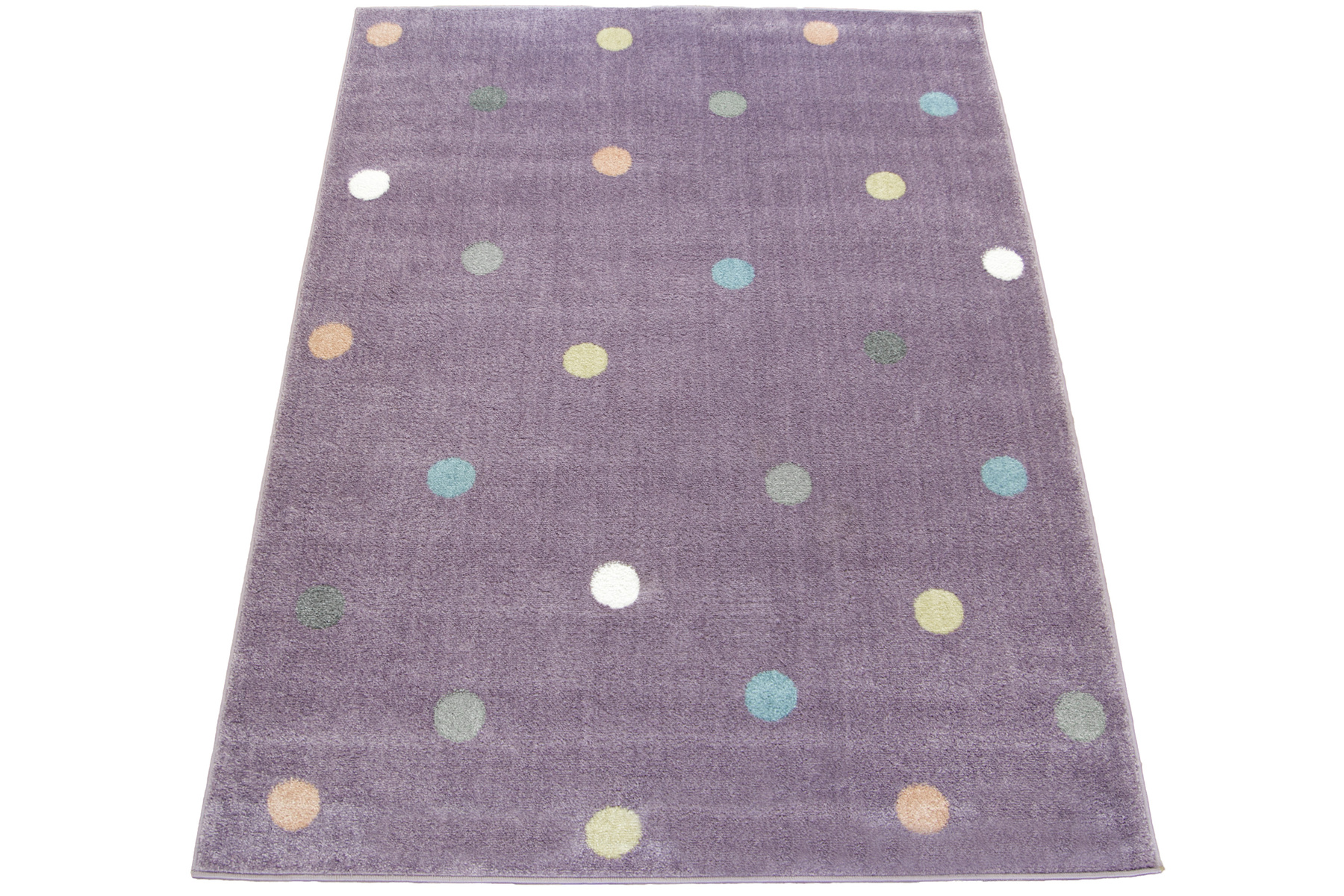 • Dywan dziecięcy Lima z wzorem w kropki w odcieniach fioletu, różu, turkusu, żółci, szarości i kremu.