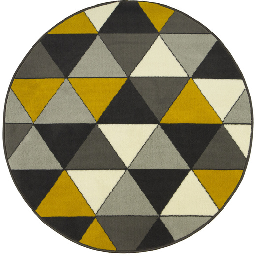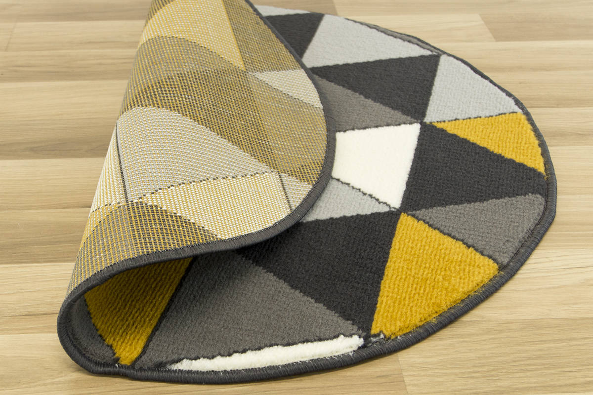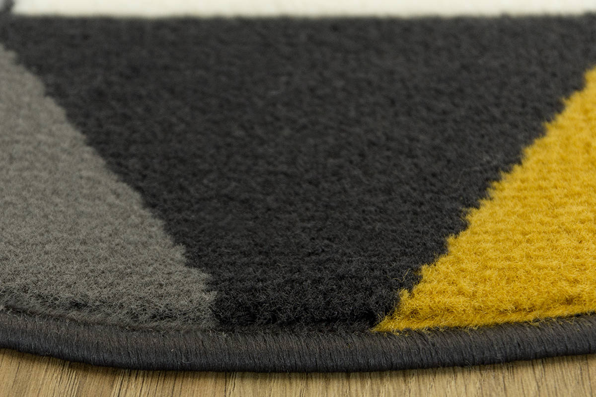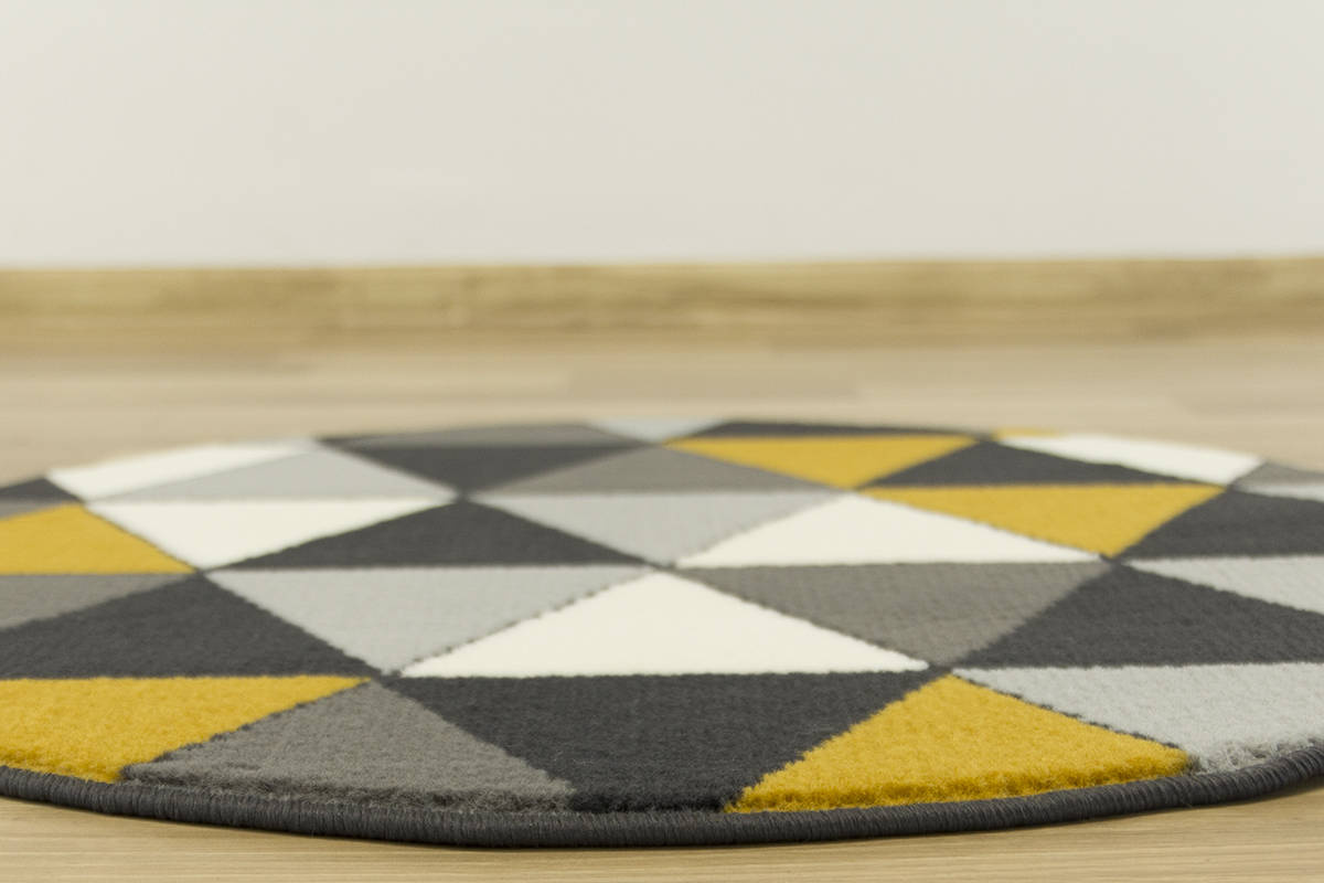• Nowoczesny dywan okrągły Luna z geometrycznym wzorem w trójkąty w odcieniach miodowej żółci, kremu i szarości