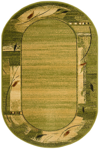 - Owalny dywan Agnella Erba Chrom z nowoczesnym wzorem w odcieniach oliwkowej zieleni beżu, z dodatkiem czerni z obszyciem w odcieniu zieleni.
