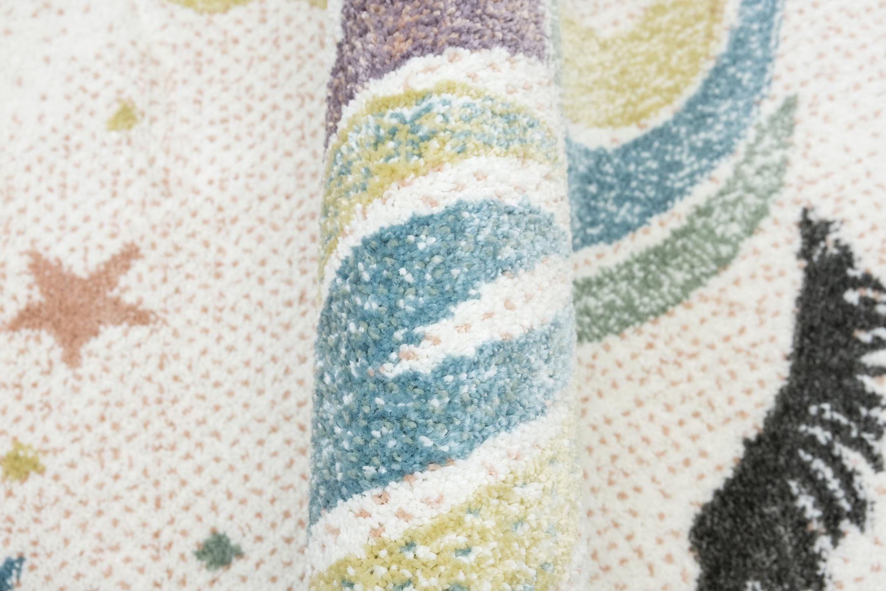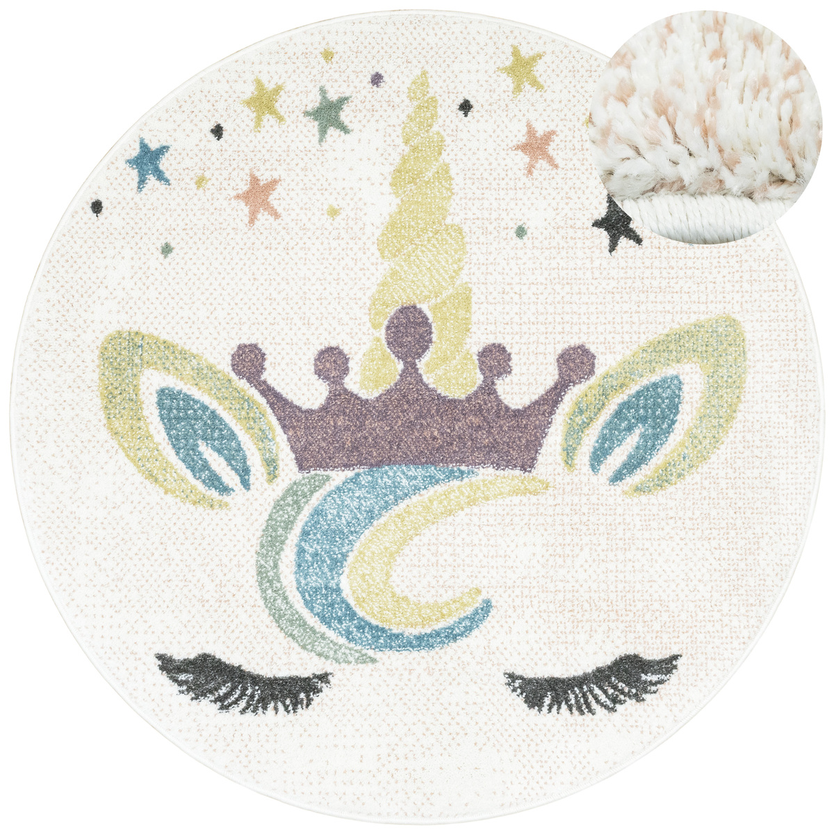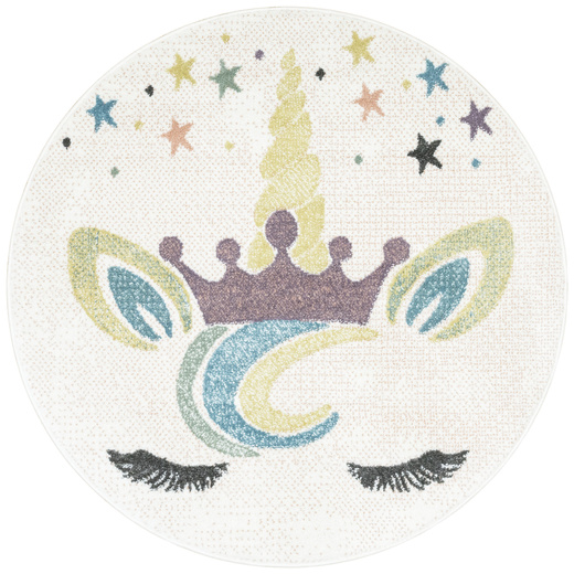 - Okrągły dywan dziecięcy Lima z rysunkowym melanżowym wzorem jednorożca w odcieniach grafitu, żółtego, fioletu, różu, turkusu, oliwkowej zieleni i kremu.