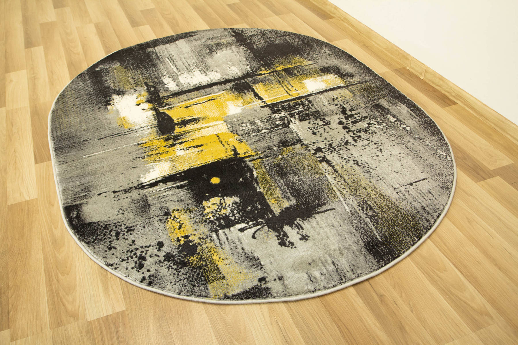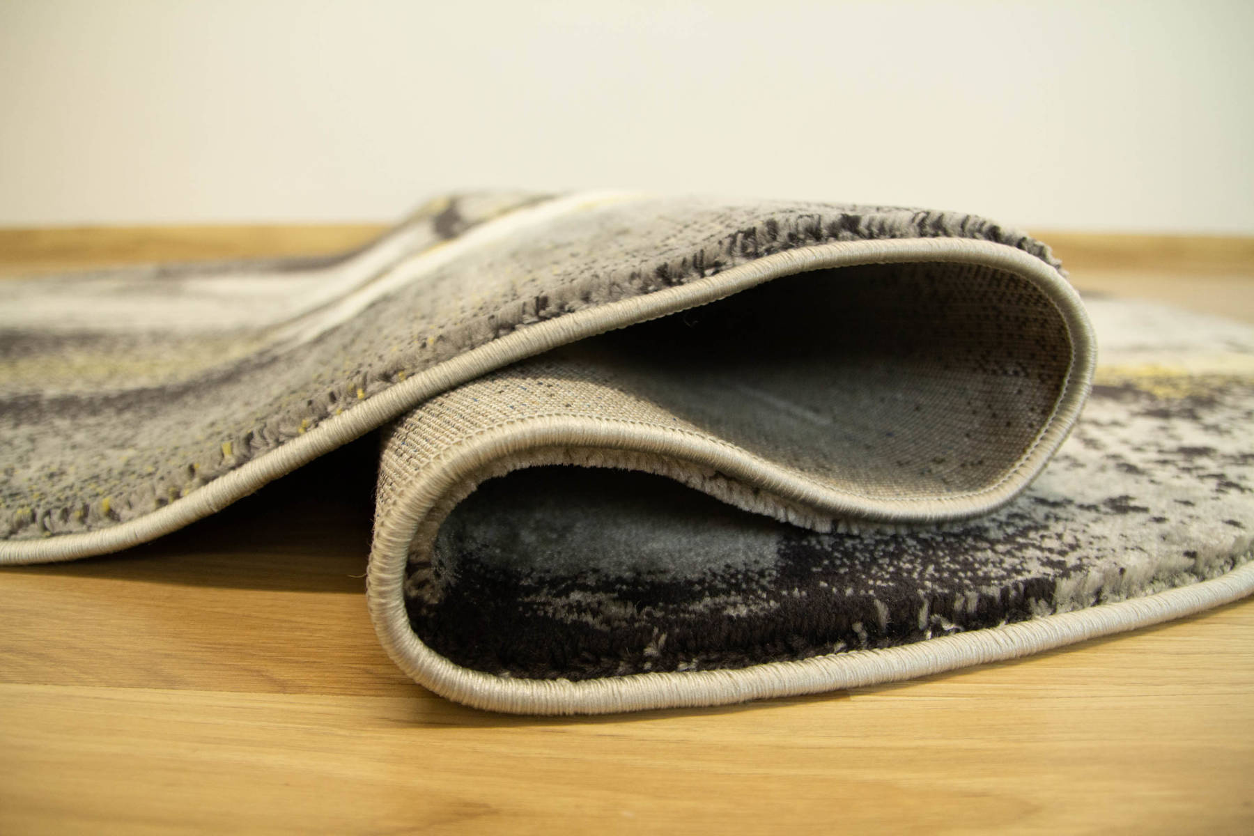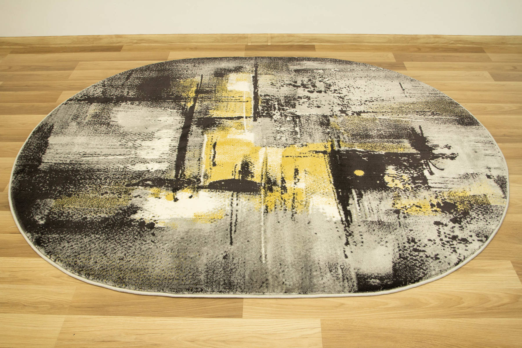 • Owalny, luksusowy dywan Victoria o mięciutkim, lekko lśniącym runie z abstrakcyjnym wzorem w odcieniach, szarości, żółci, szarości i kremu, z akcentami w czerni ze spodem wykończonym jutą