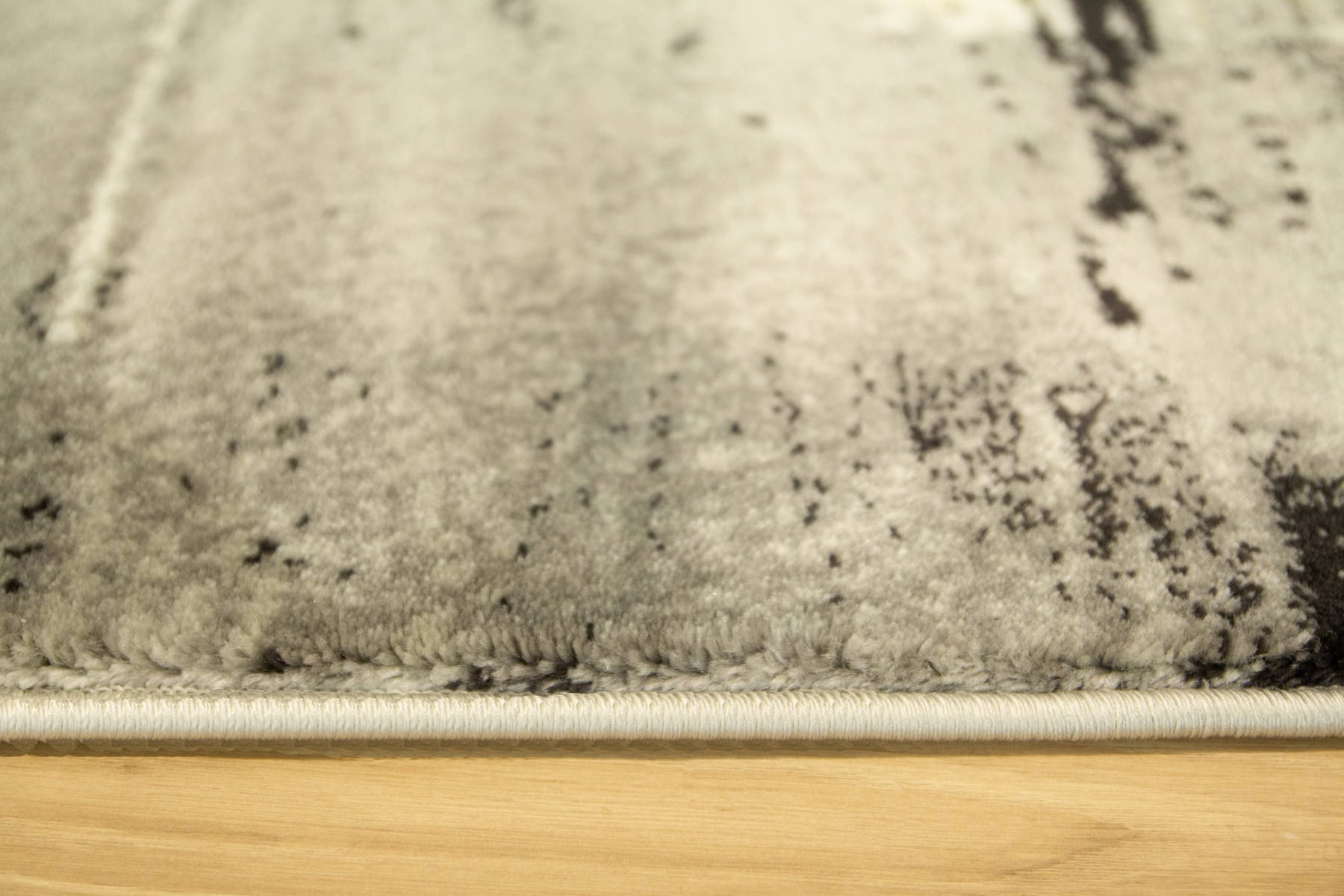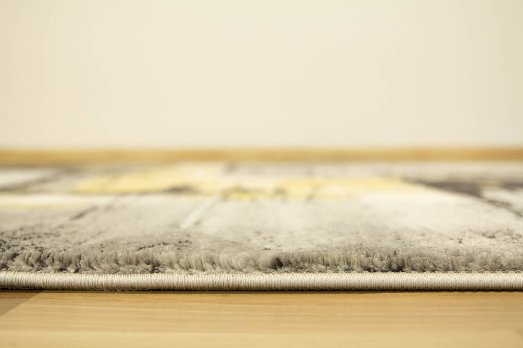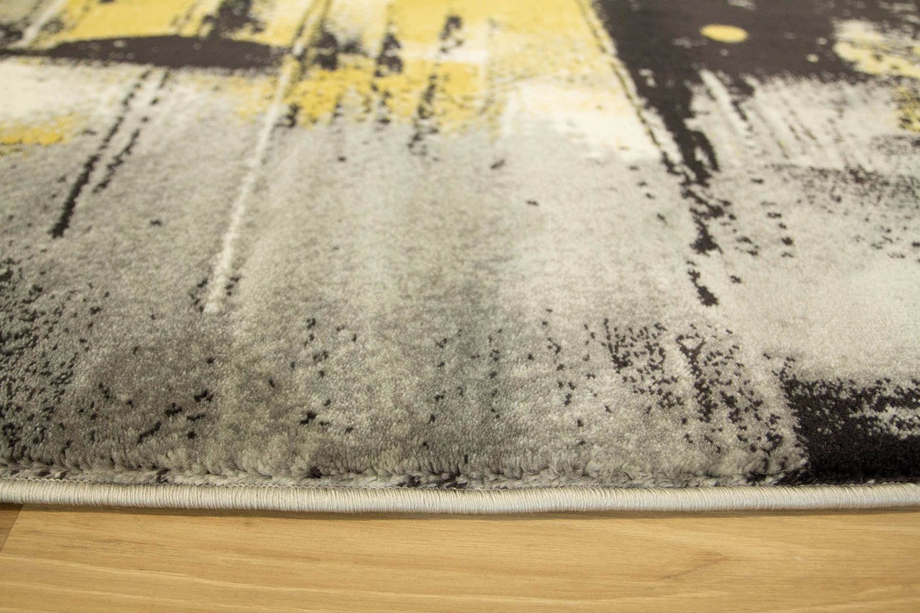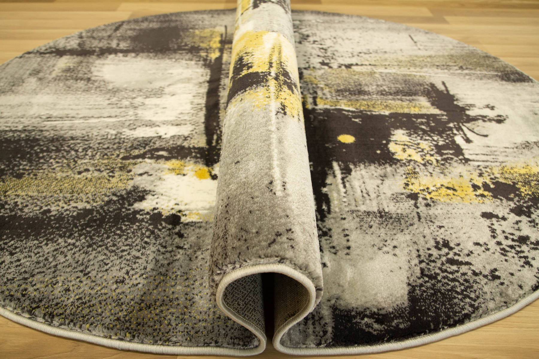 • Owalny, luksusowy dywan Victoria o mięciutkim, lekko lśniącym runie z abstrakcyjnym wzorem w odcieniach, szarości, żółci, szarości i kremu, z akcentami w czerni ze spodem wykończonym jutą