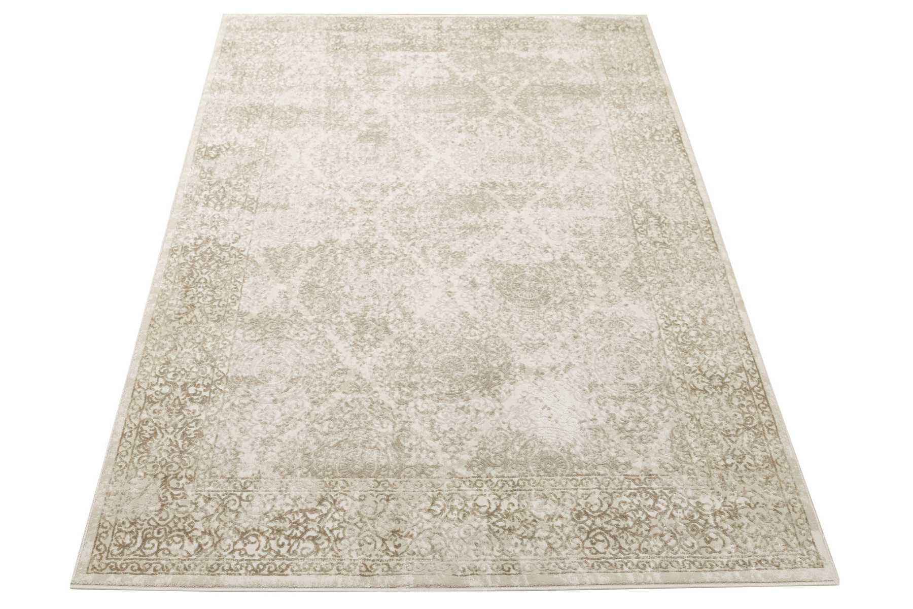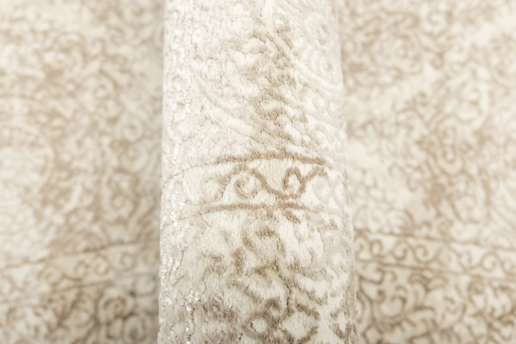 • Luksusowy, ekstrawagancki dywan z kolekcji Allora Plus o miękkim zbitym, dwupoziomowy runie w odcieniach beżu, szarości i kremu z misternym ornamentowym wzorem.