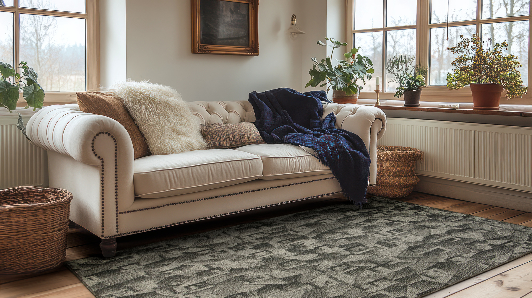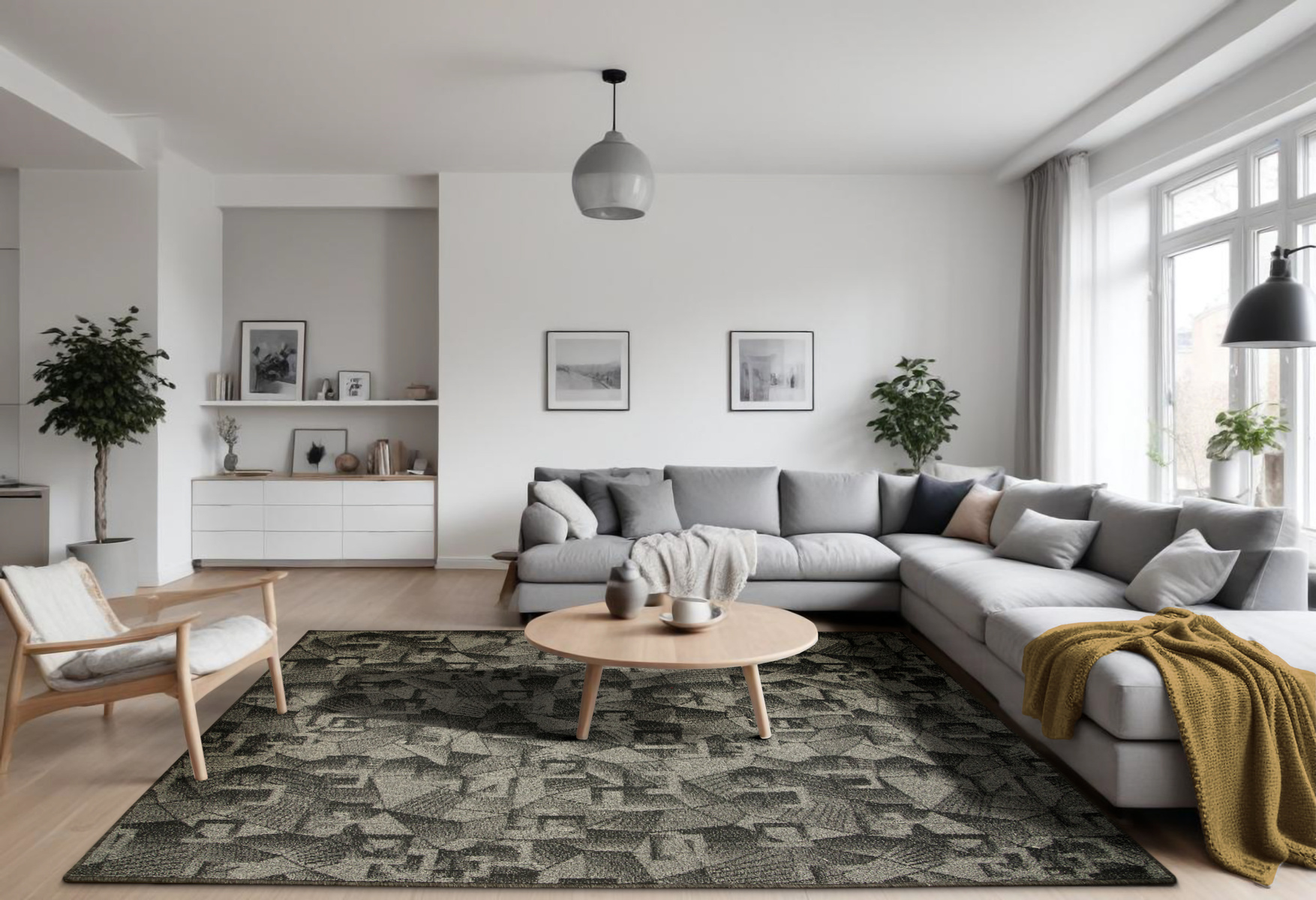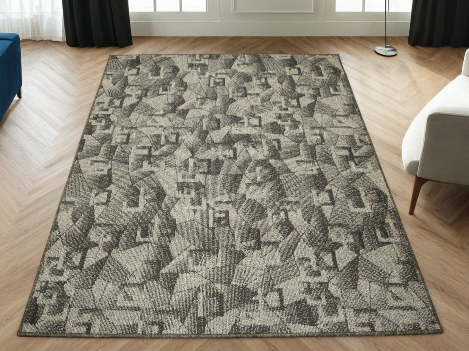 - Dywan wykonany z wykładziny pętelkowej Flamingo z runem w melanżu szarości i czerni, z geometrycznym wzorem oraz ze spodem wykończonym filcem