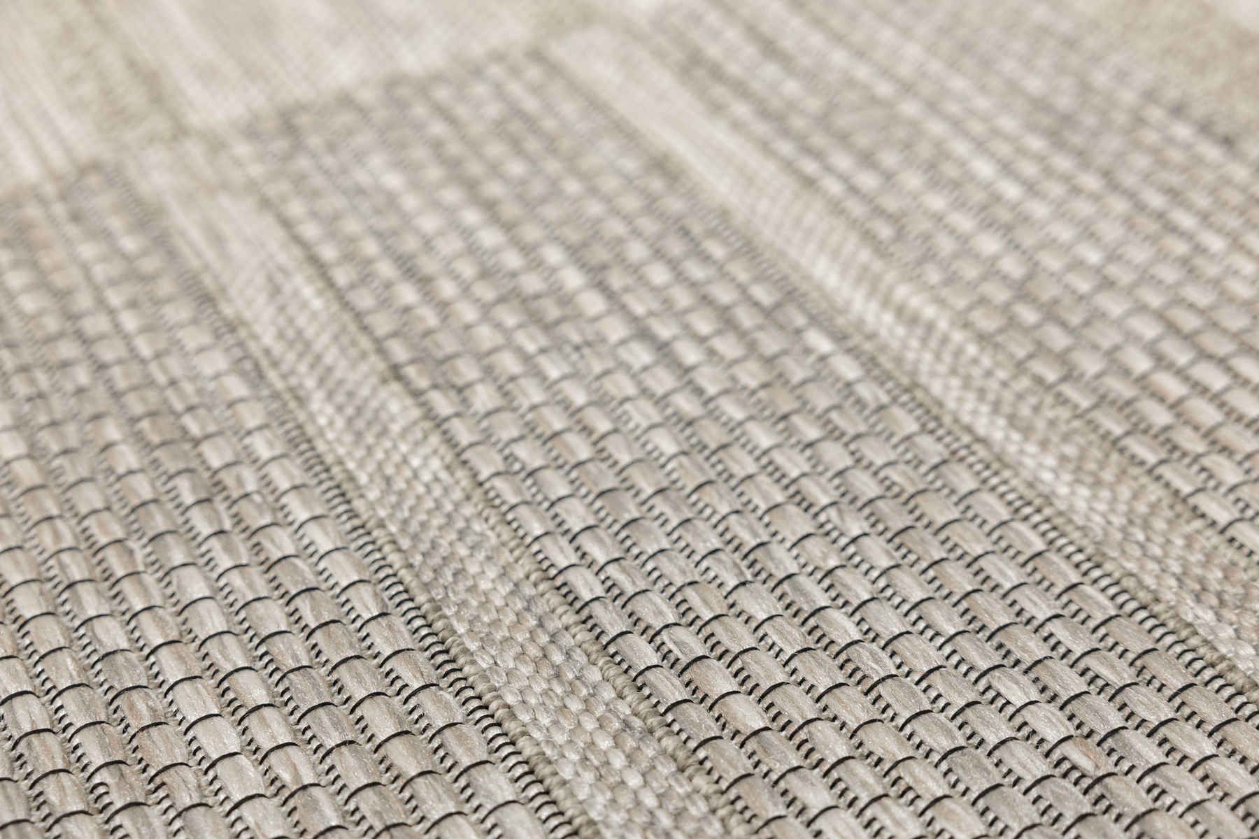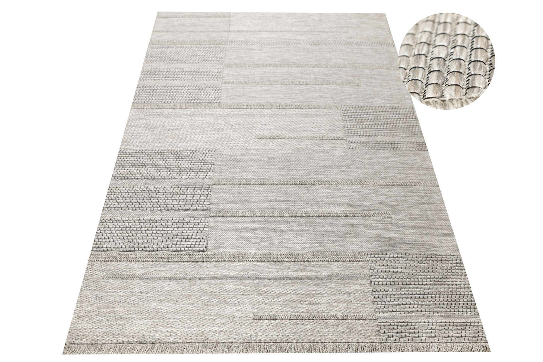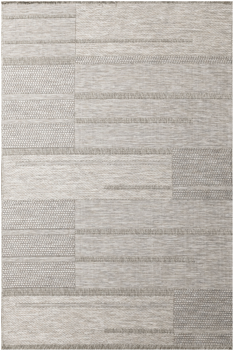 - Praktyczny, tkany na płasko, dywan sznurkowy Oria, o grubym splocie z geometrycznym wzorem w prostokąty w odcieniach, beżu, szarości oraz akcentem czerni zakończony delikatnymi frędzelkami.