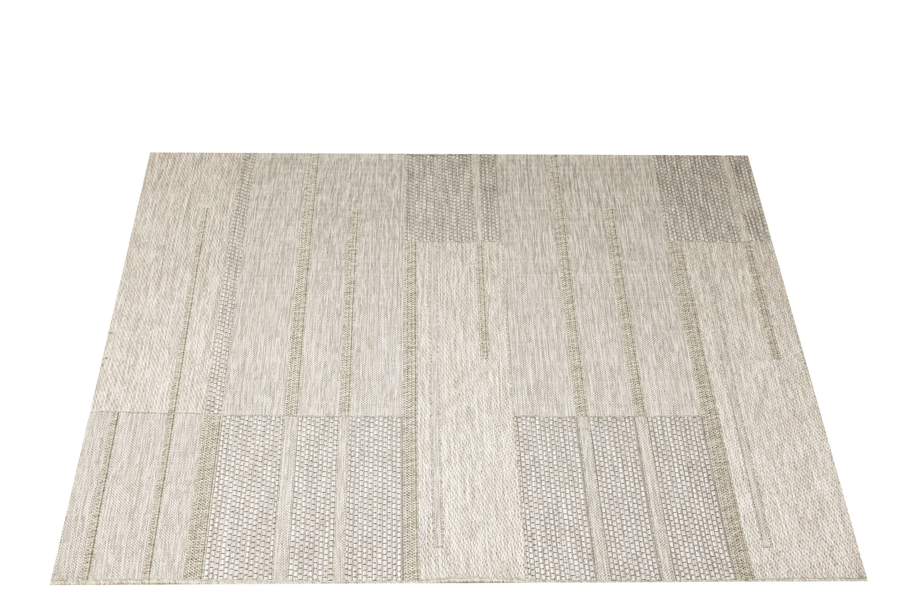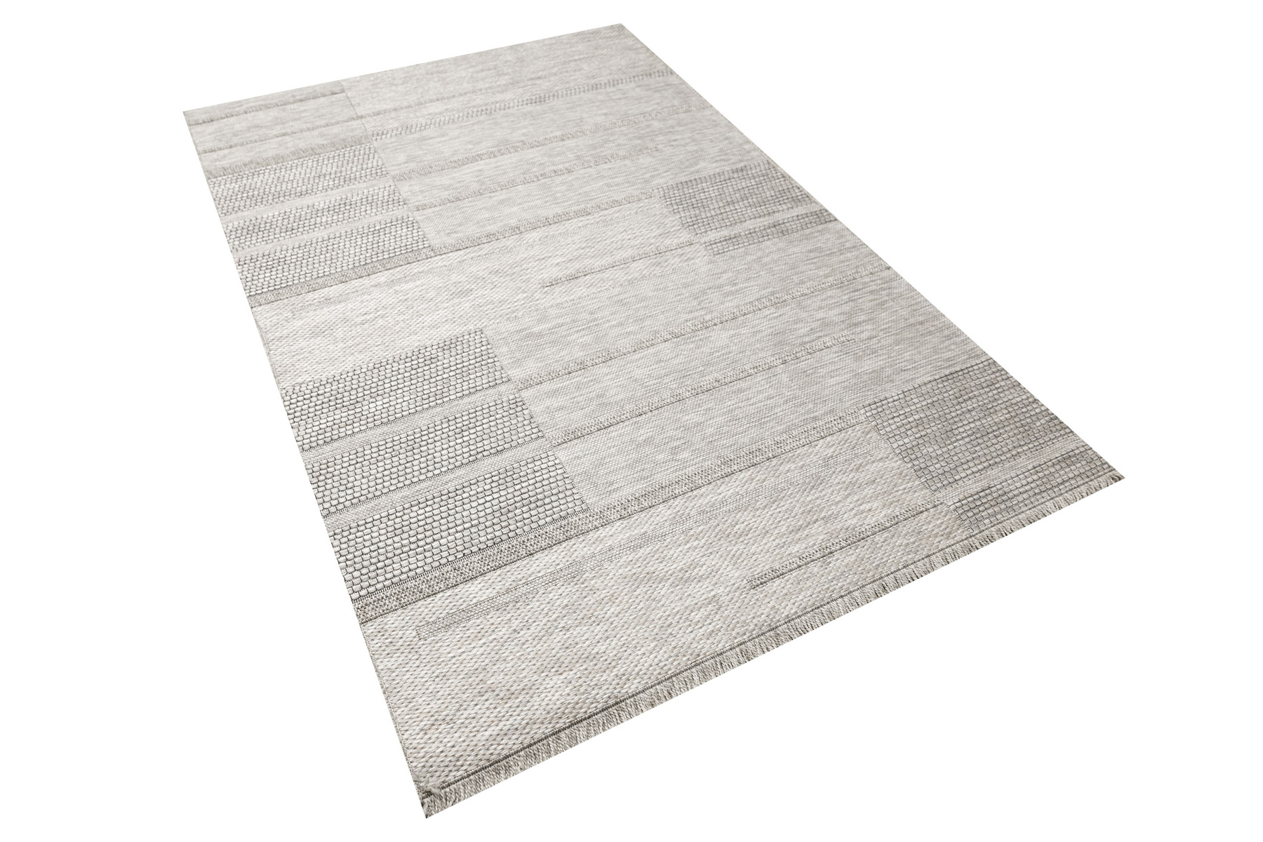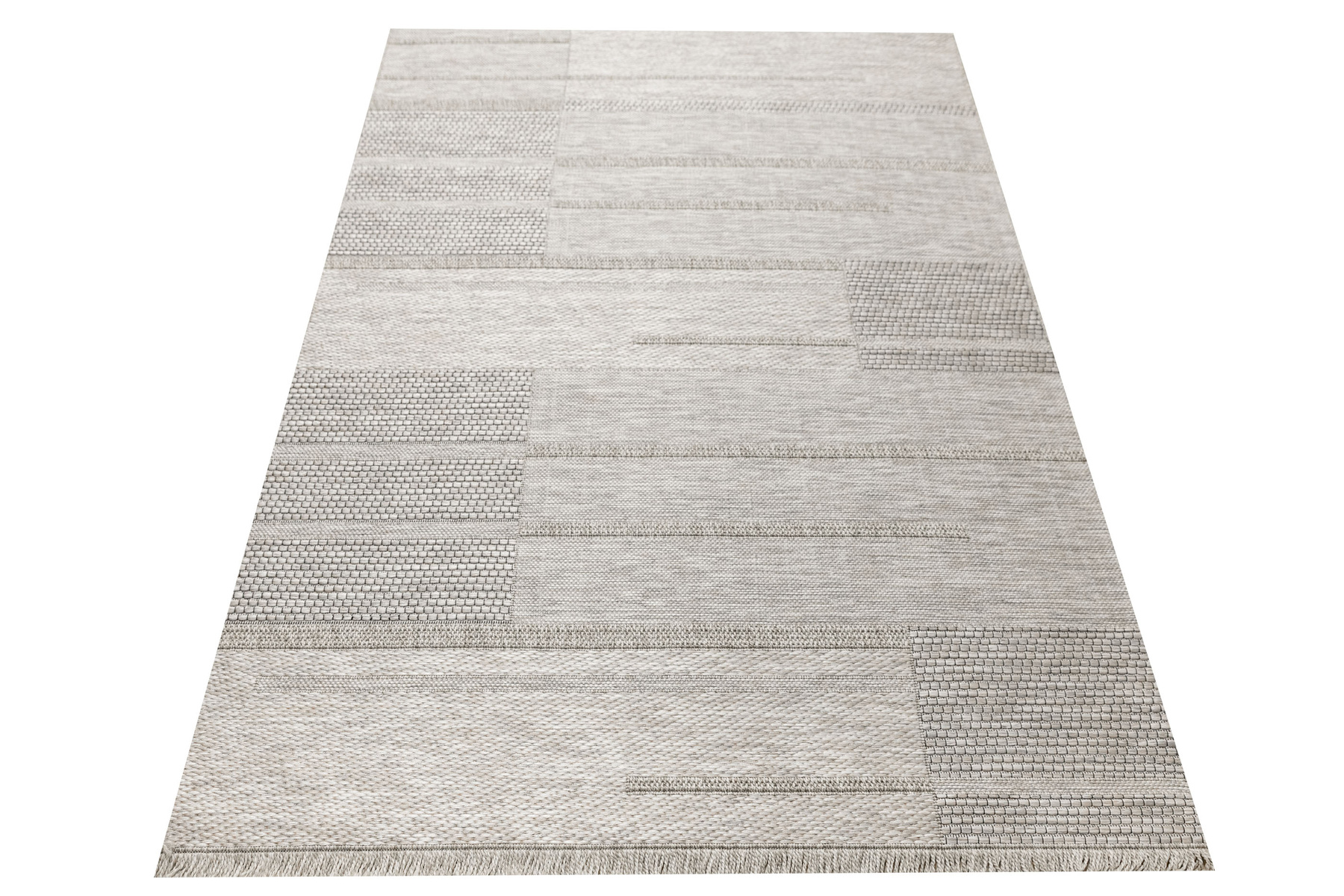 - Praktyczny, tkany na płasko, dywan sznurkowy Oria, o grubym splocie z geometrycznym wzorem w prostokąty w odcieniach, beżu, szarości oraz akcentem czerni zakończony delikatnymi frędzelkami.