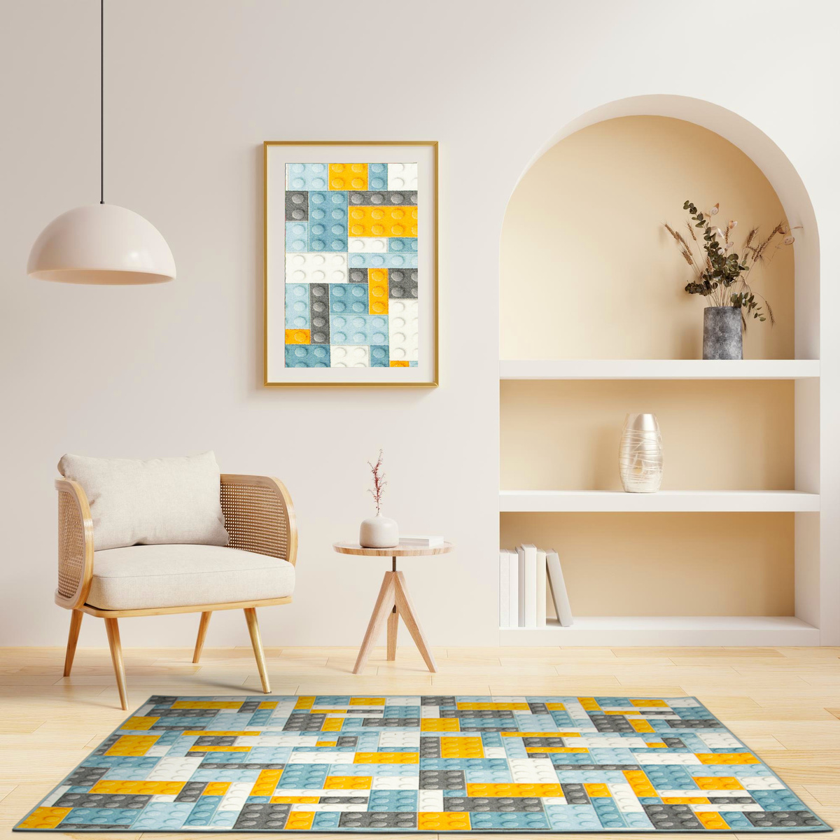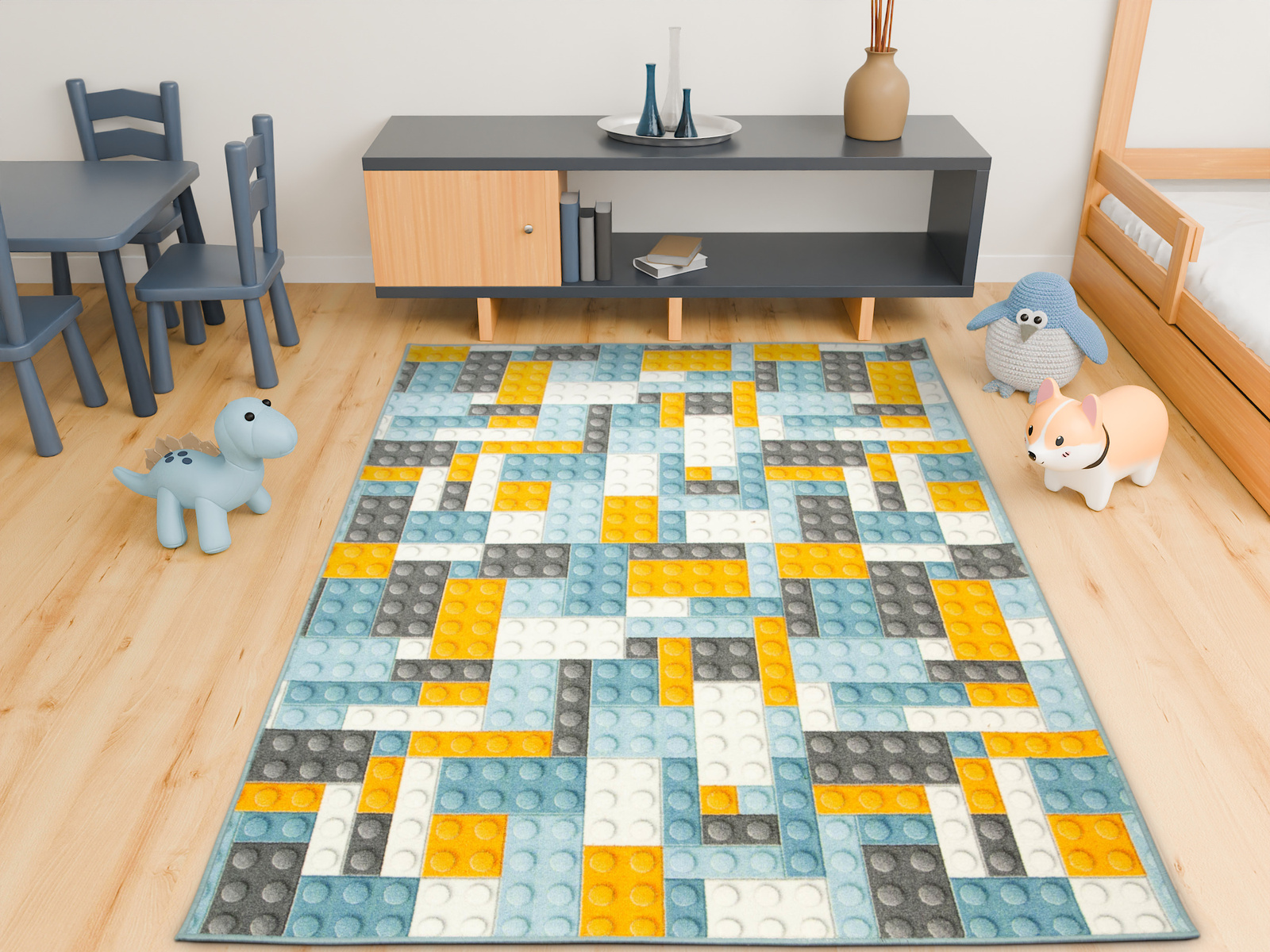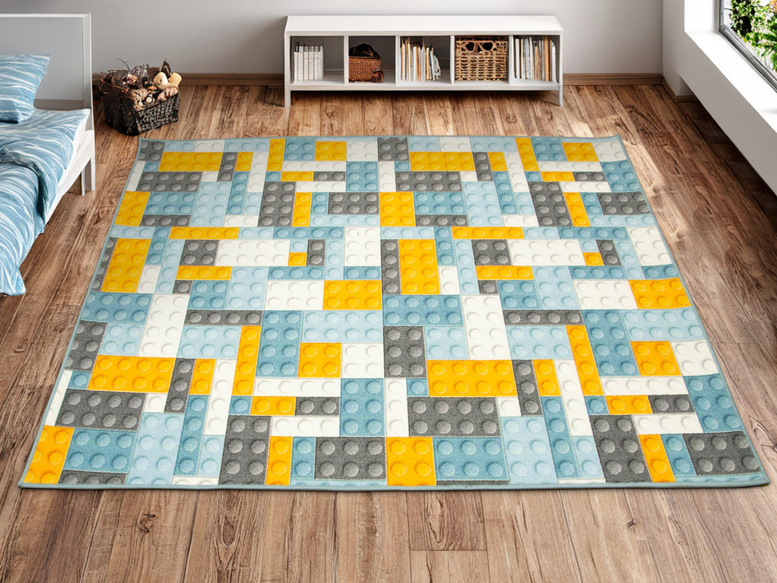 - Kolorowa wykładzina dziecięca Klocki z kolorowym, edukacyjnym wzorem, wytrzymałym poliamidowym runem pętelkowym, spodem wykończonym filcem.