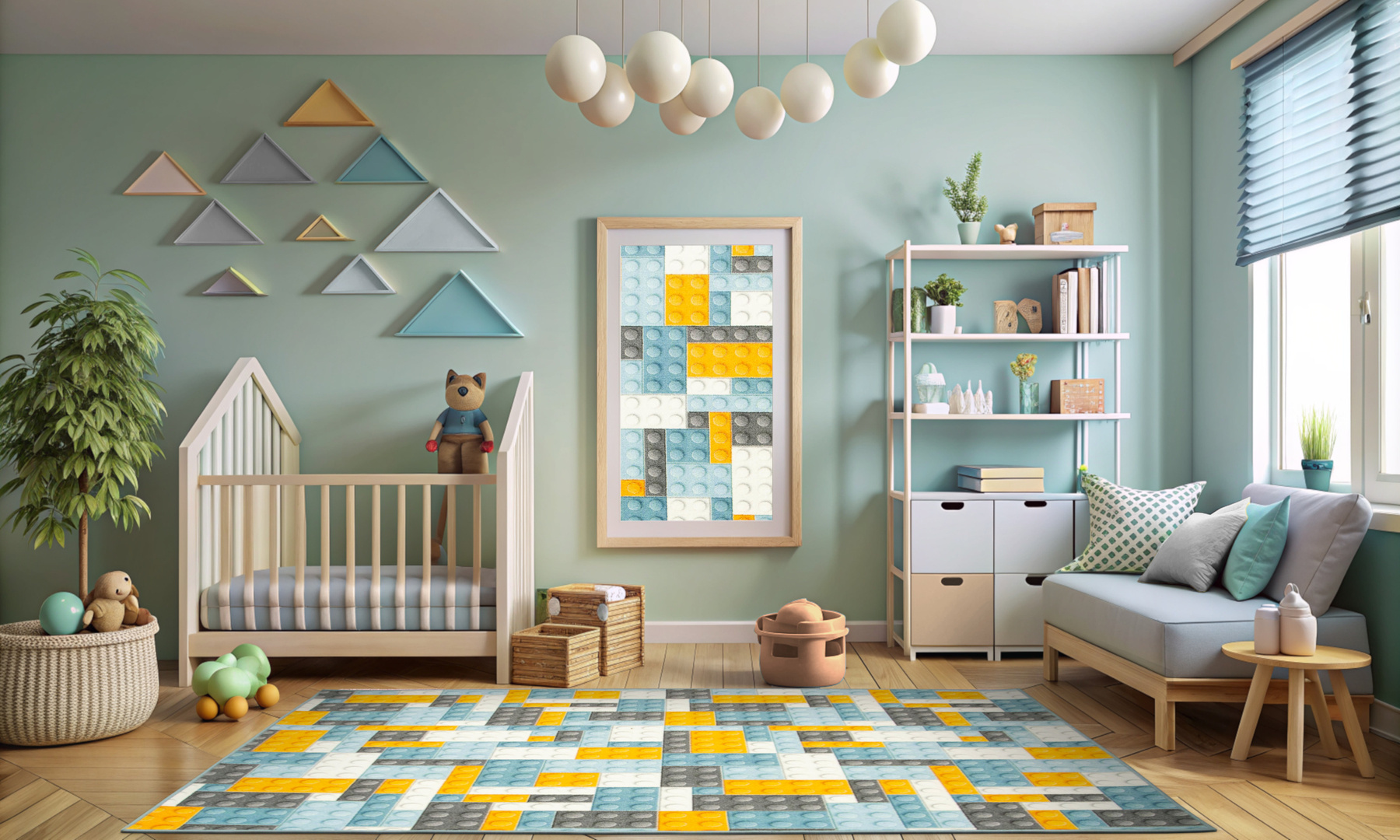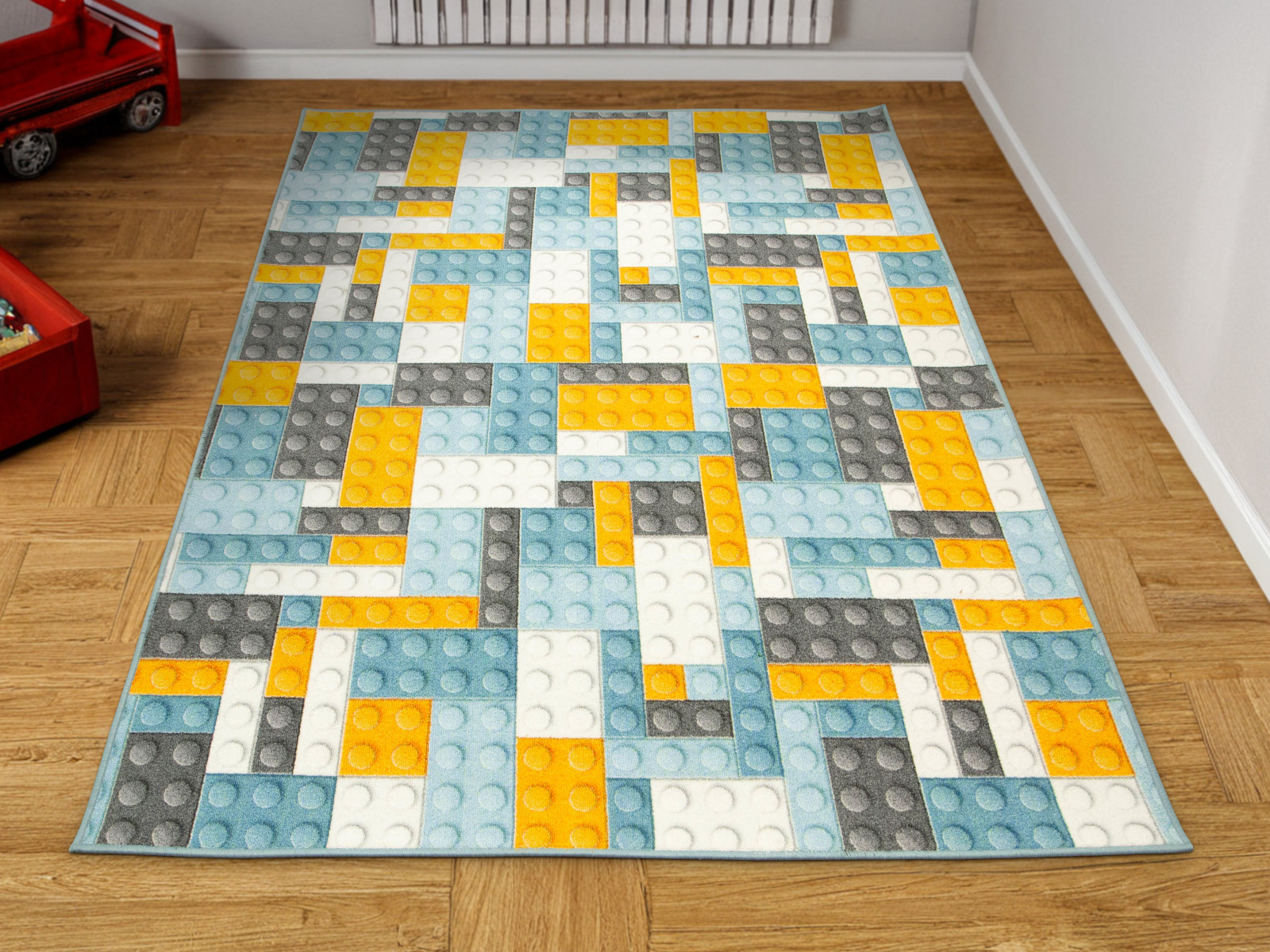 Dywan dziecięcy o wyjątkowym wzorze inspirowanym klockami to doskonały element wyposażenia pokoju najmłodszych.