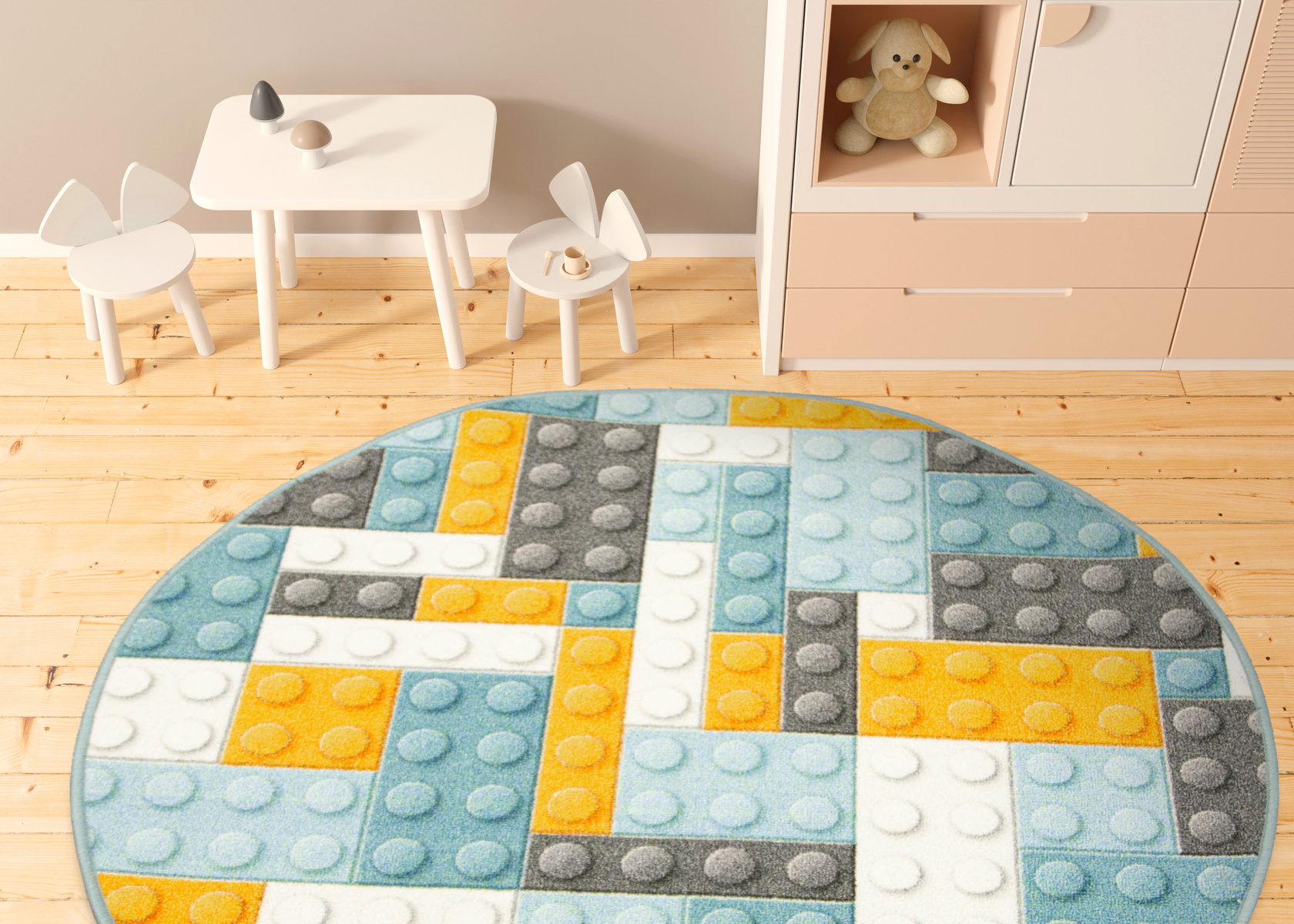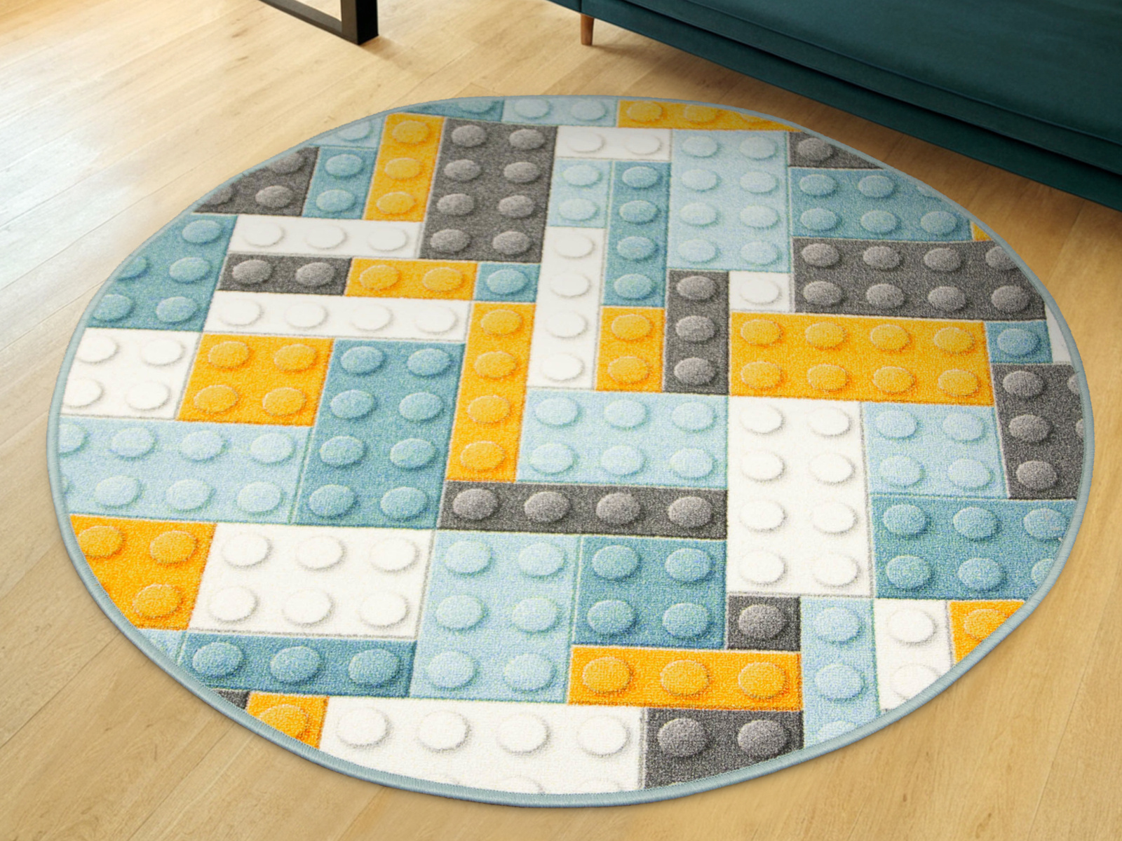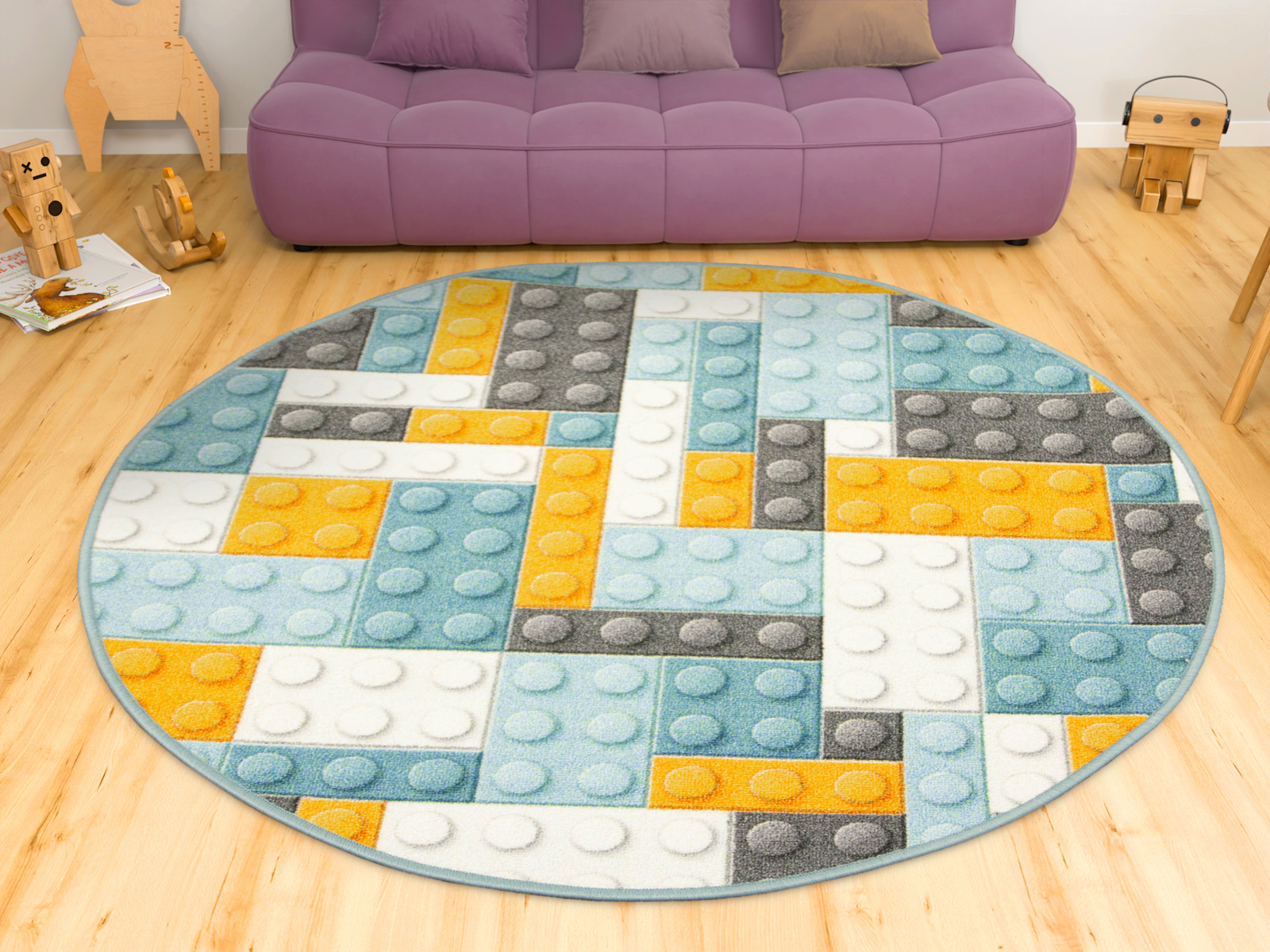 • Okrągły kolorowy dywan z wykładziny dziecięcej ze wzorem w klocki w odcieniach niebieskiego, pomarańczu, szarości, żółtego i kremu oraz spodem wykończonym filcem.