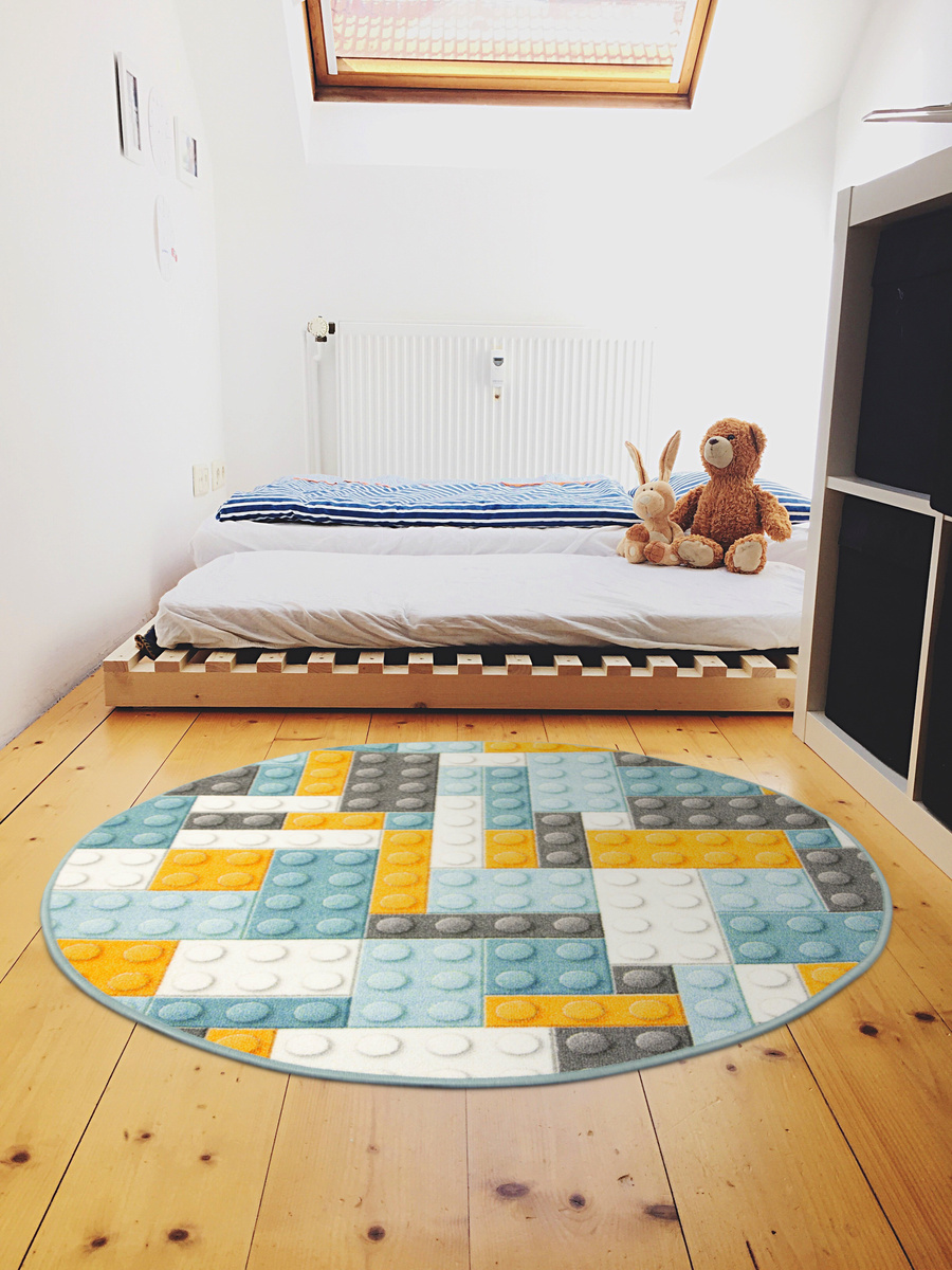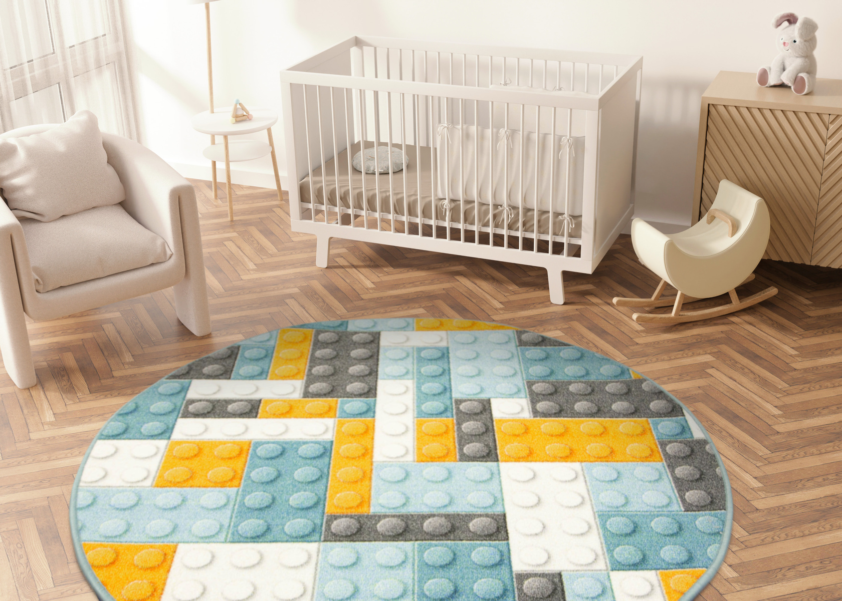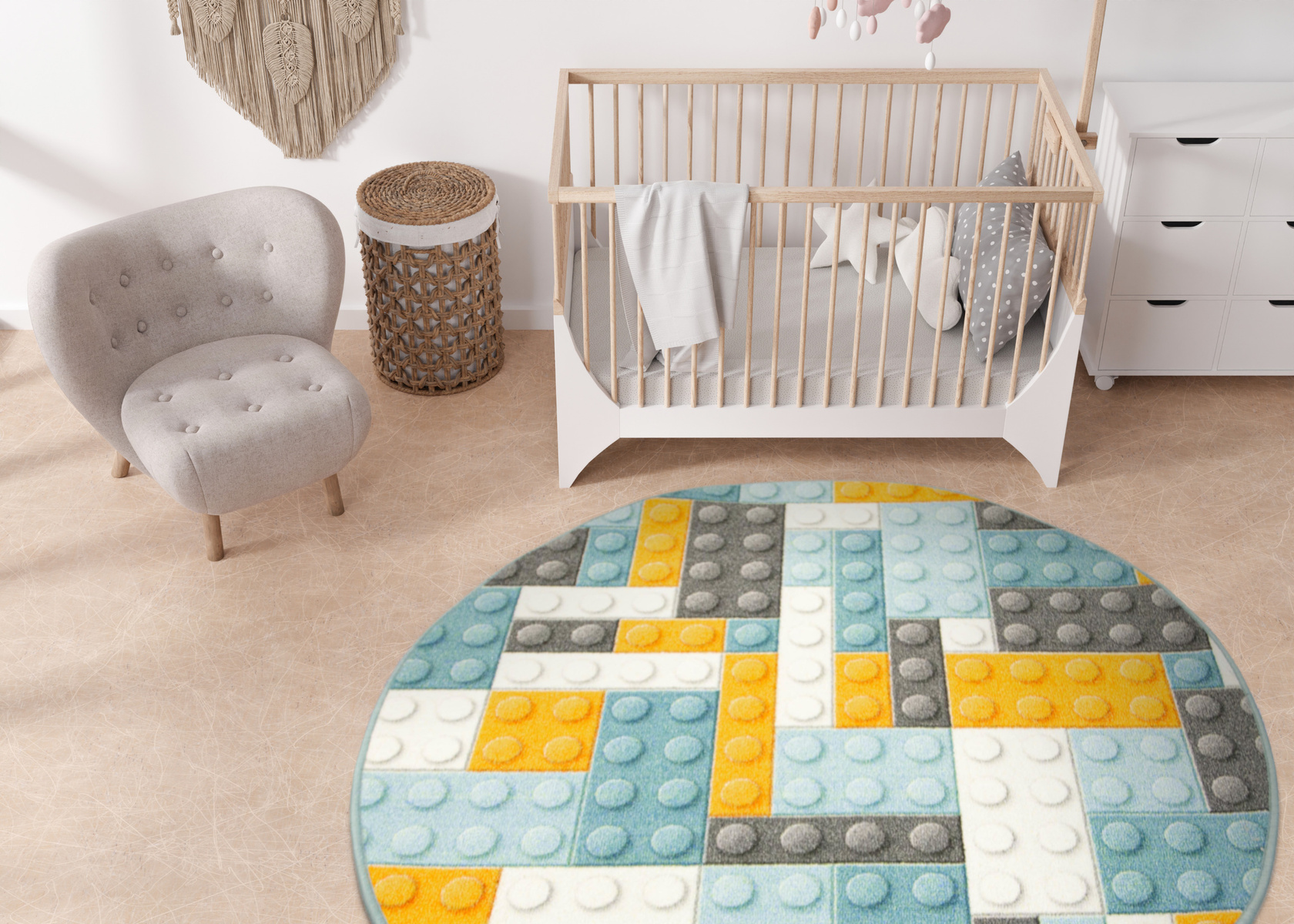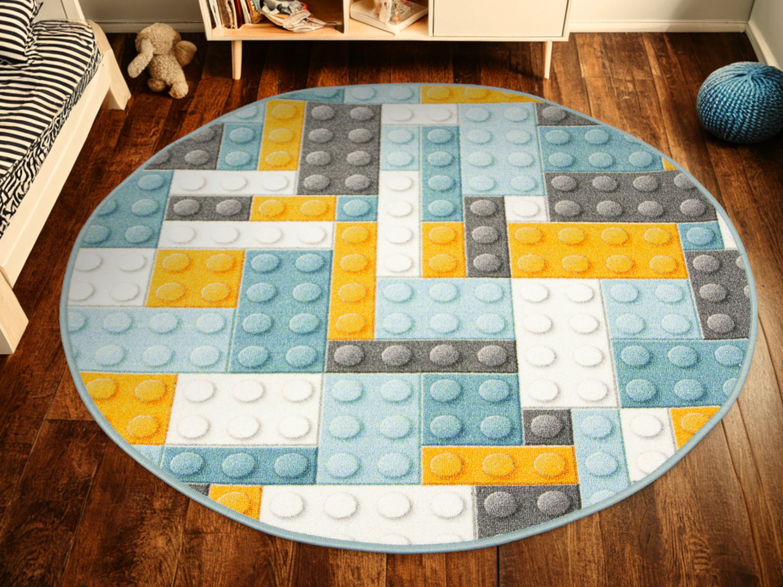 • Okrągły kolorowy dywan z wykładziny dziecięcej ze wzorem w klocki w odcieniach niebieskiego, pomarańczu, szarości, żółtego i kremu oraz spodem wykończonym filcem.