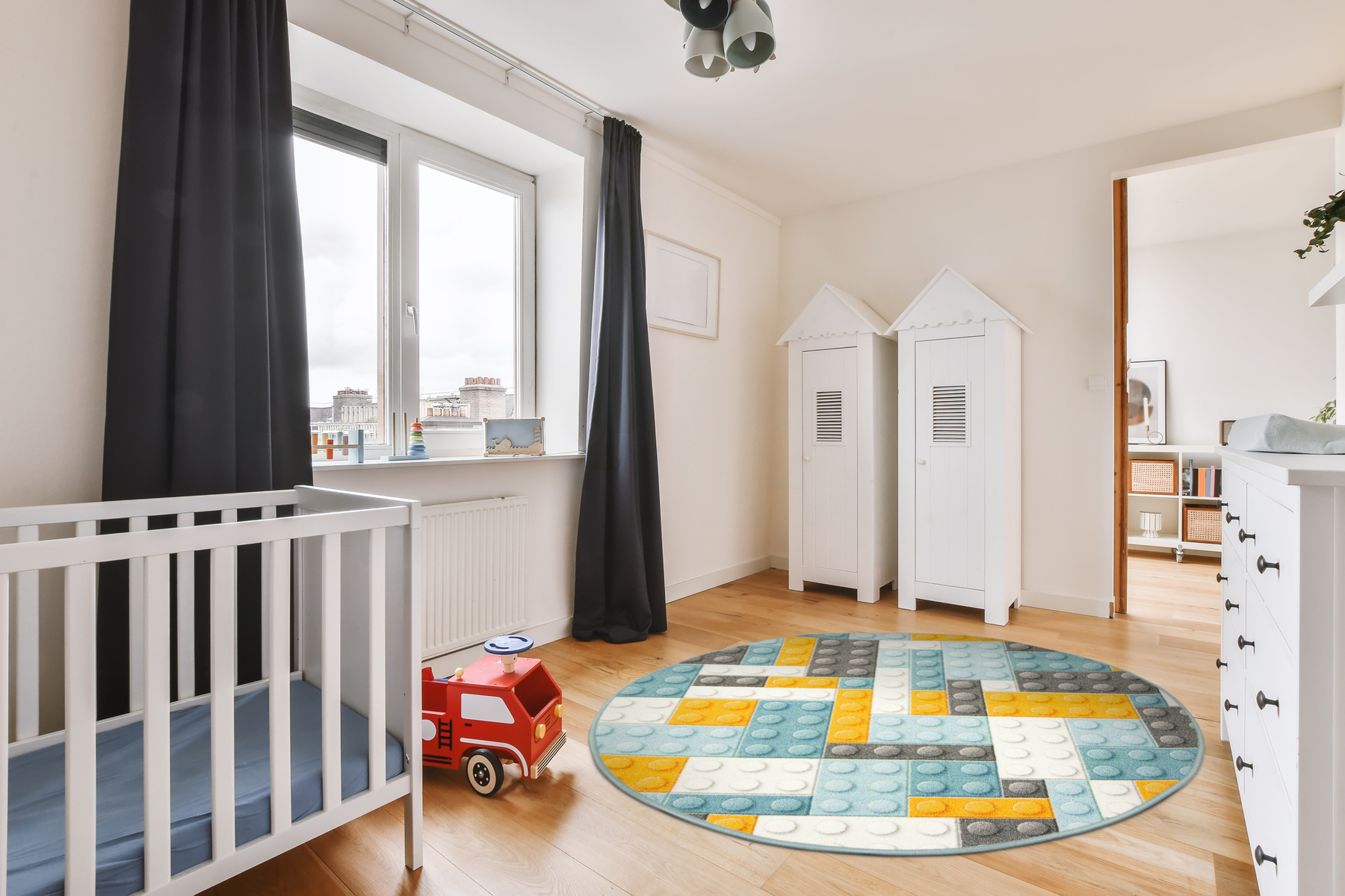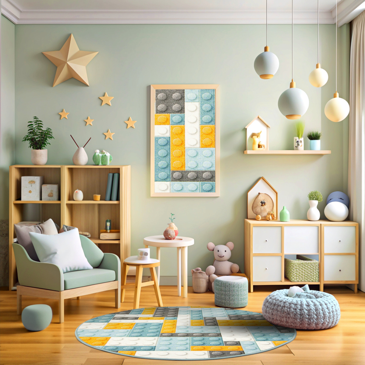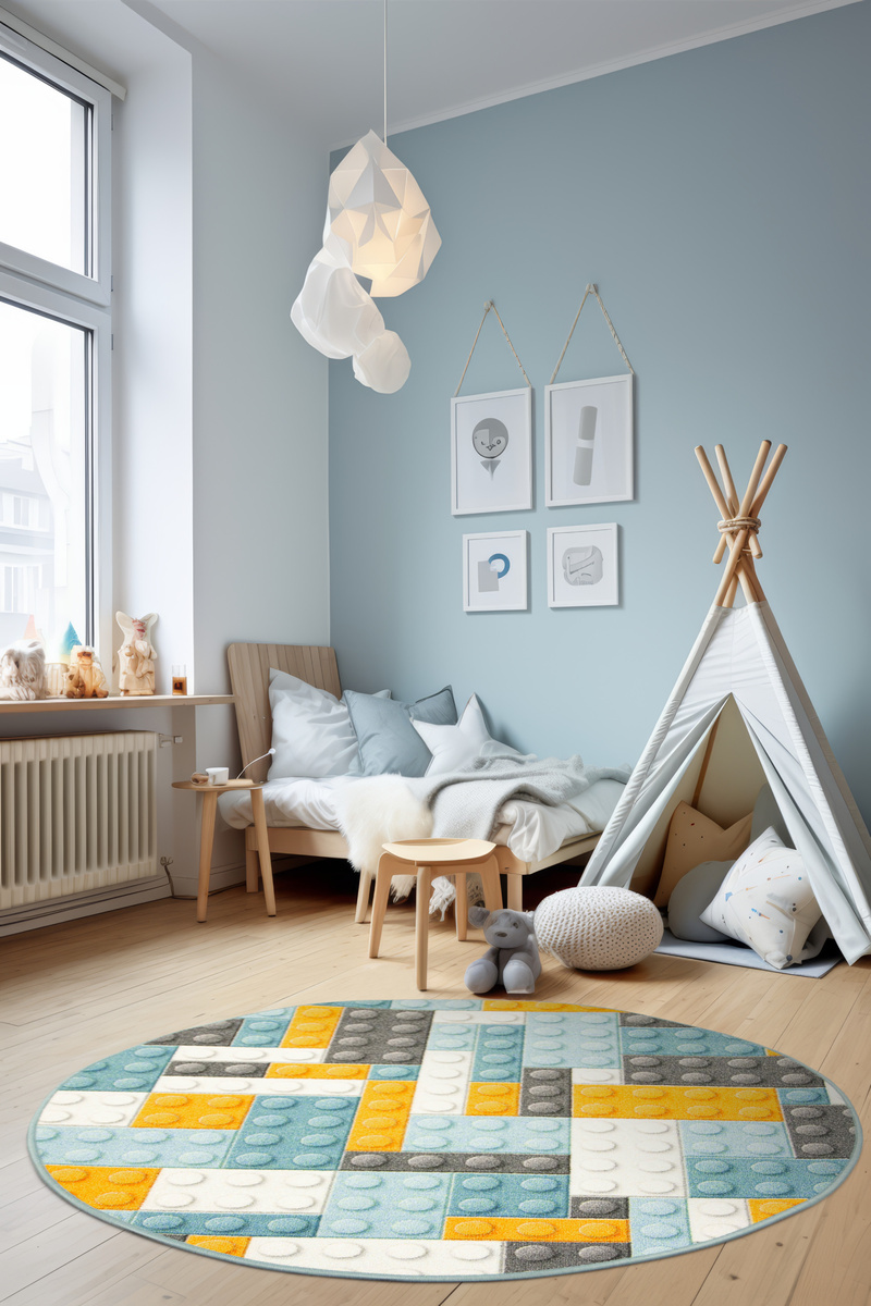 Dywan dziecięcy o wyjątkowym wzorze inspirowanym klockami to doskonały element wyposażenia pokoju najmłodszych.