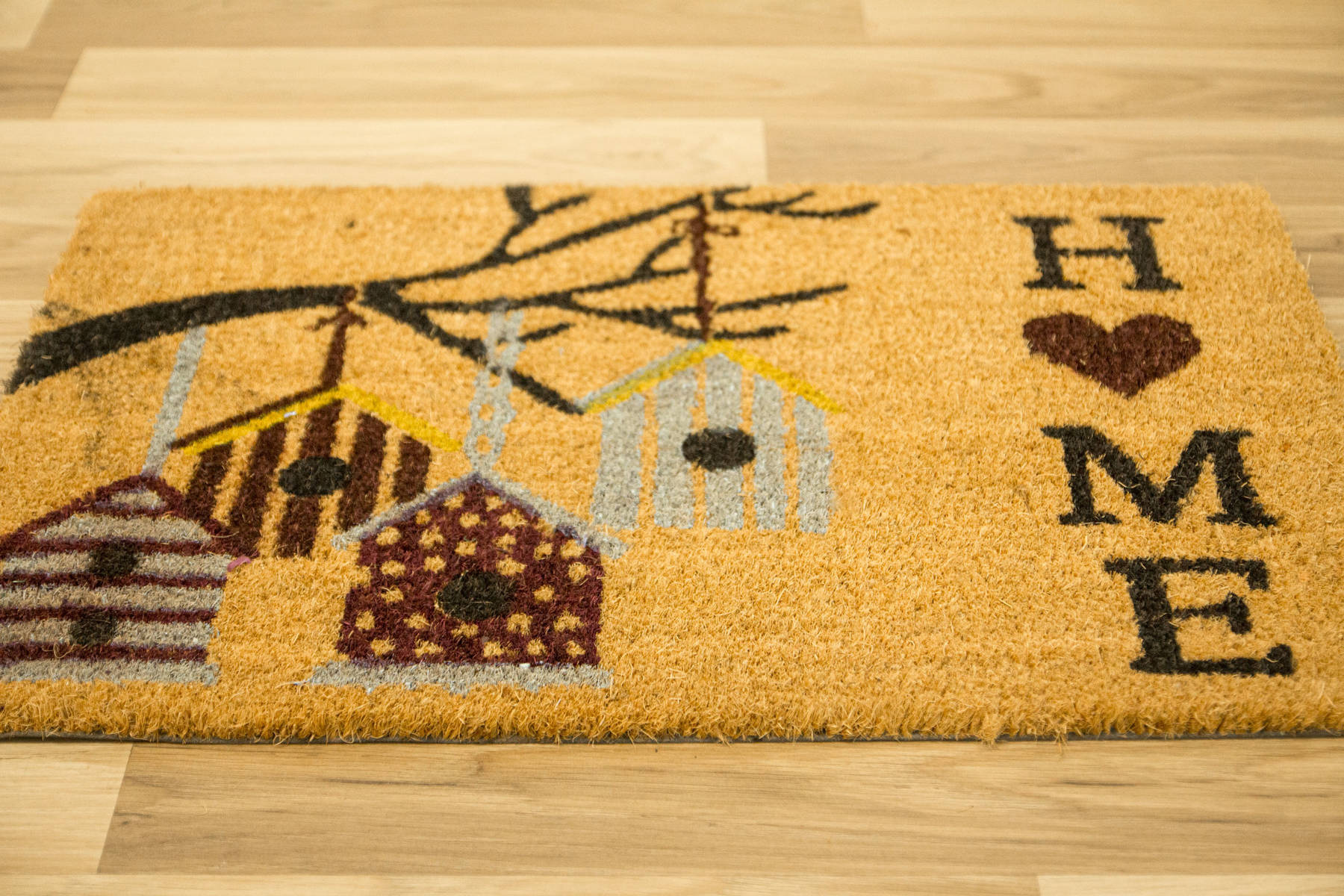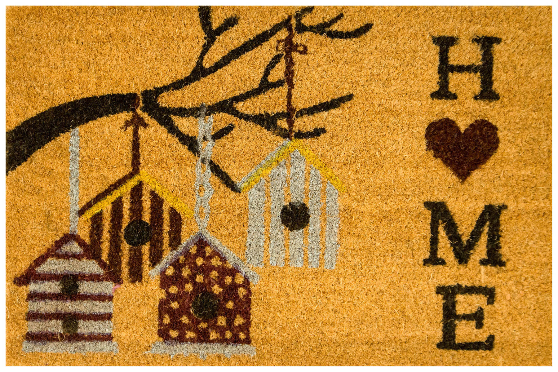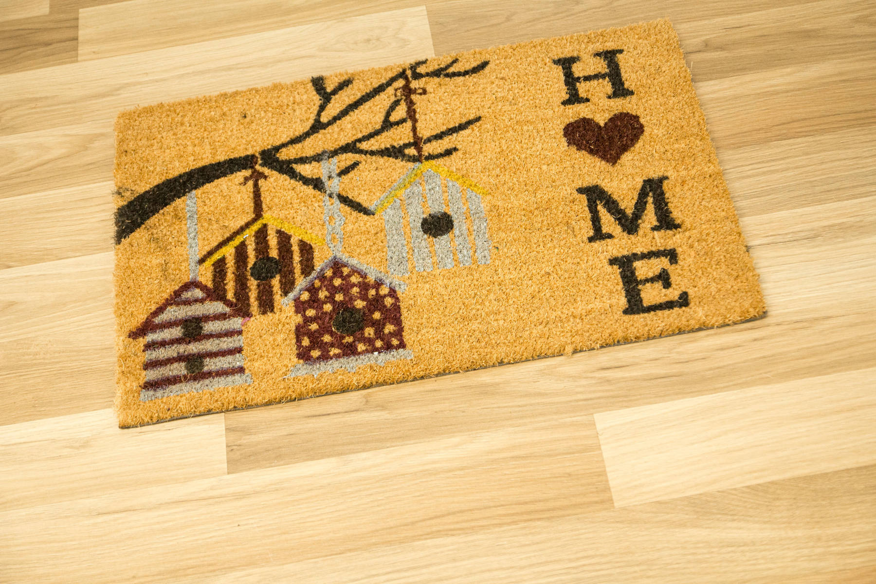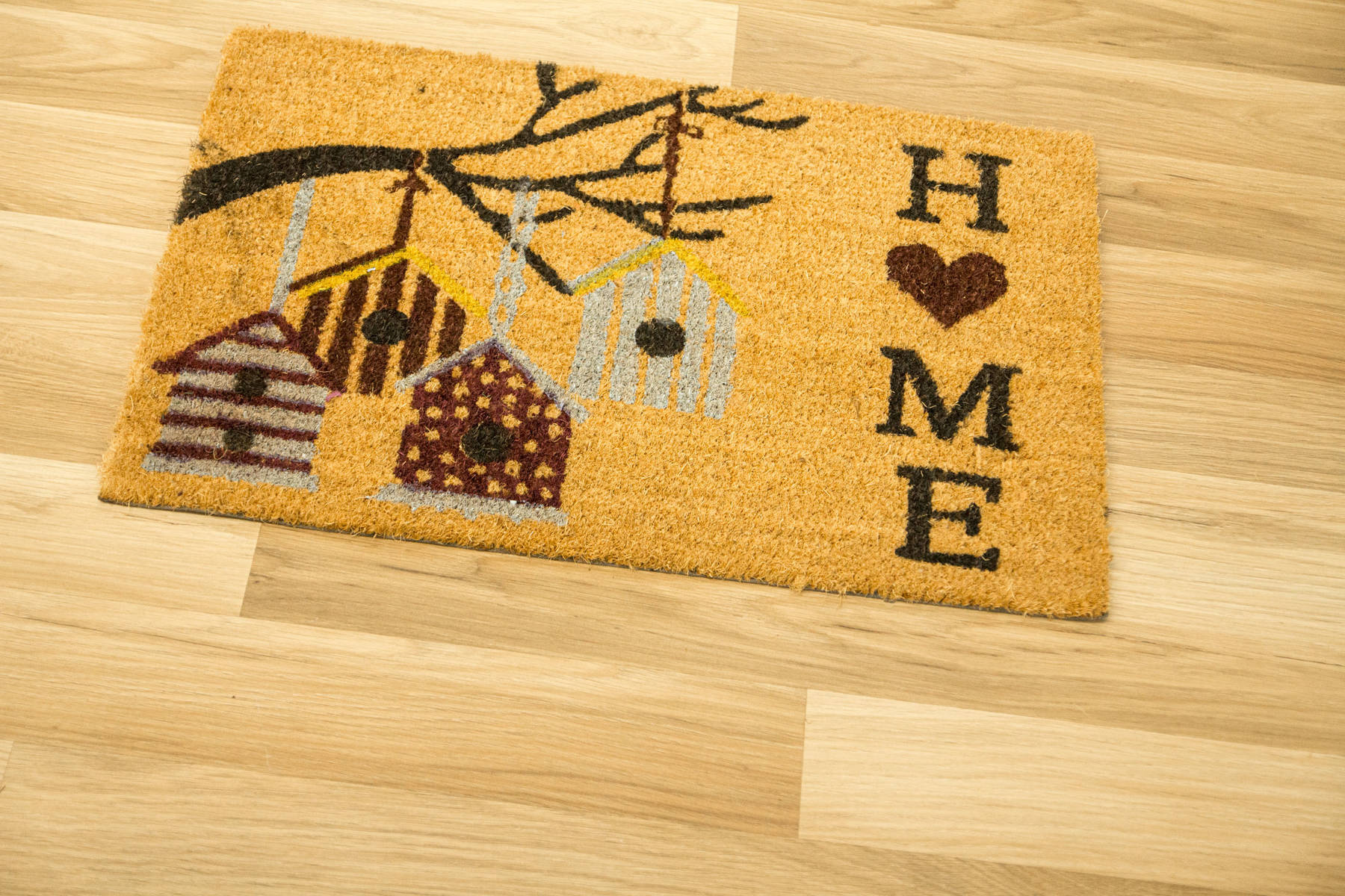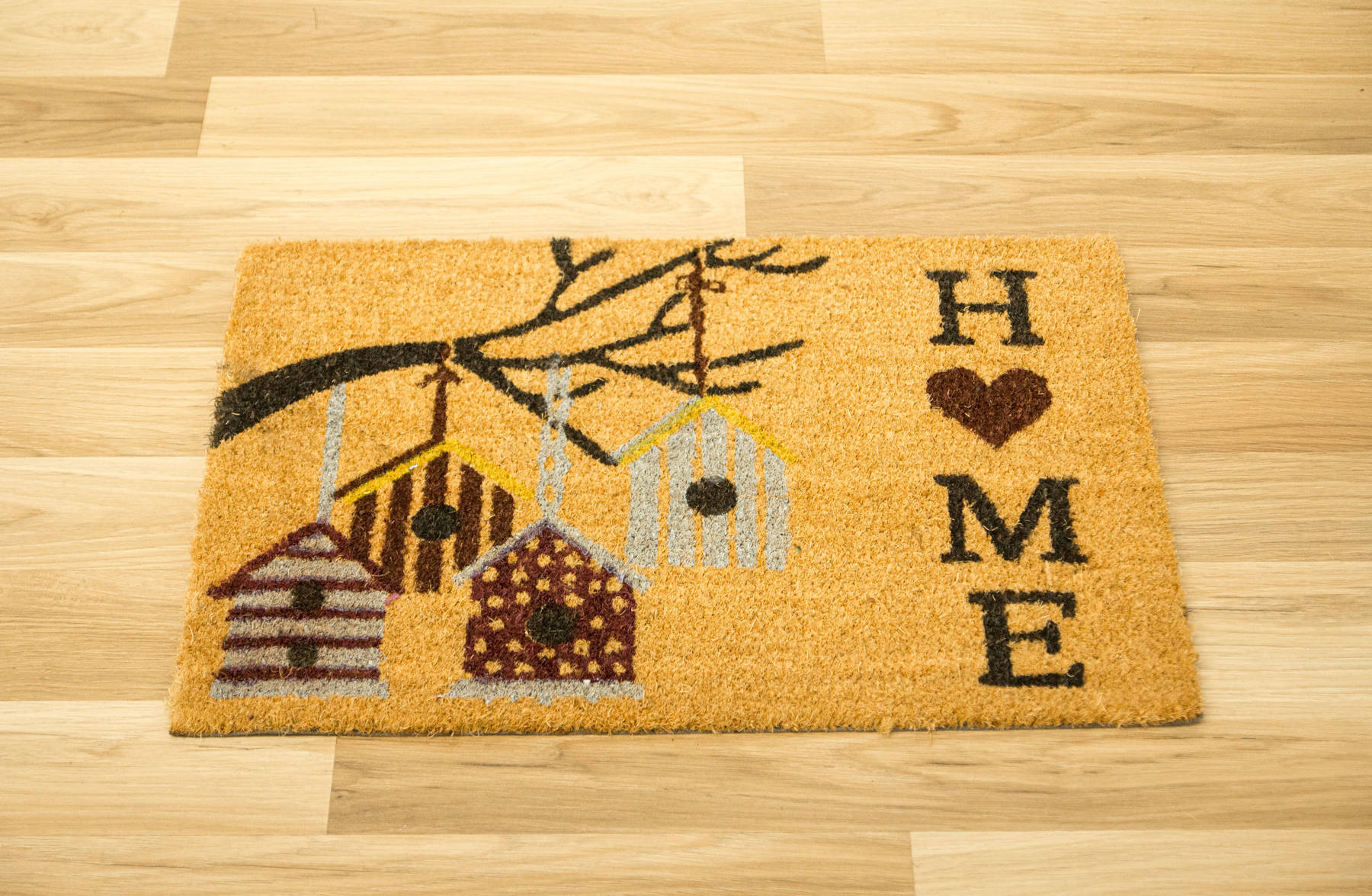 • Antypoślizgowa wycieraczka wejściowa, kokosowa Kolor Home budki z napisem