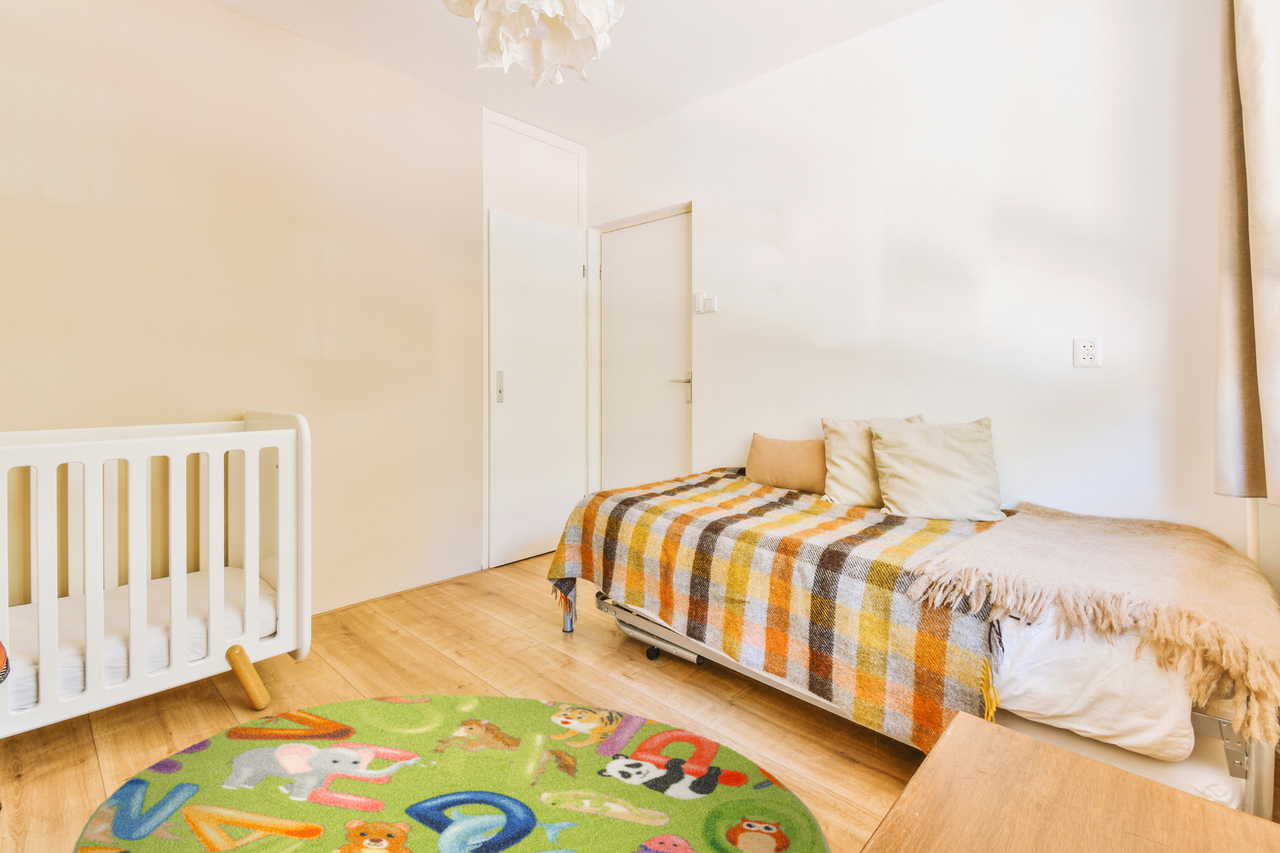 - Okrągły kolorowy dywan z wykładziny dziecięcej ze wzorem w literki i zwierzątka w odcieniach niebieskiego, pomarańczu, szarości, żółtego i kremu na zielonym tle oraz spodem wykończonym filcem