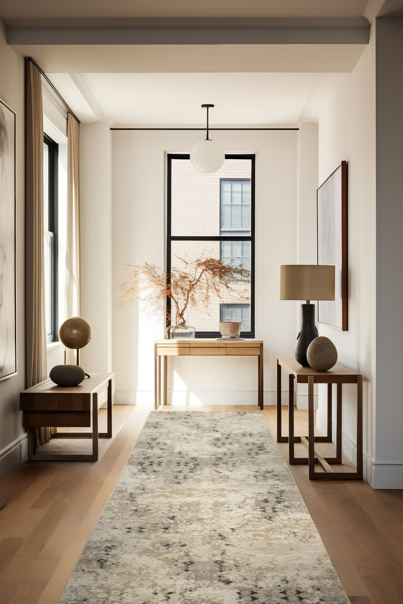 - Chodnik Aqua Vintage z runem w odcieniach beżu i szarości z abstrakcyjnym wzorem, ze spodem wykończonym czarnym filcem o antypoślizgowym nakrapianiu