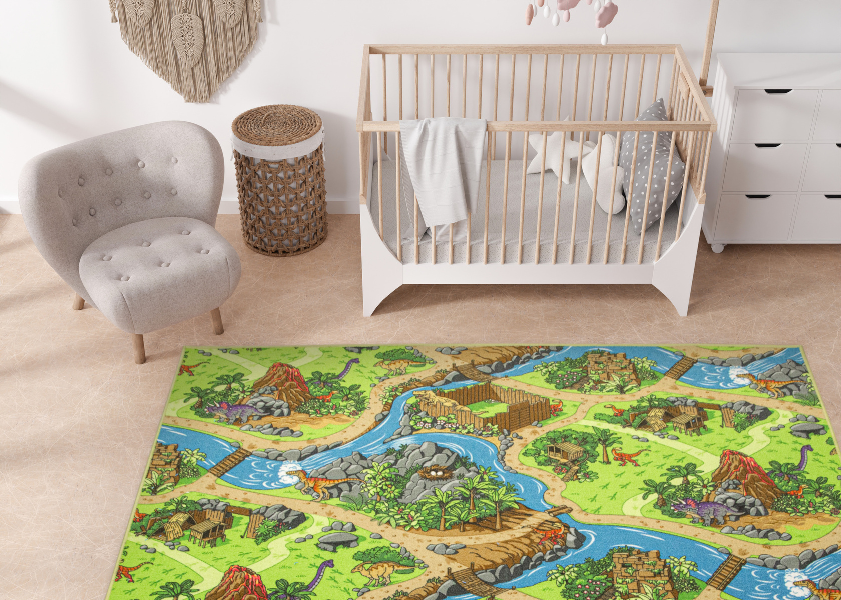 - Kolorowy dywan z wykładziny dziecięcej o wzorze w dinozaury i wulkany ze spodem wykończonym filcem