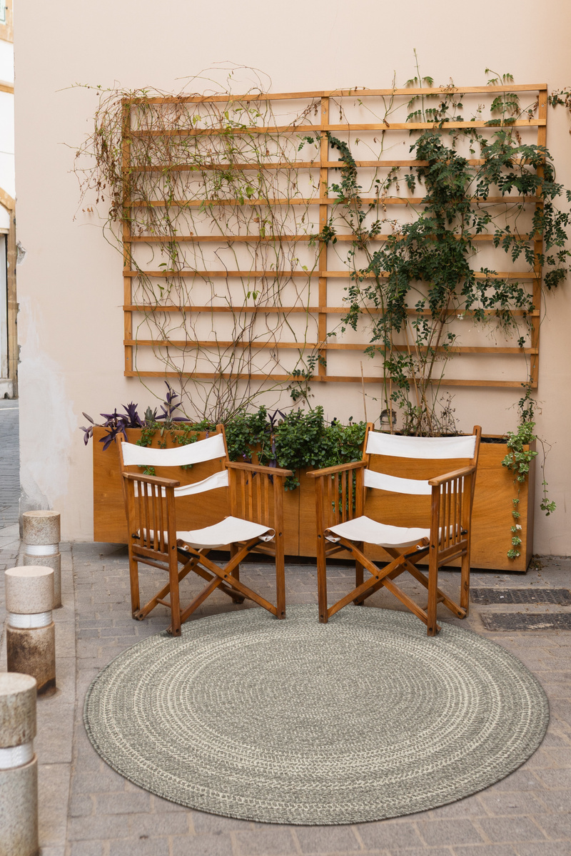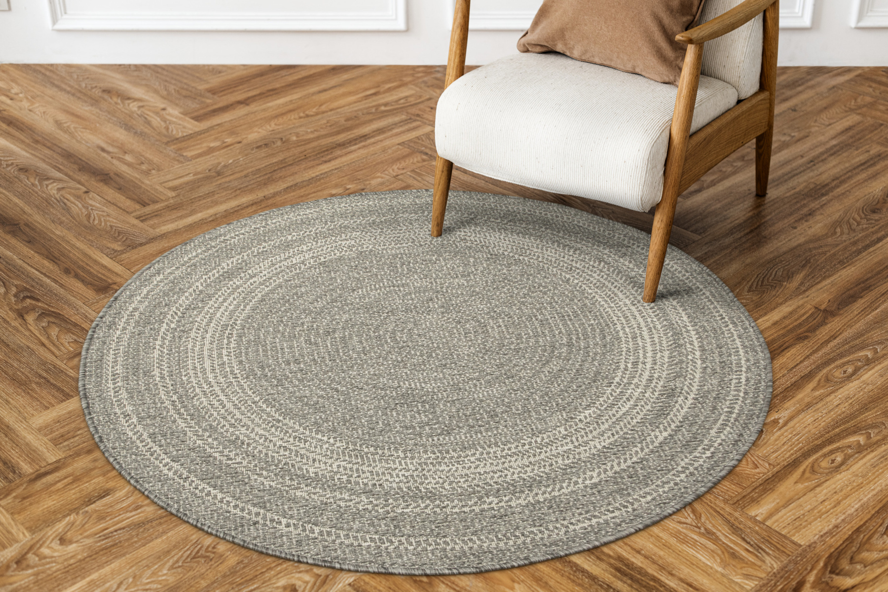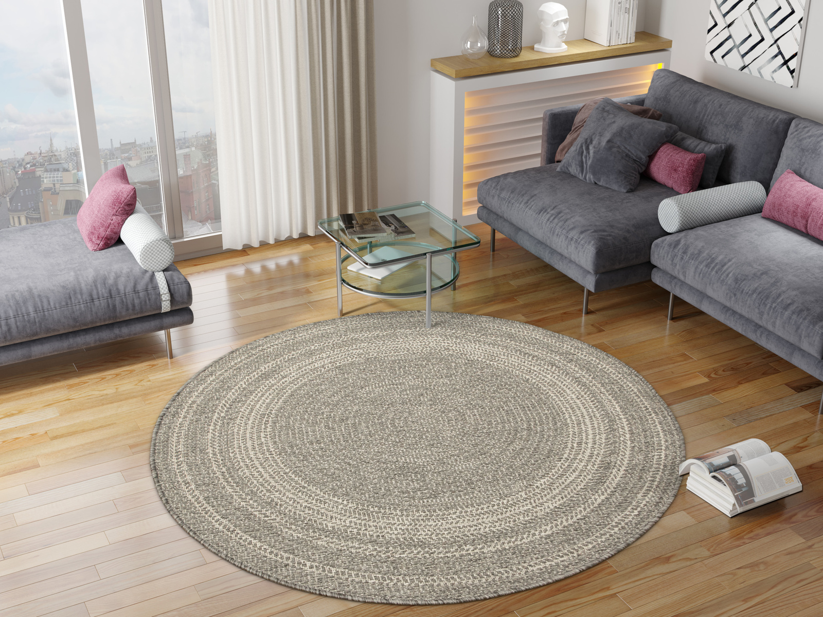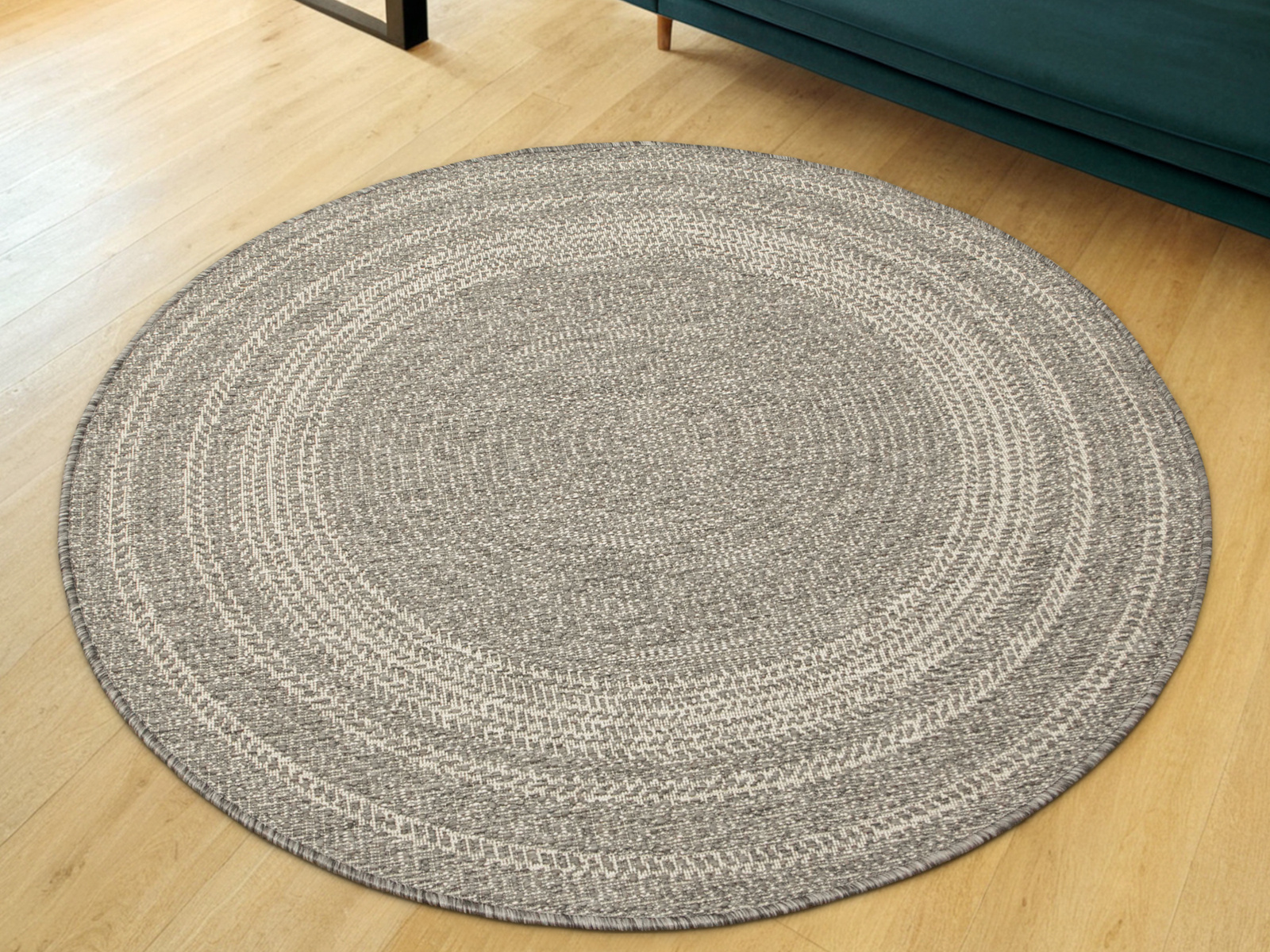 - Okrągły dwustronny, sznurkowy dywan Brussels belgijskiej produkcji z geometrycznym wzorem w koła, w odcieniach szarości i kremu, który może być stosowany zarówno wewnątrz jak i na zewnątrz.