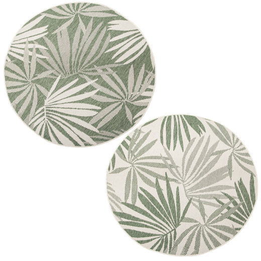 - Okrągły dwustronny, sznurkowy dywan Brussels belgijskiej produkcji z naturalnym wzorem w listki palm, w odcieniach zieleni i kremu, który może być stosowany zarówno wewnątrz jak i na zewnątrz.