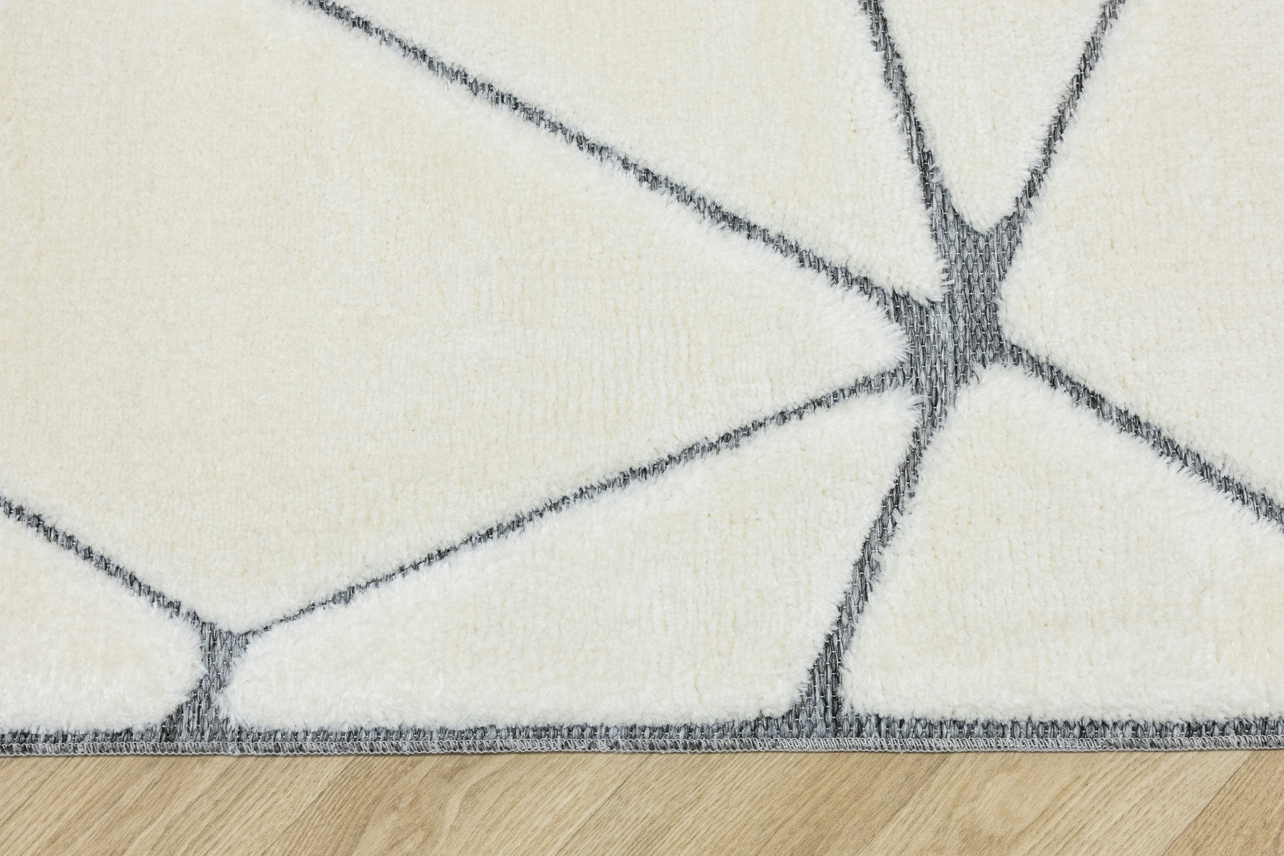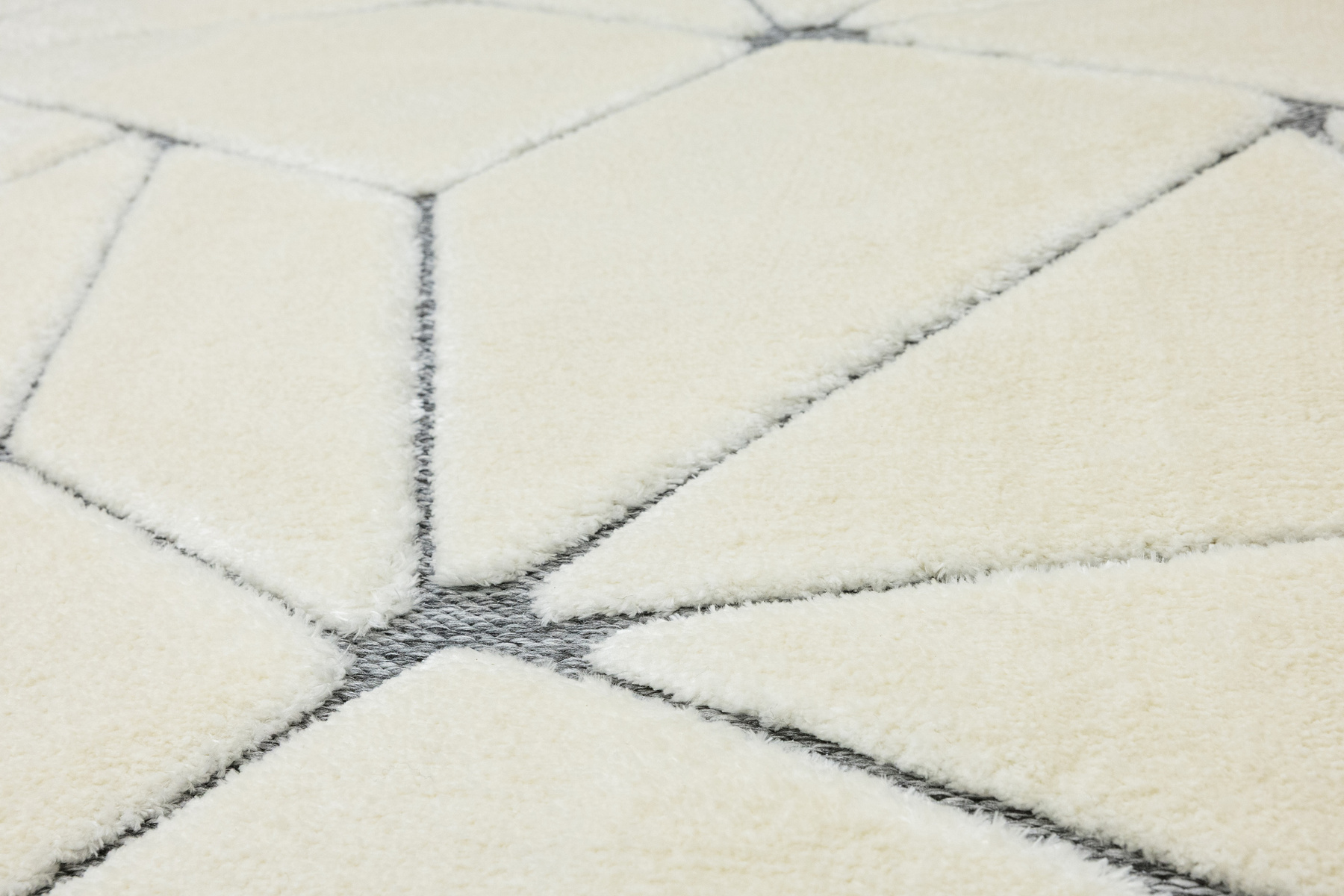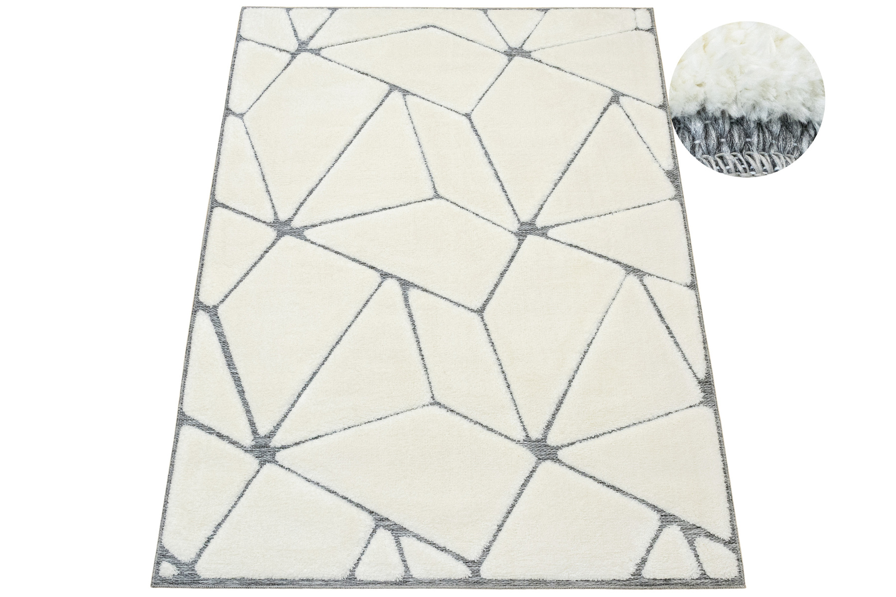 • Luksusowy dywan Lula Soft z miękkim, wycinanym kremowym runem typu shaggy, podkładem sizalowym w odcieniu szarości ze wzorem geometrycznym.