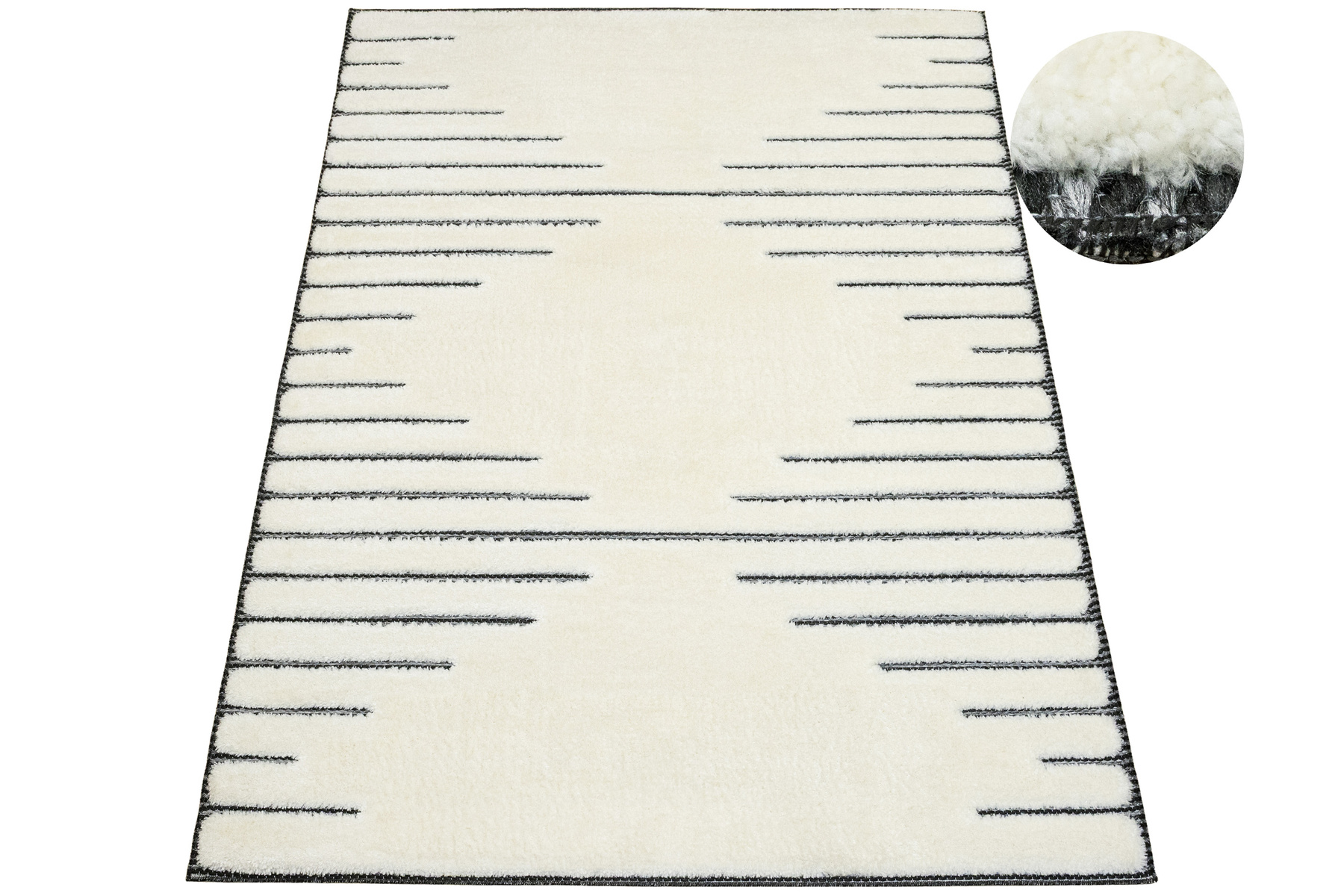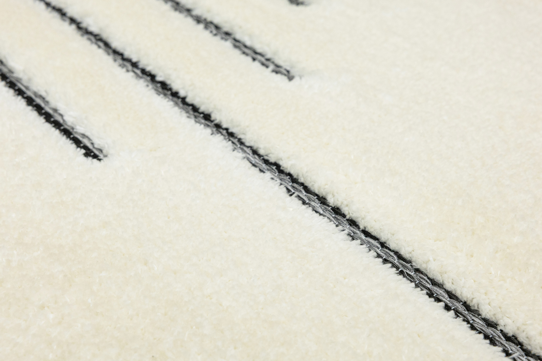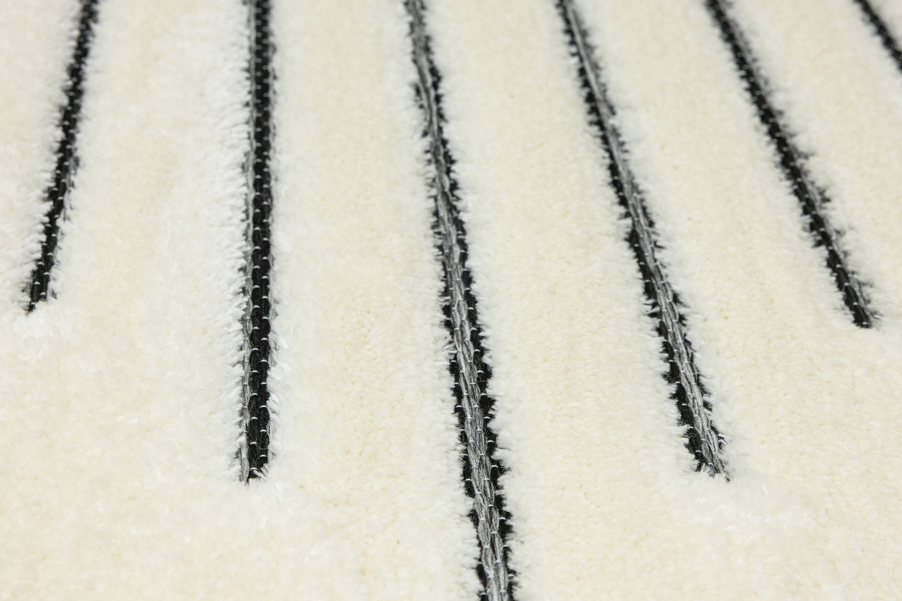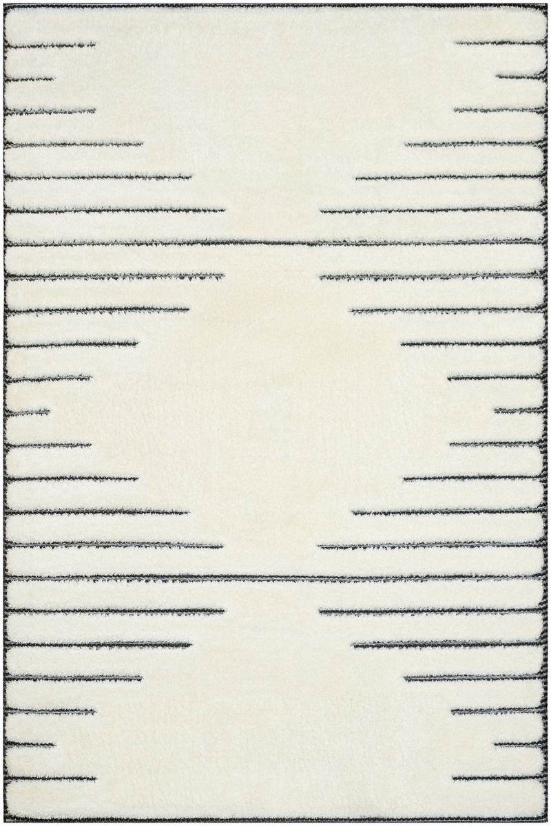 - Luksusowy dywan Lula Soft z miękkim, wycinanym kremowym runem typu shaggy, podkładem sizalowym w czerni i graficie z geometrycznym wzorem z motywem pasków i rombów.