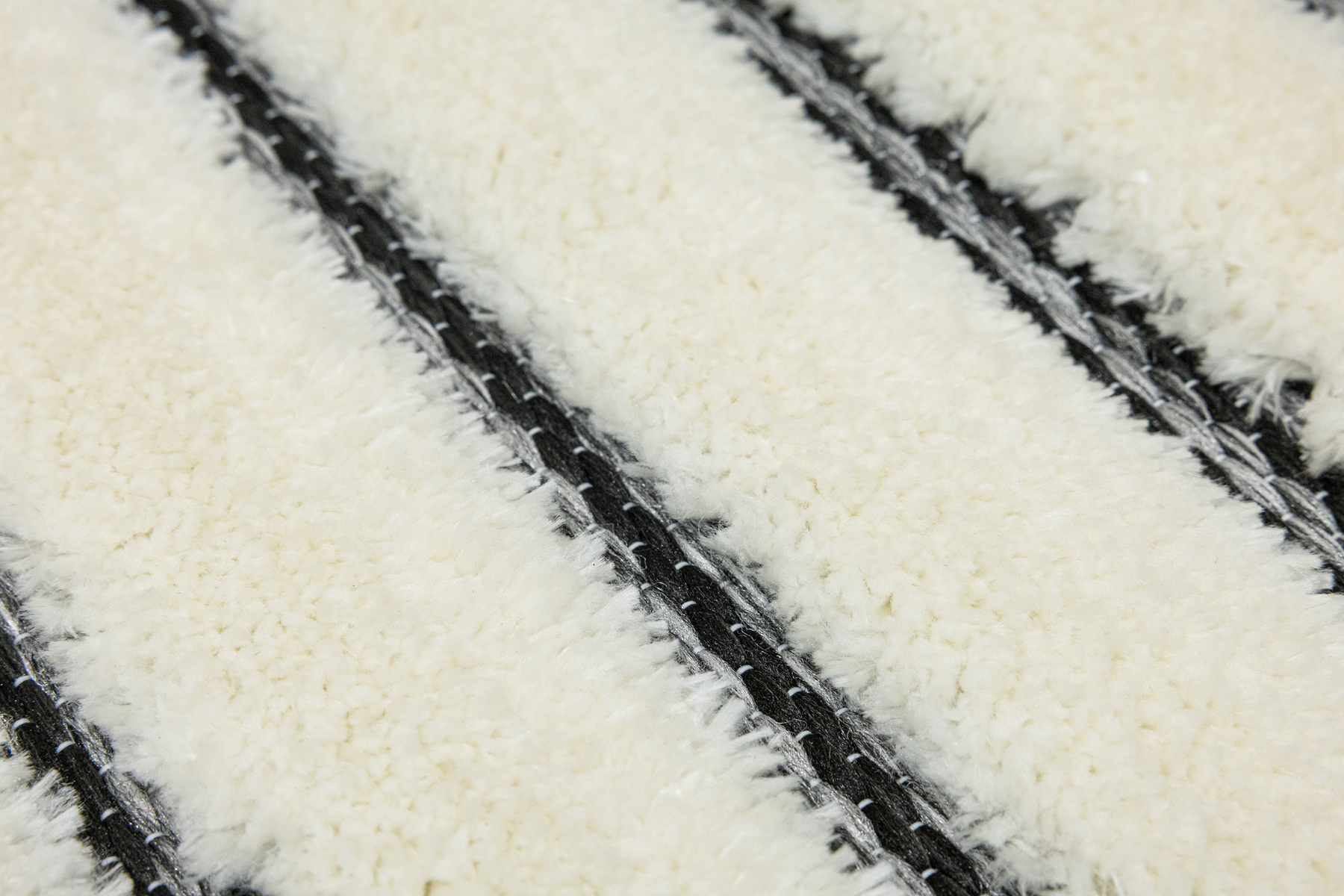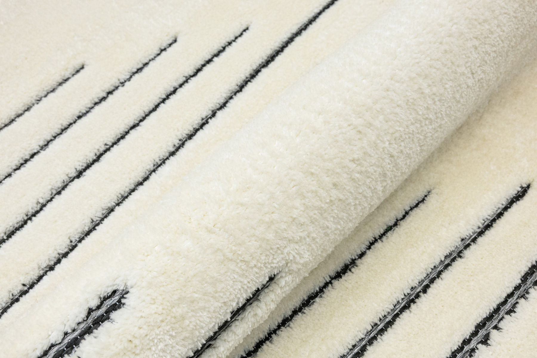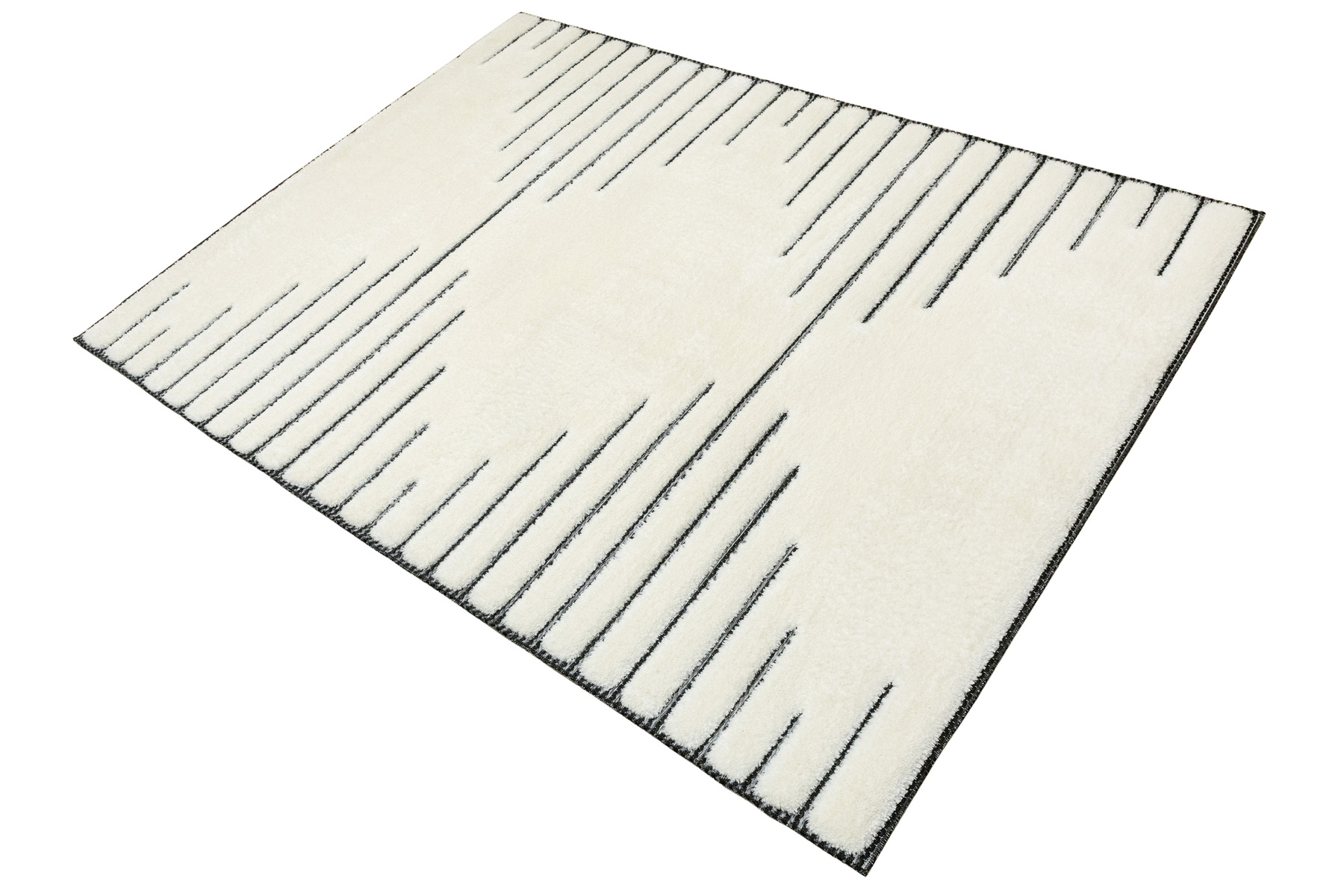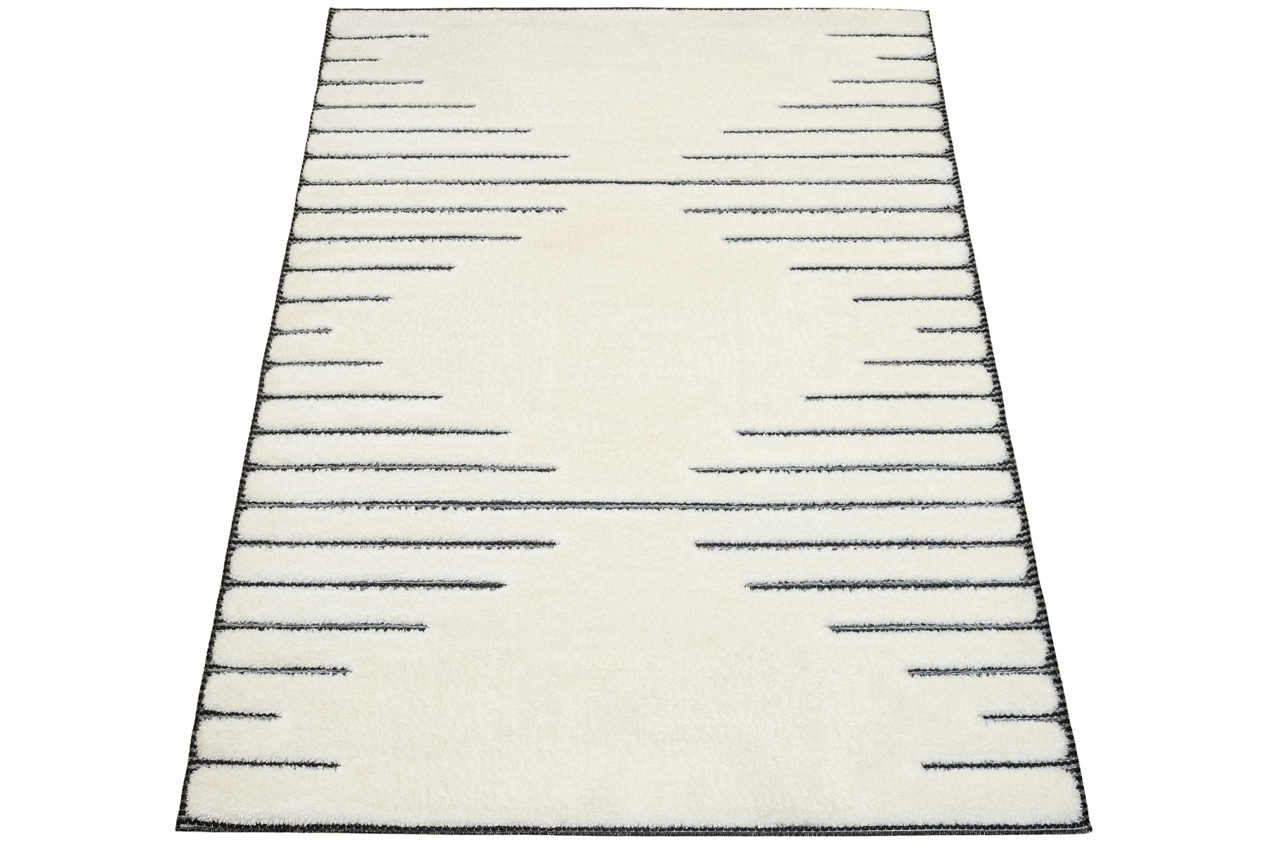 - Luksusowy dywan Lula Soft z miękkim, wycinanym kremowym runem typu shaggy, podkładem sizalowym w czerni i graficie z geometrycznym wzorem z motywem pasków i rombów.