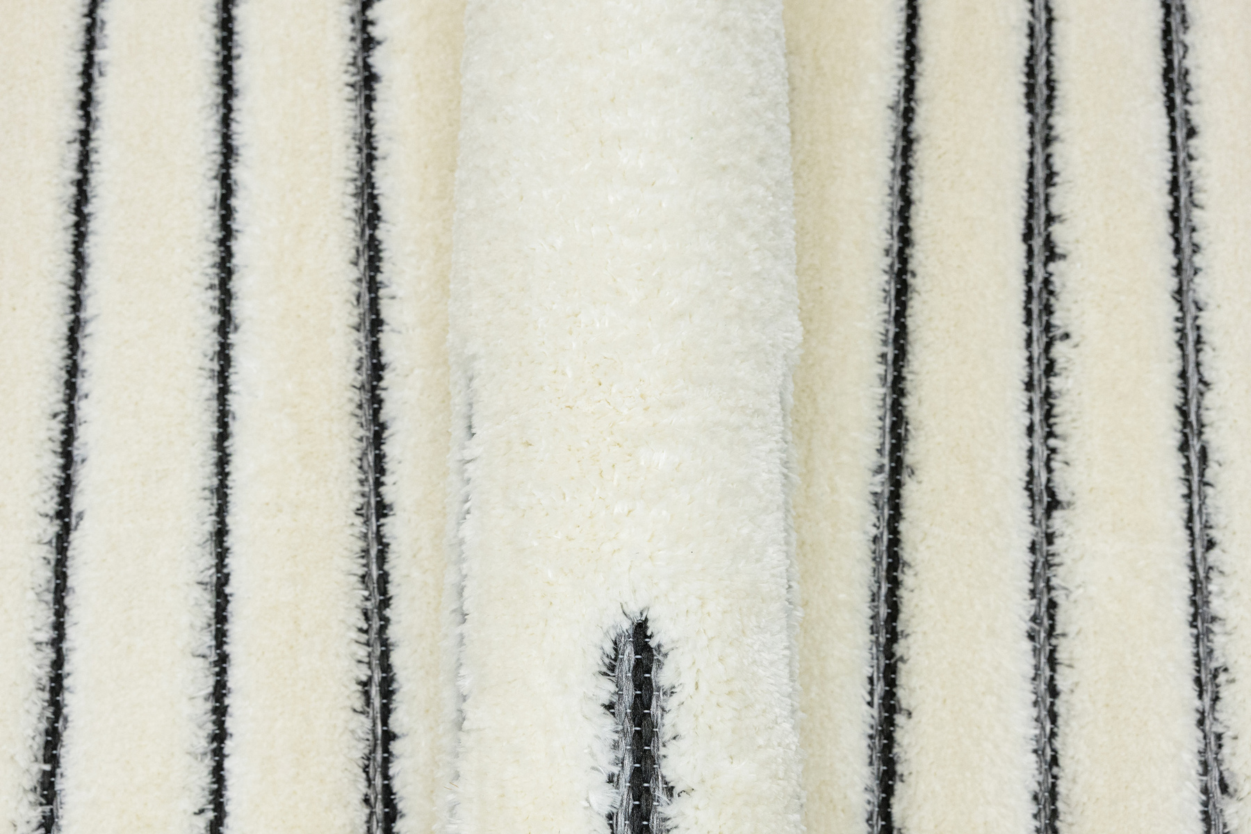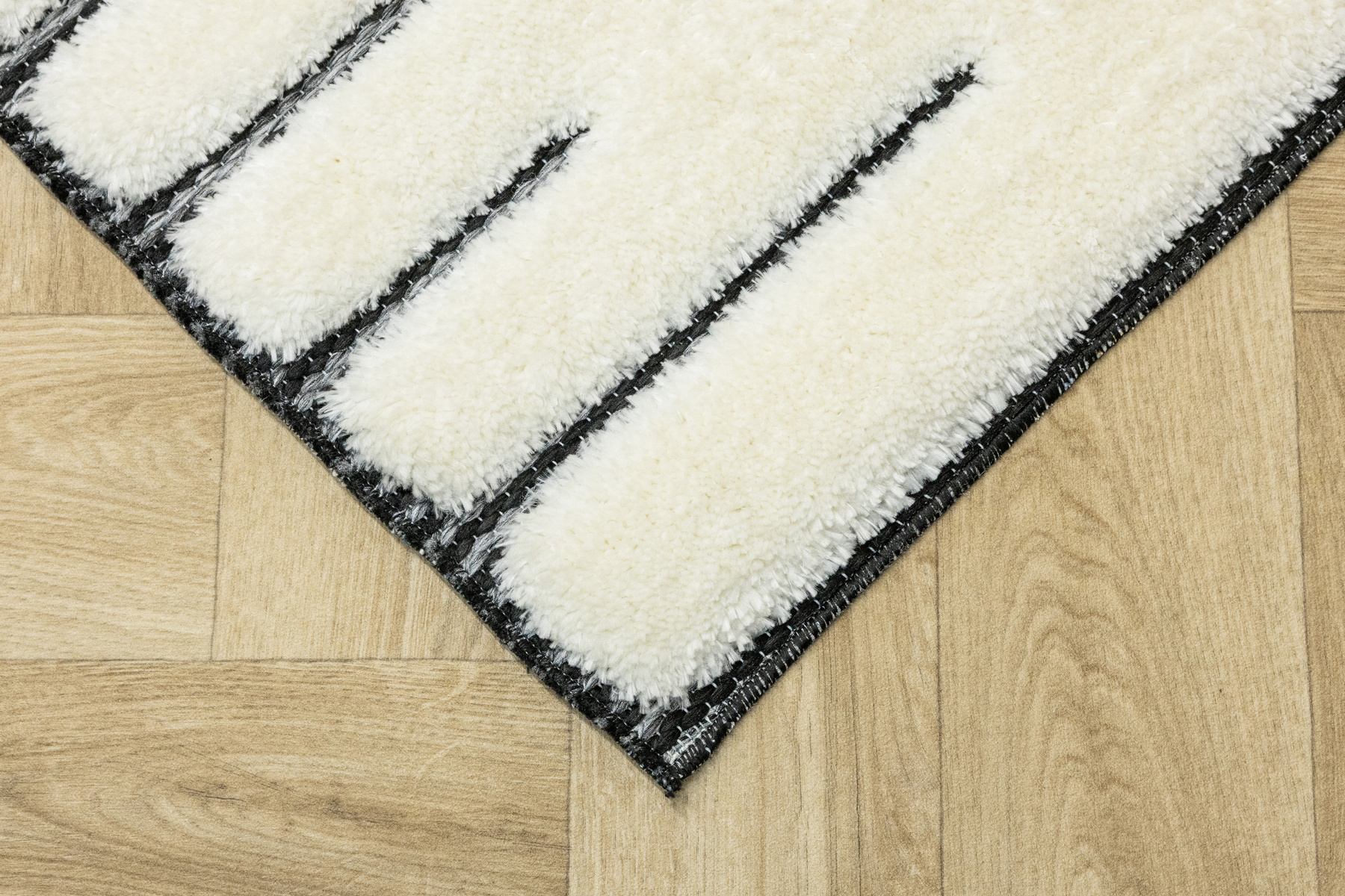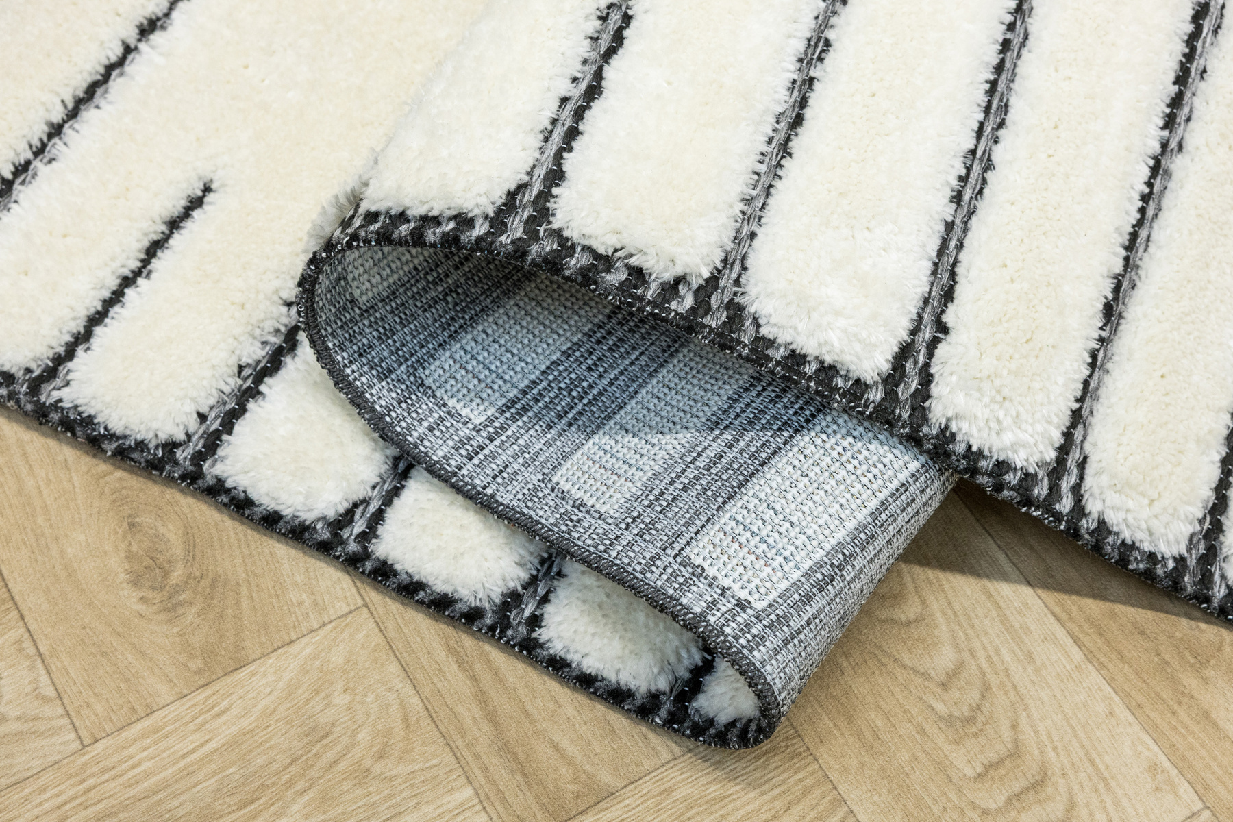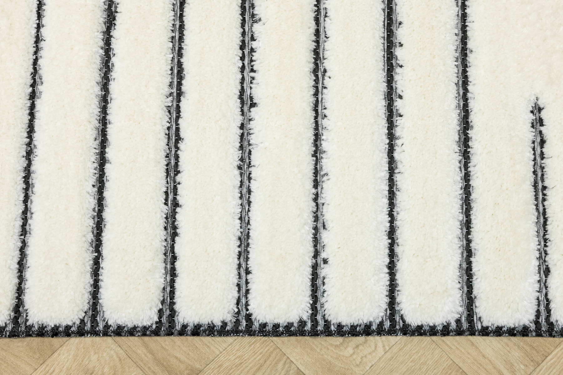 - Luksusowy dywan Lula Soft z miękkim, wycinanym kremowym runem typu shaggy, podkładem sizalowym w czerni i graficie z geometrycznym wzorem z motywem pasków i rombów.