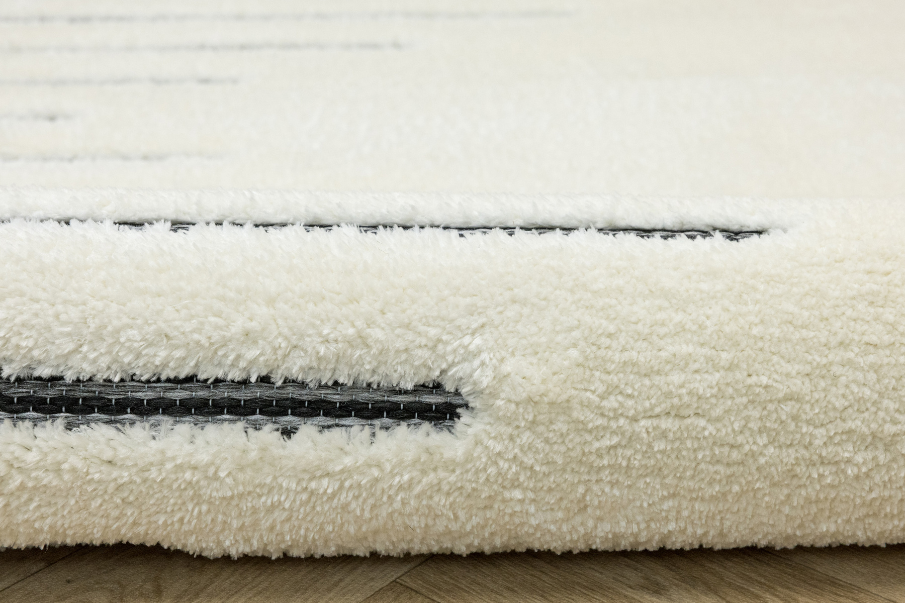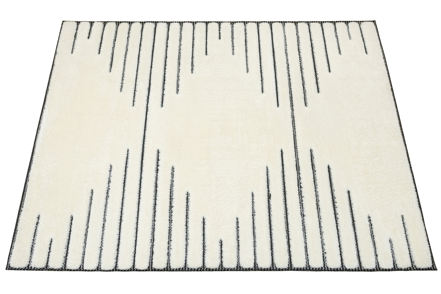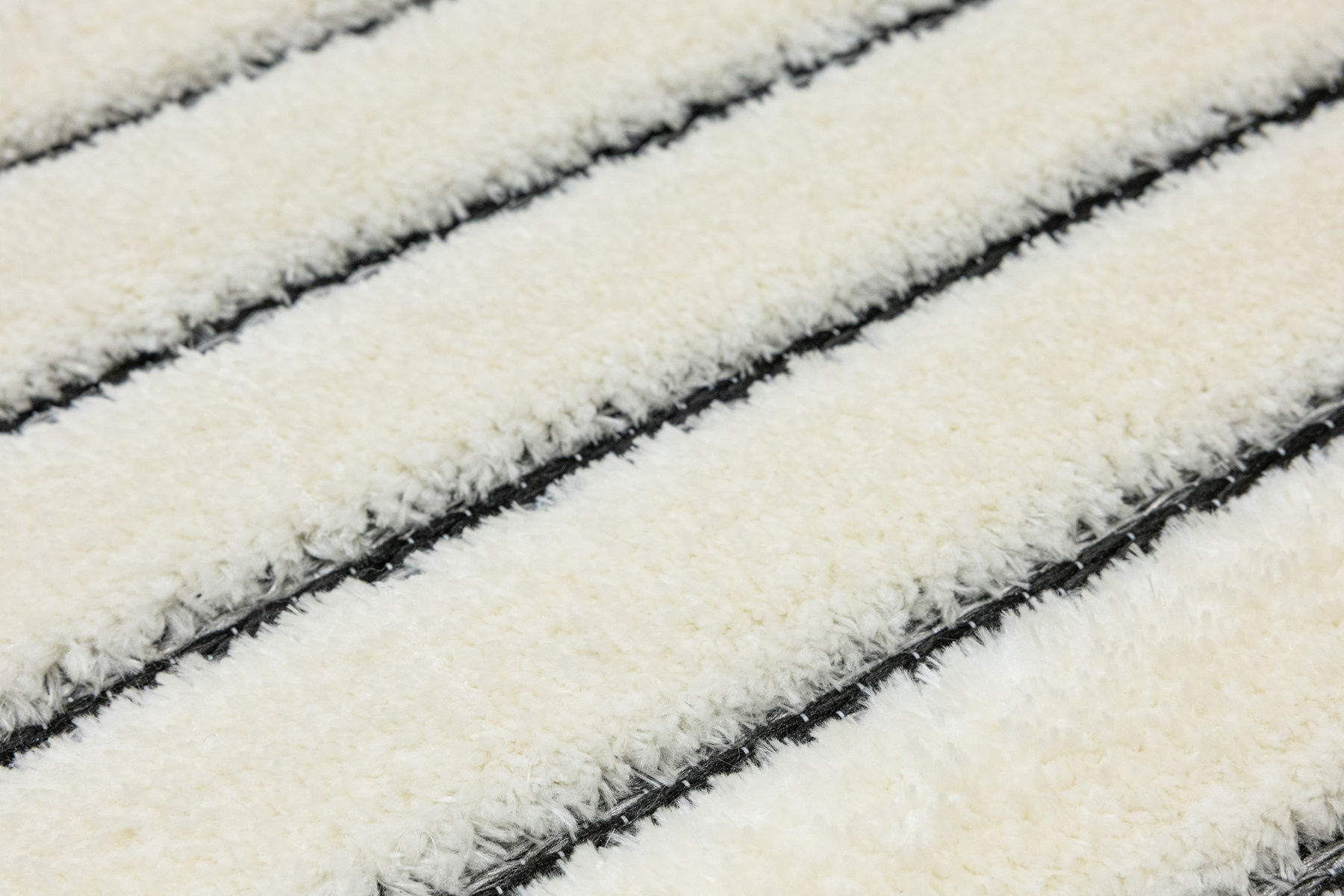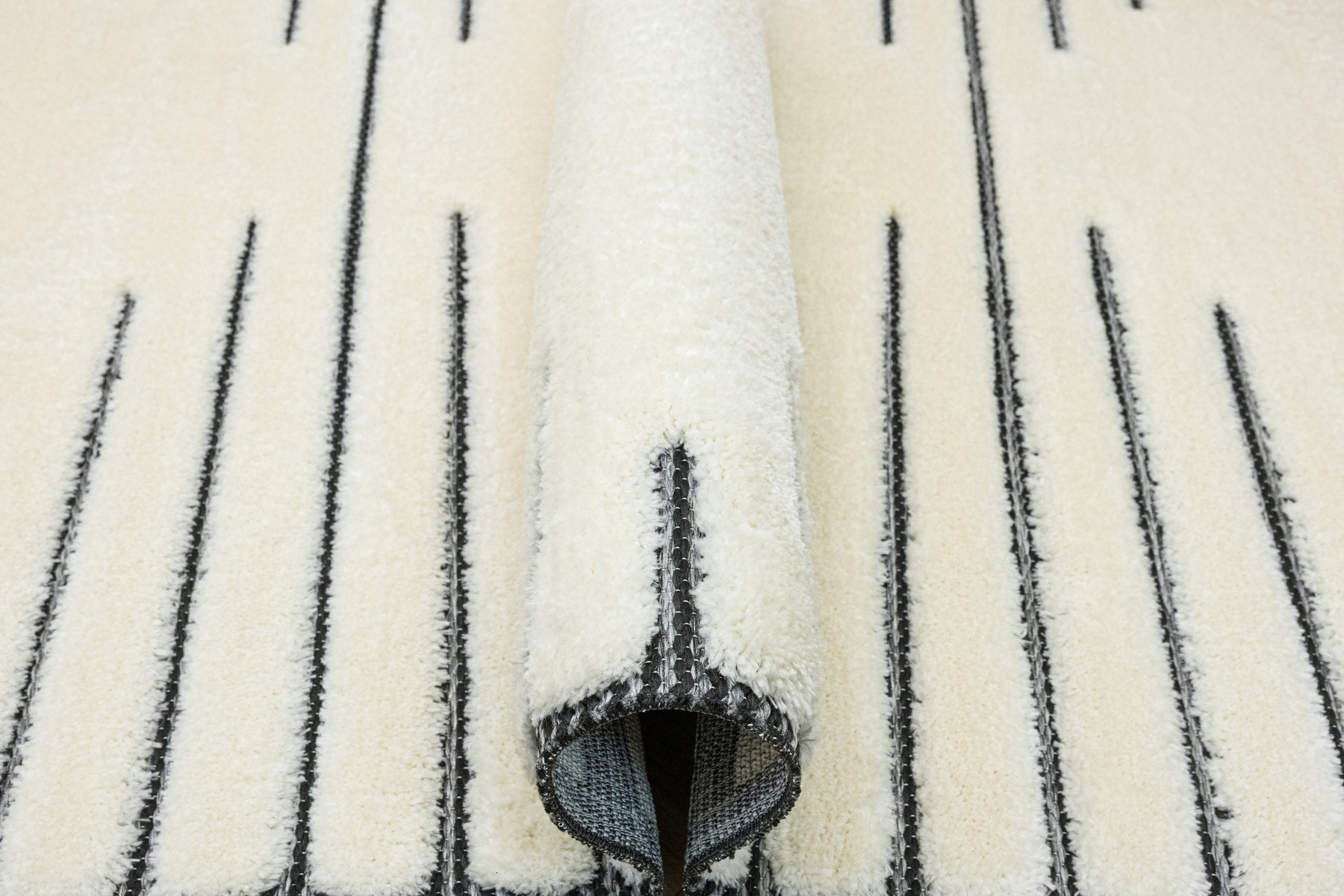 - Luksusowy dywan Lula Soft z miękkim, wycinanym kremowym runem typu shaggy, podkładem sizalowym w czerni i graficie z geometrycznym wzorem z motywem pasków i rombów.
