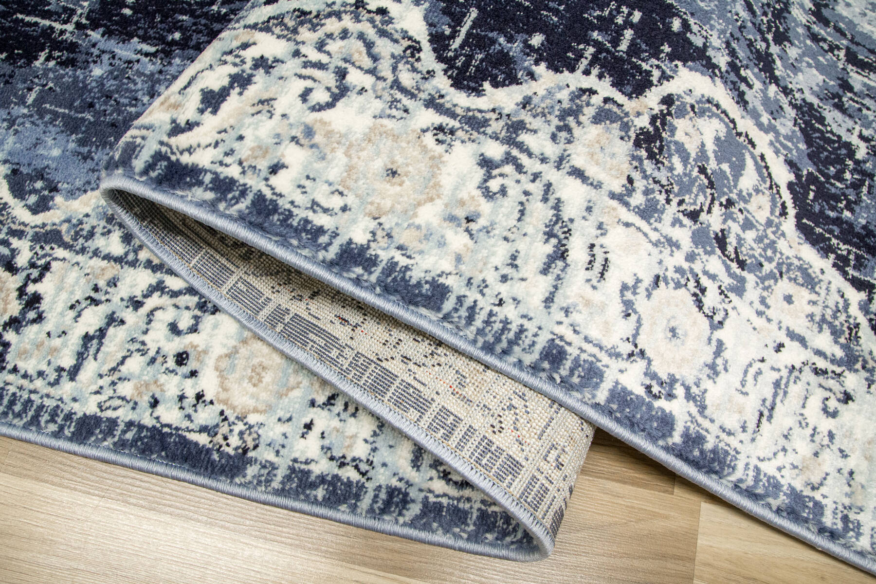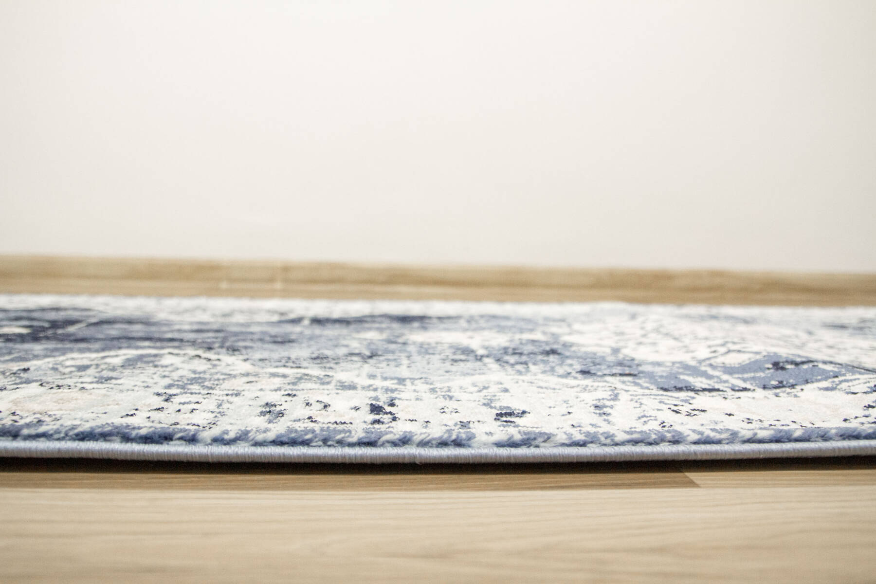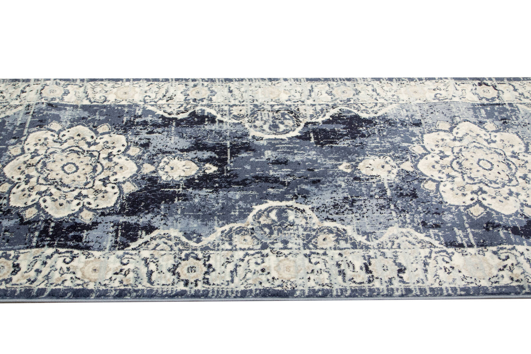 - Miękki i przyjemny w dotyku chodnik dywanowy Victoria z ornamentowym wzorem ozdobionym motywami roślinnymi inspirowanymi wpływami wschodnimi w odcieniach niebieskiego, granatu, kremu ze spodem wykończonym jutą