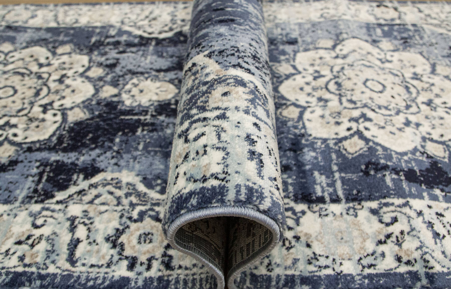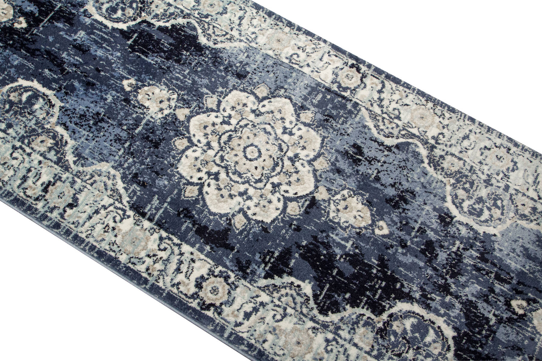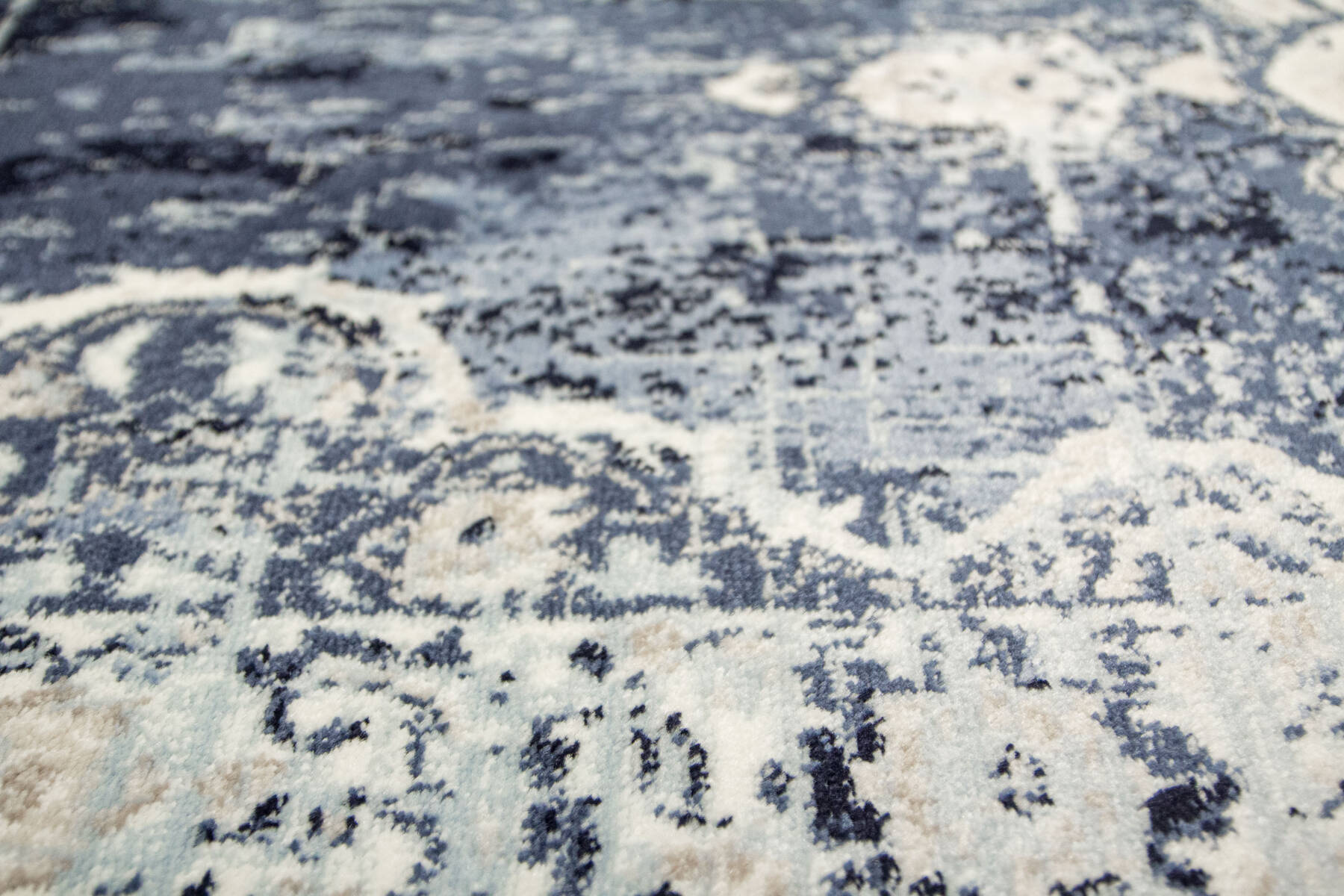 - Miękki i przyjemny w dotyku chodnik dywanowy Victoria z ornamentowym wzorem ozdobionym motywami roślinnymi inspirowanymi wpływami wschodnimi w odcieniach niebieskiego, granatu, kremu ze spodem wykończonym jutą