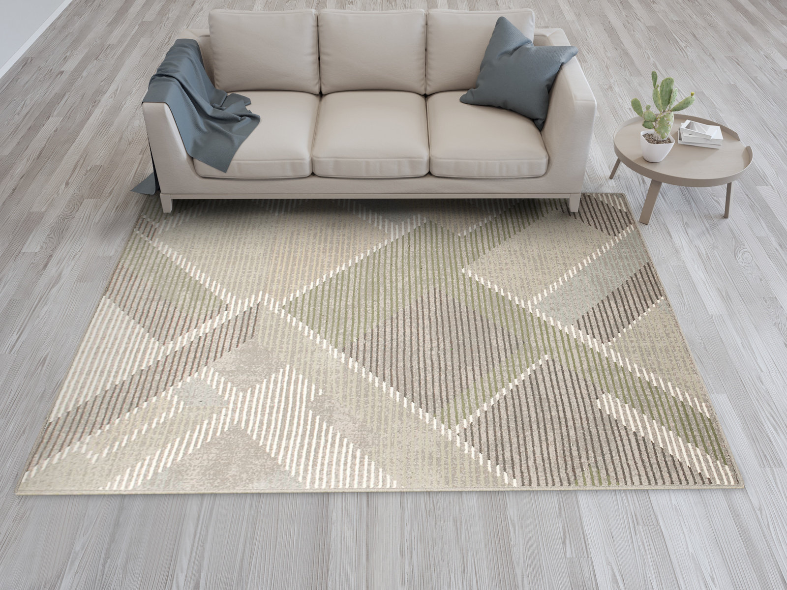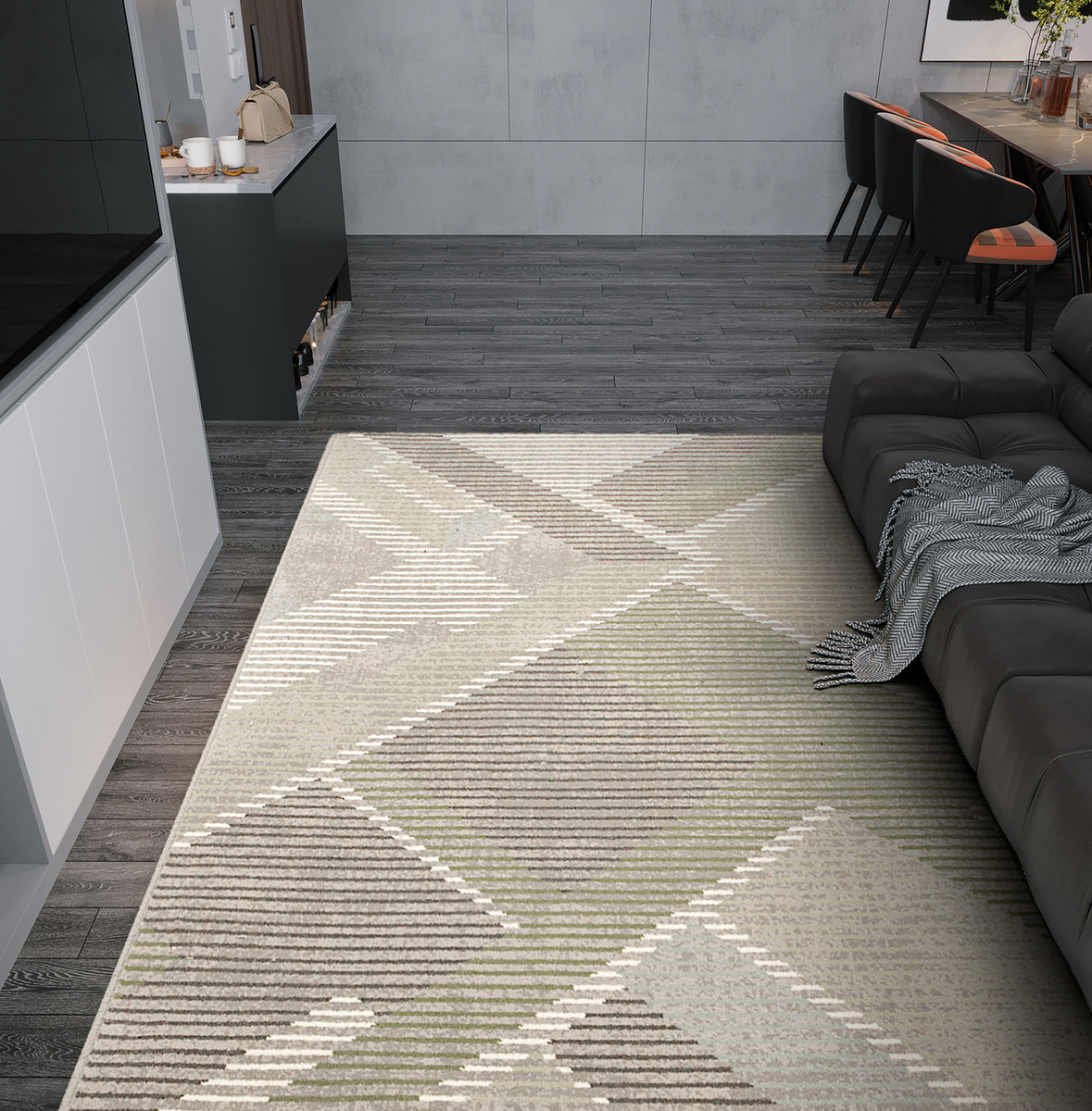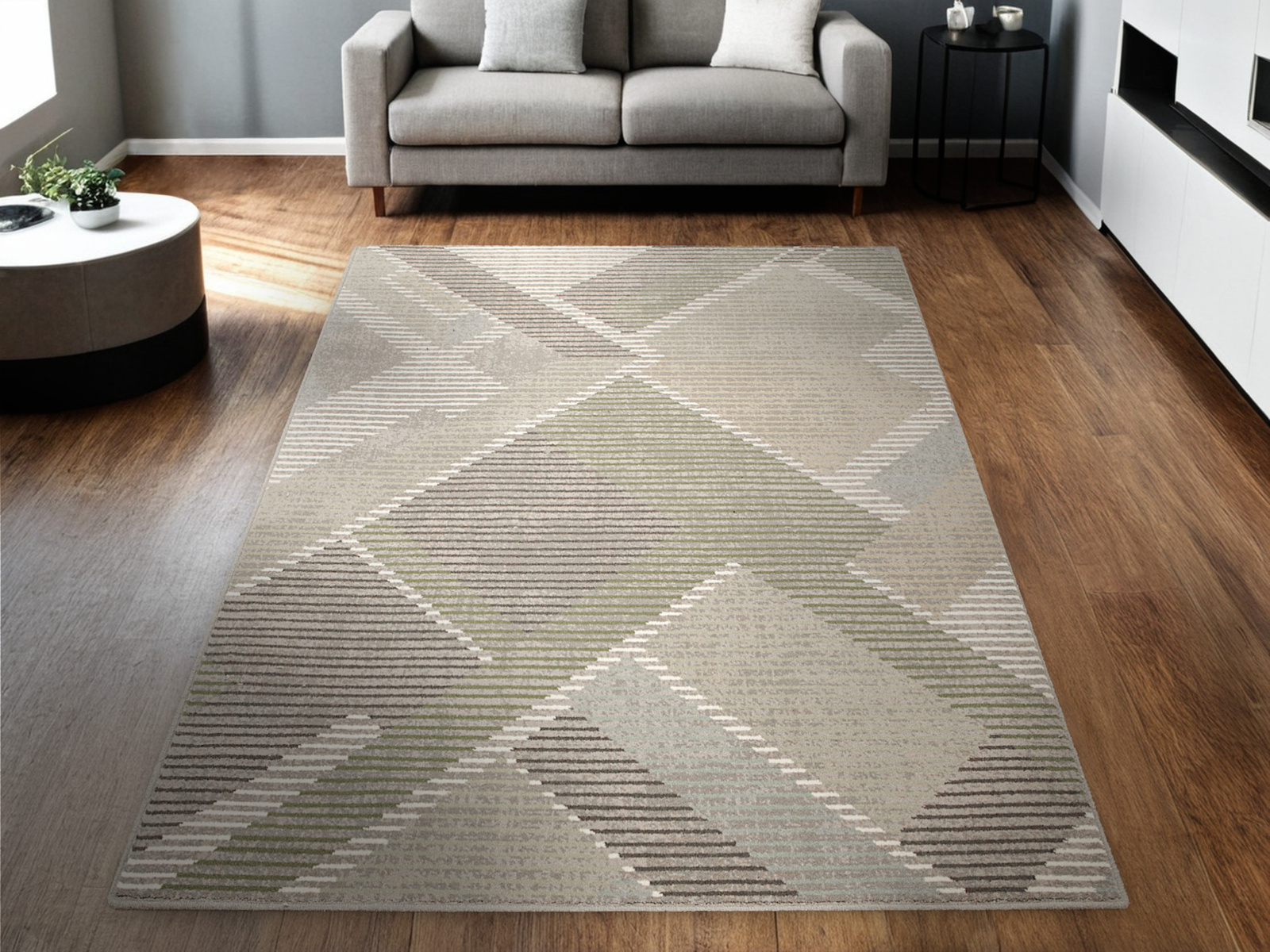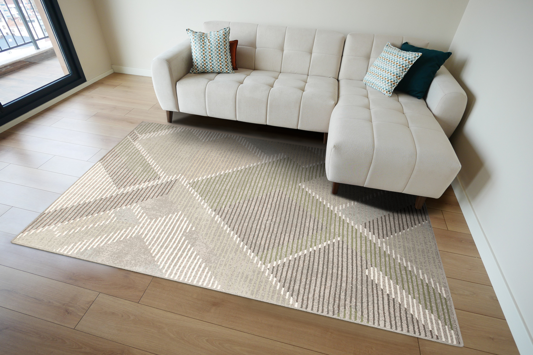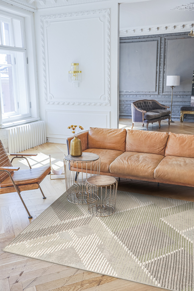 - Wełniany dywan Ballata od Agnelli z miękkim runem ozdobionym nowoczesnym, geometrycznym wzorem w szarościach, odcieniach zieleni, kremie, beżu i akcentami turkusu.