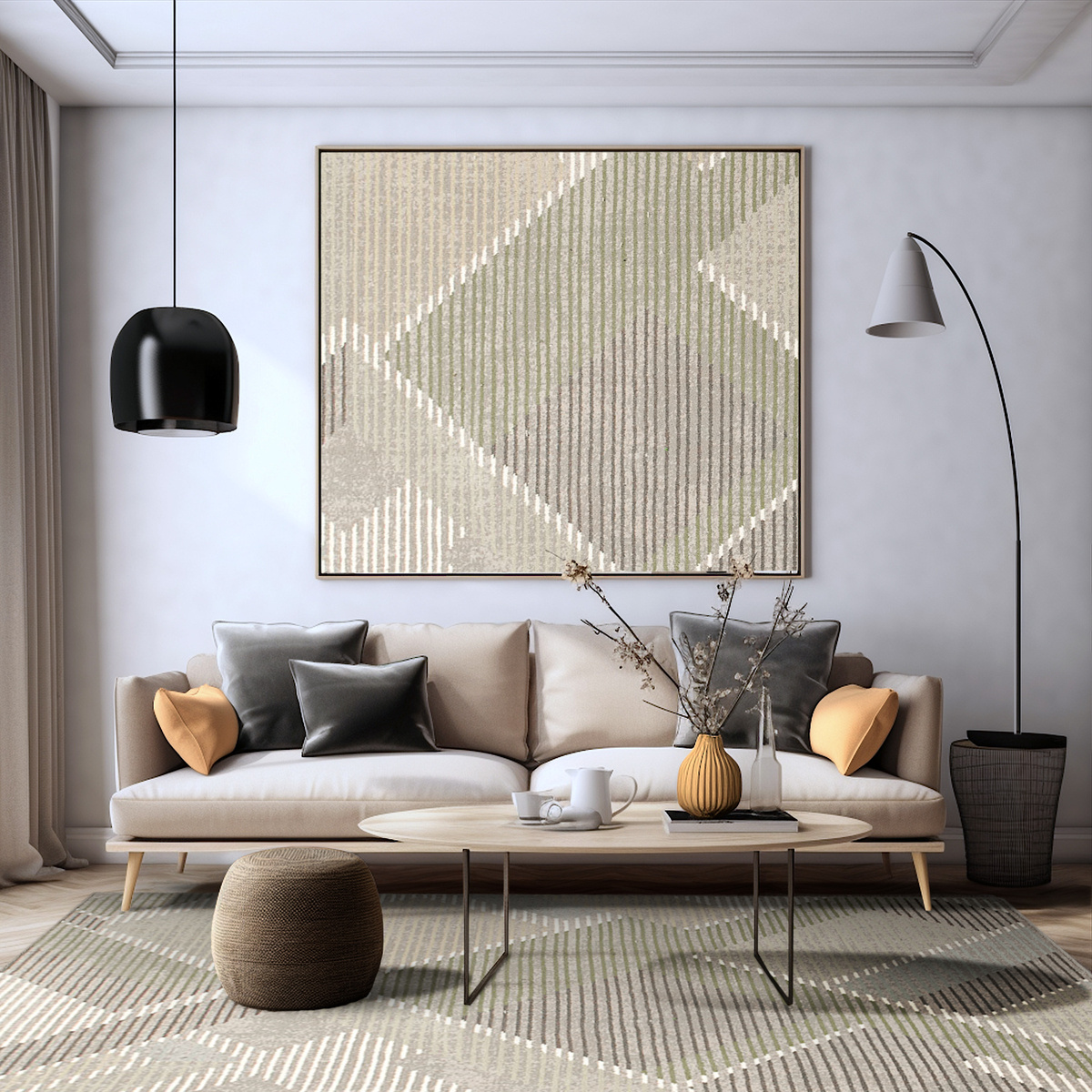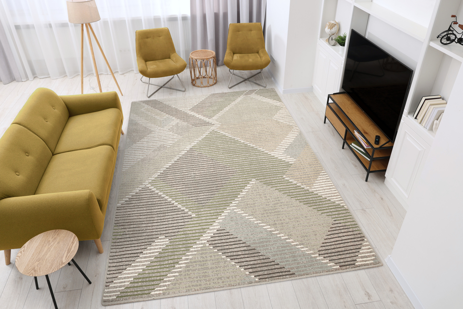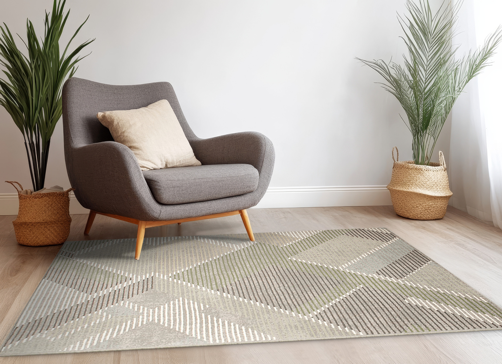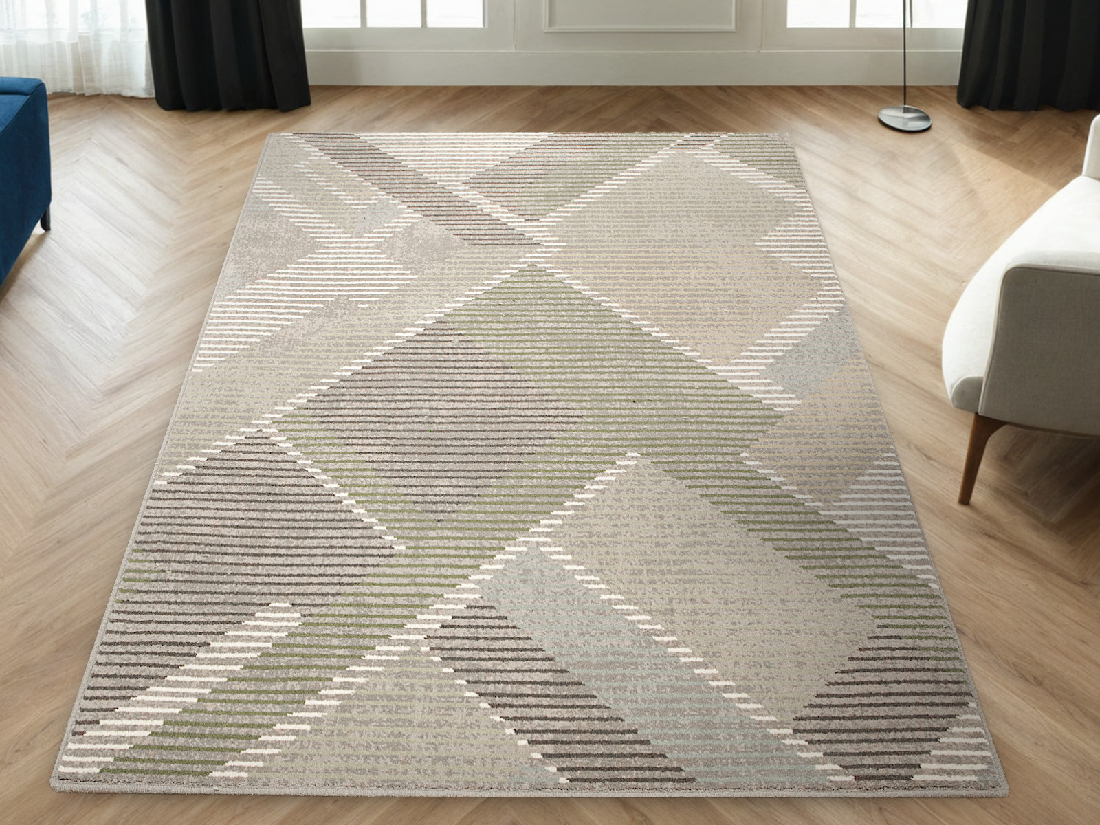 - Wełniany dywan Ballata od Agnelli z miękkim runem ozdobionym nowoczesnym, geometrycznym wzorem w szarościach, odcieniach zieleni, kremie, beżu i akcentami turkusu.