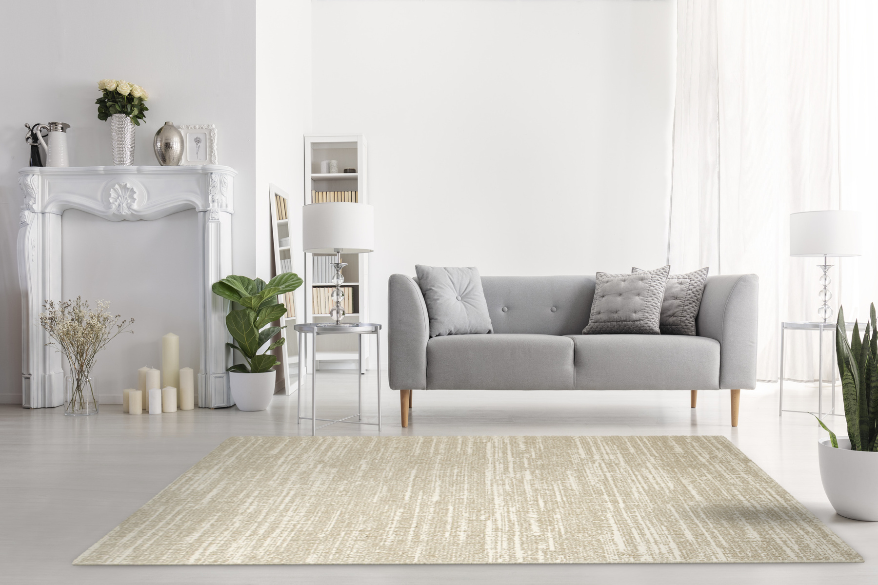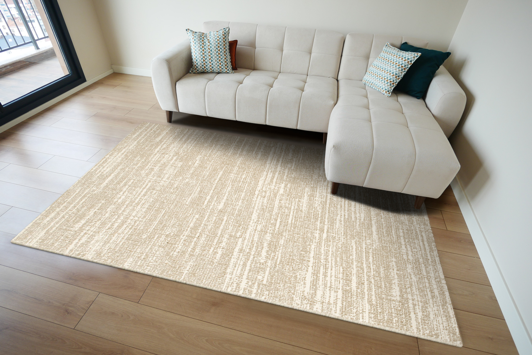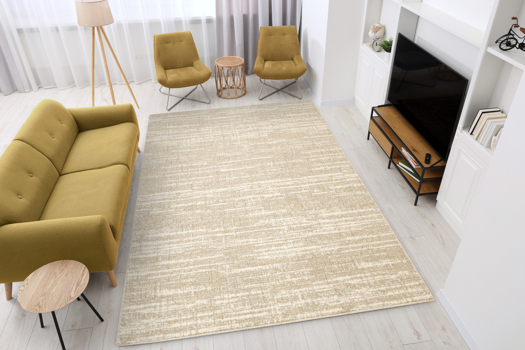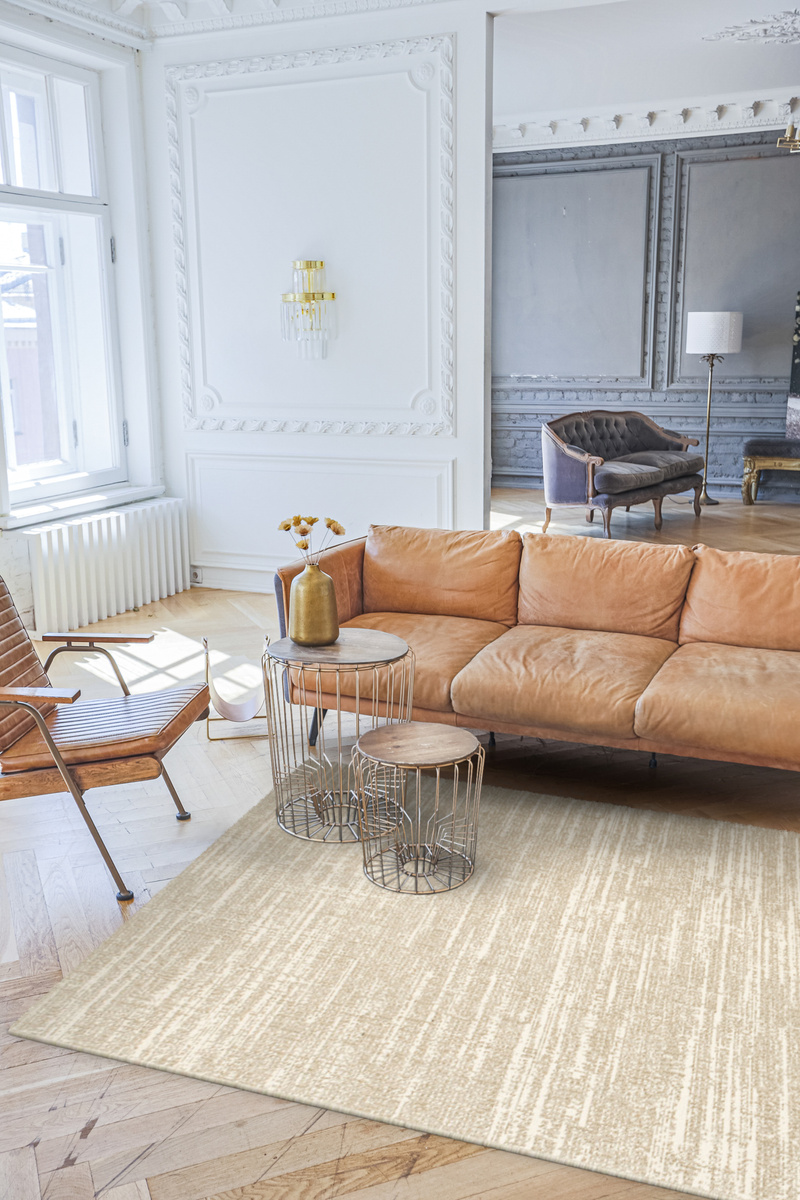 - Wełniany dywan Ballata od Agnelli z miękkim runem ozdobionym nowoczesnym, naturalnym wzorem w odcieniach kremach i beżach.