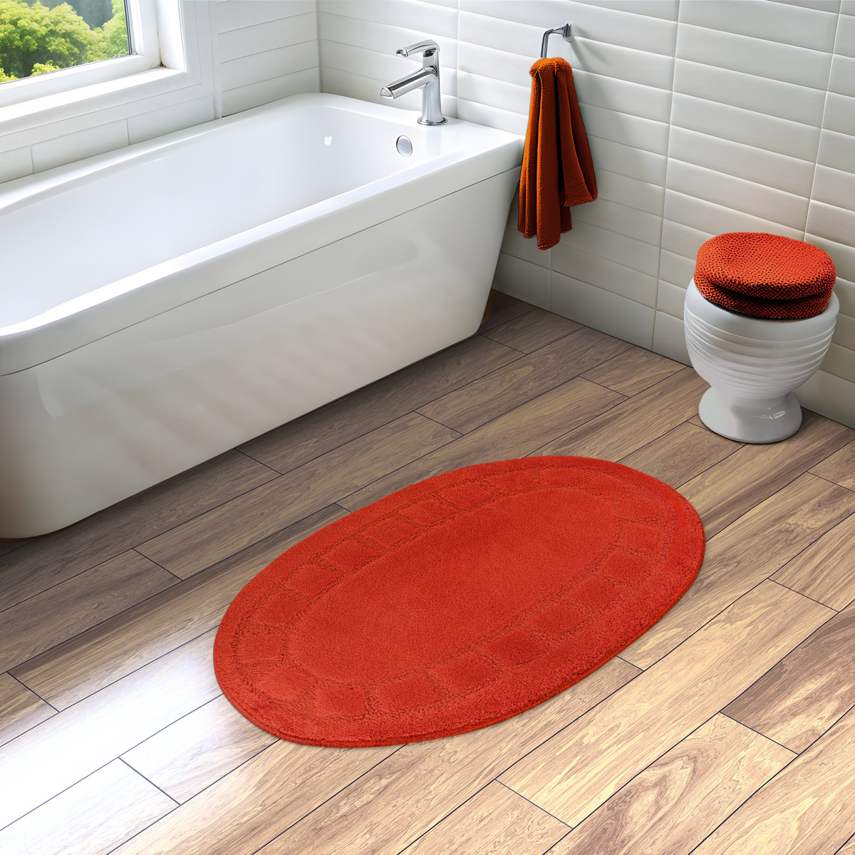 - Dywanik łazienkowy owalny Ocean o miękkim i przyjemnym w dotyku, dwupoziomowym runie w czerwieni, ze wzorem w geometrycznym i antypoślizgowym spodem.