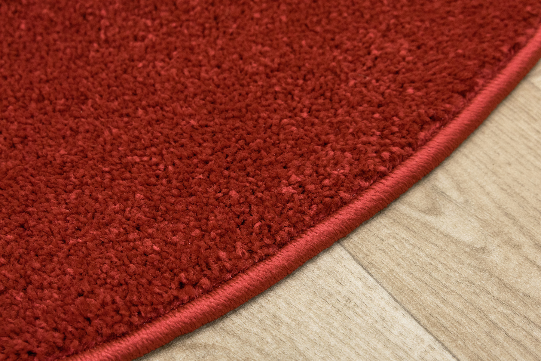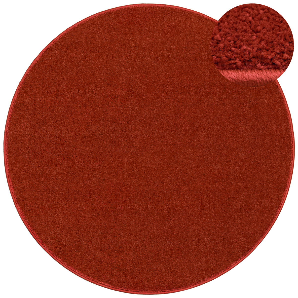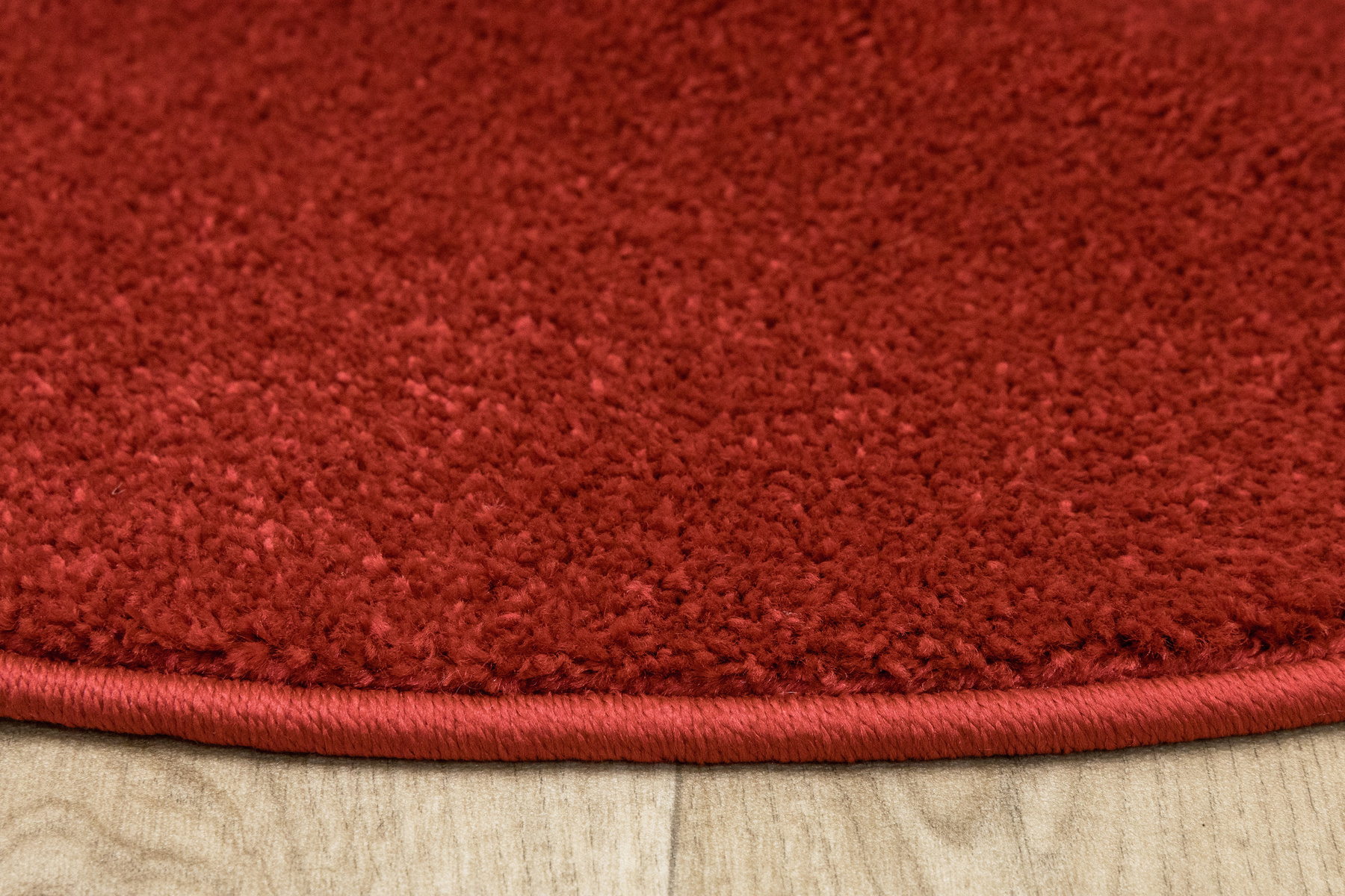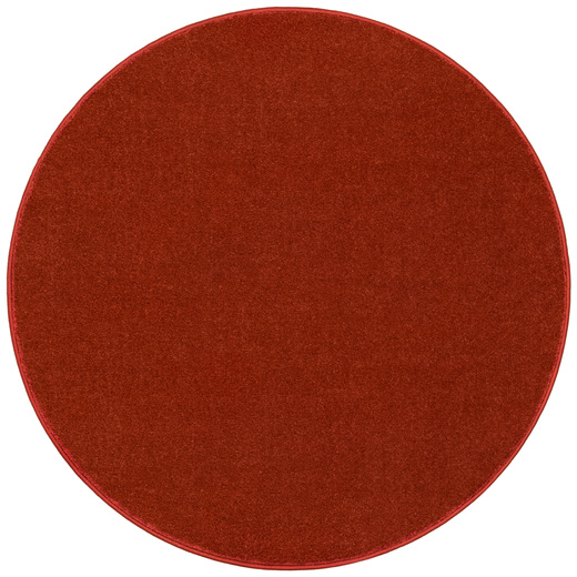 • Okrągły dywan Lima z jednobarwnym runem w czerwieni i spodem wykończonym jutą.