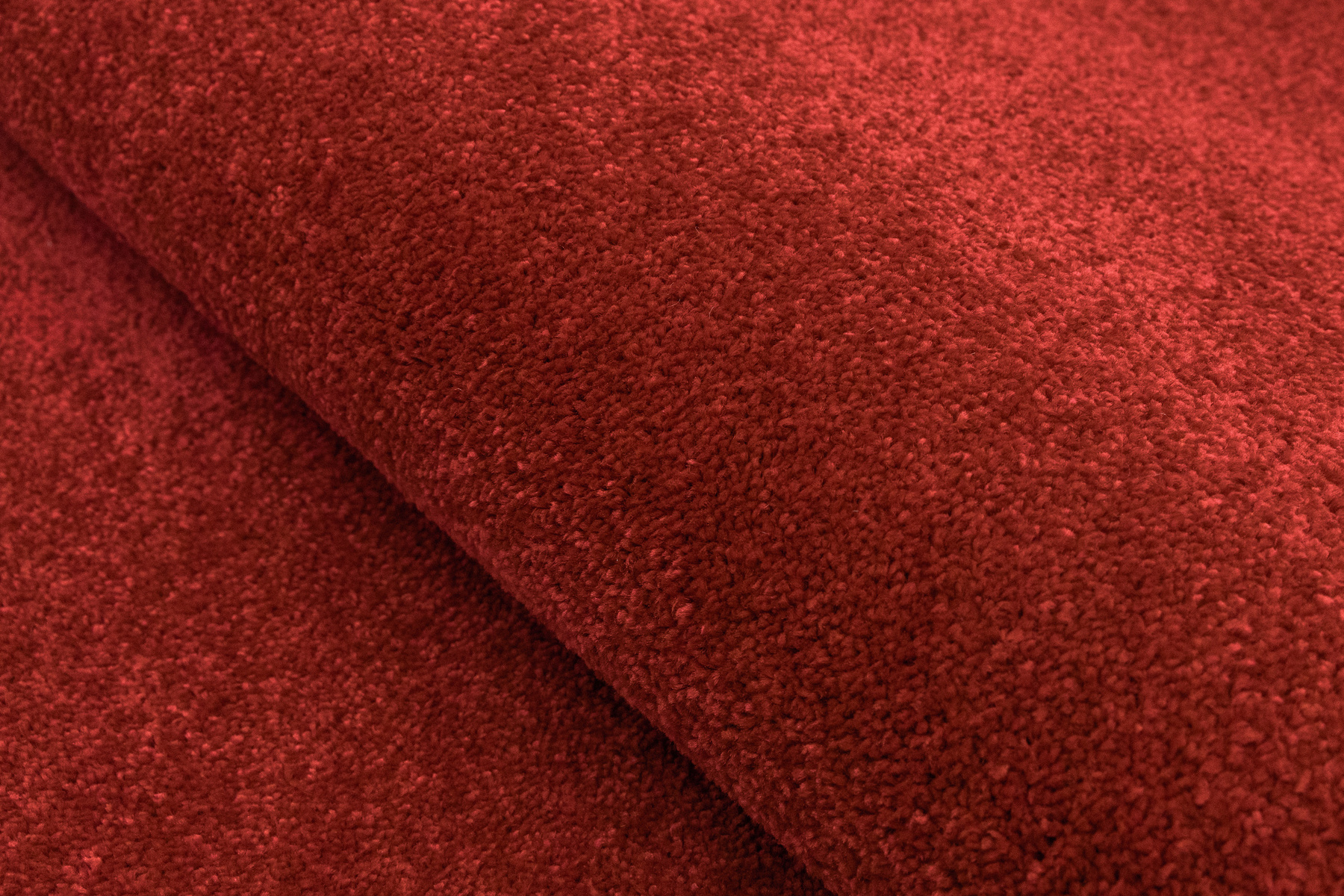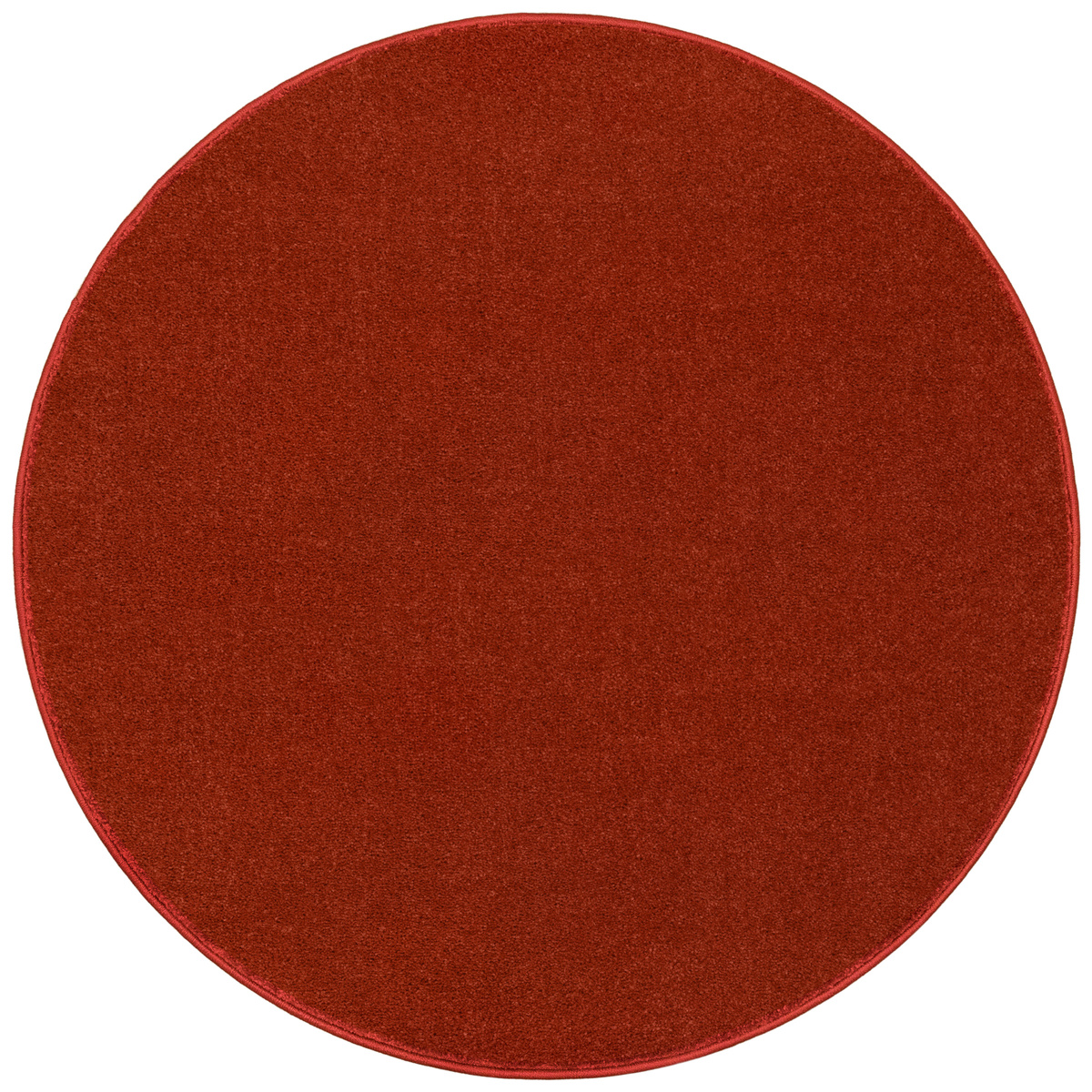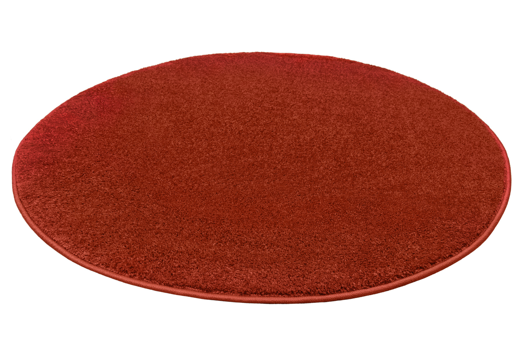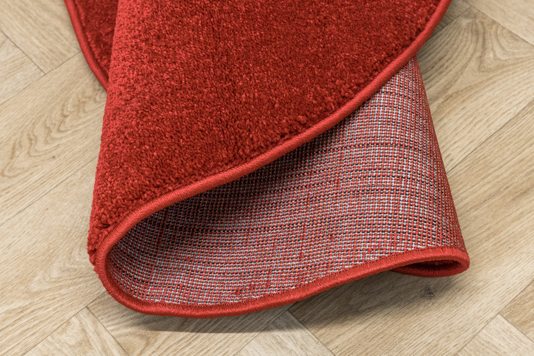• Okrągły dywan Lima z jednobarwnym runem w czerwieni i spodem wykończonym jutą.