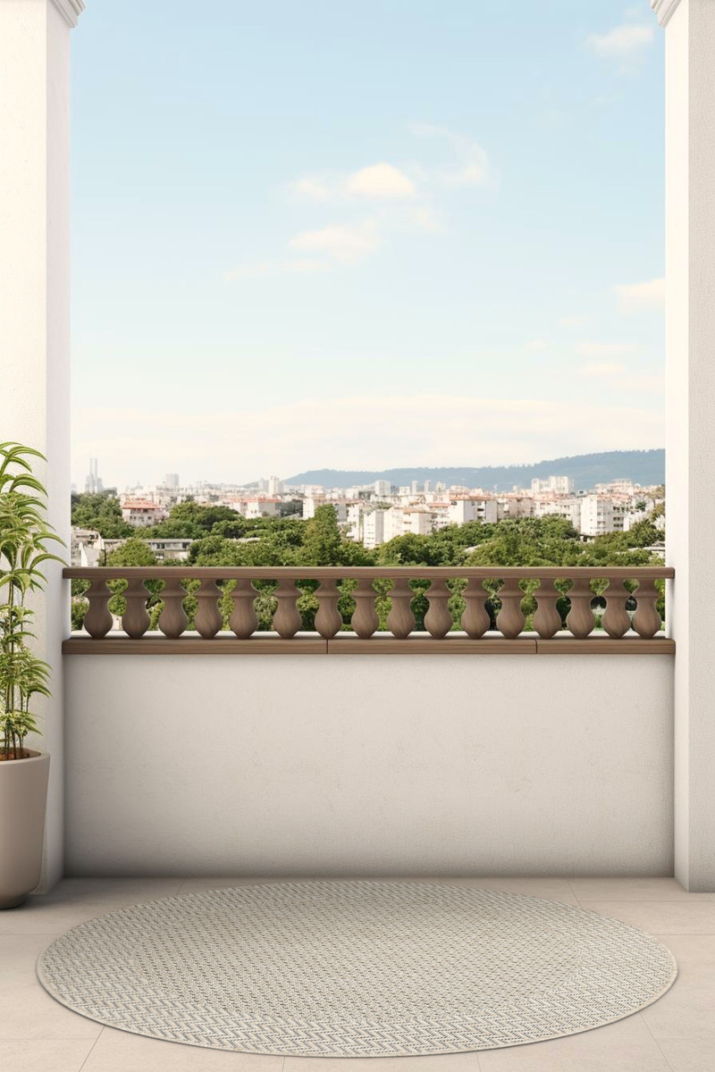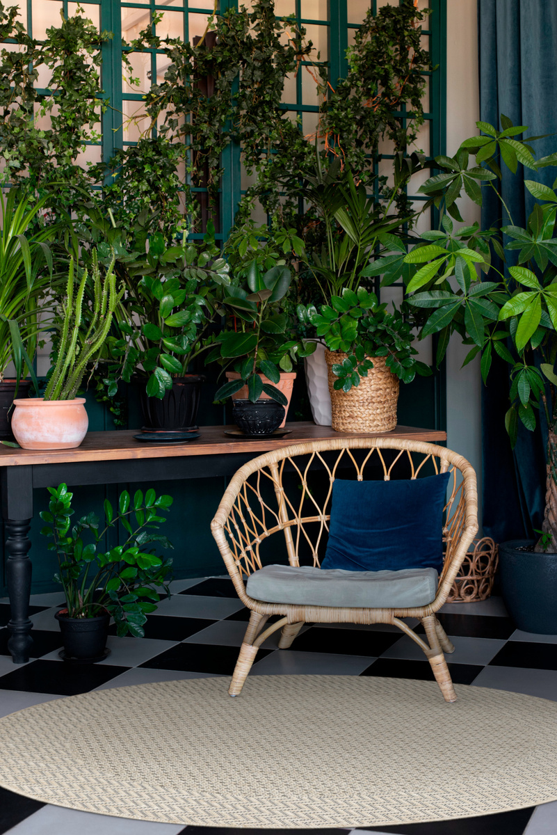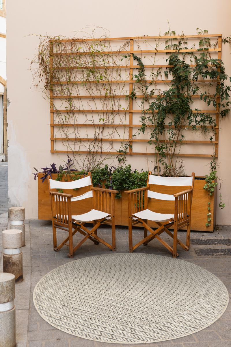 • Okrągły dywan sznurkowy Jeans z geometrycznym wzorem w jodełkę, w odcieniach beżu, kremu i antracytu który może być stosowany zarówno wewnątrz jak i na zewnątrz.