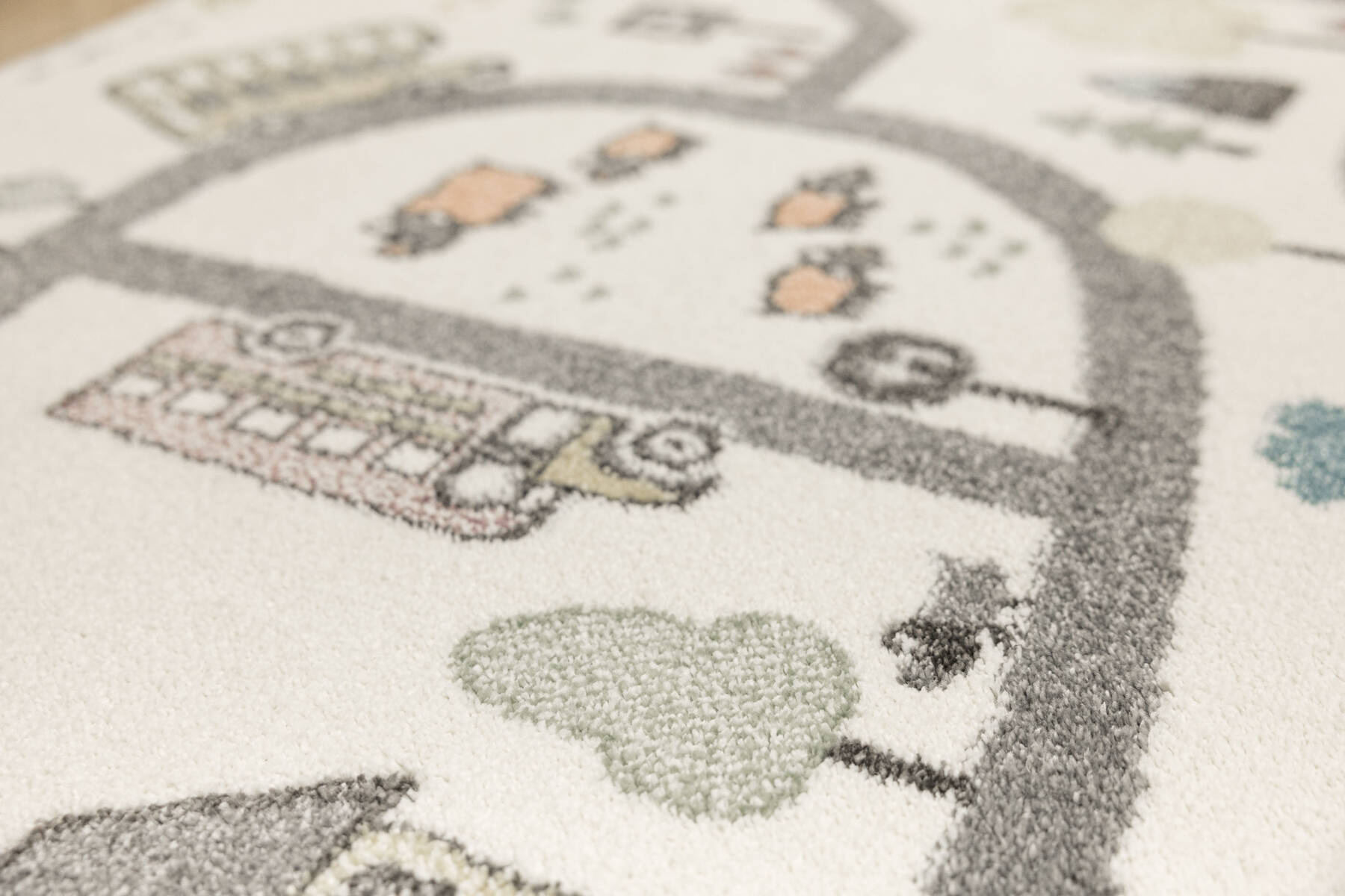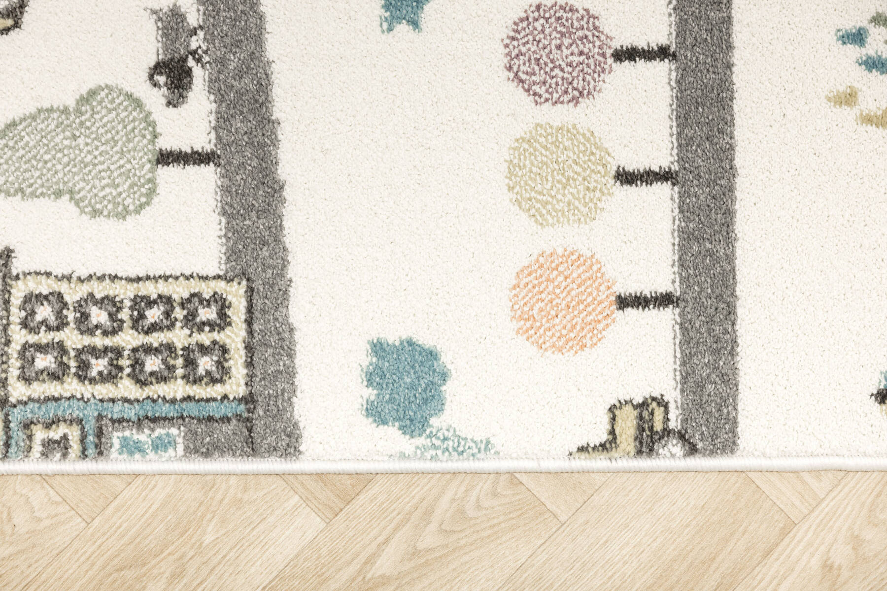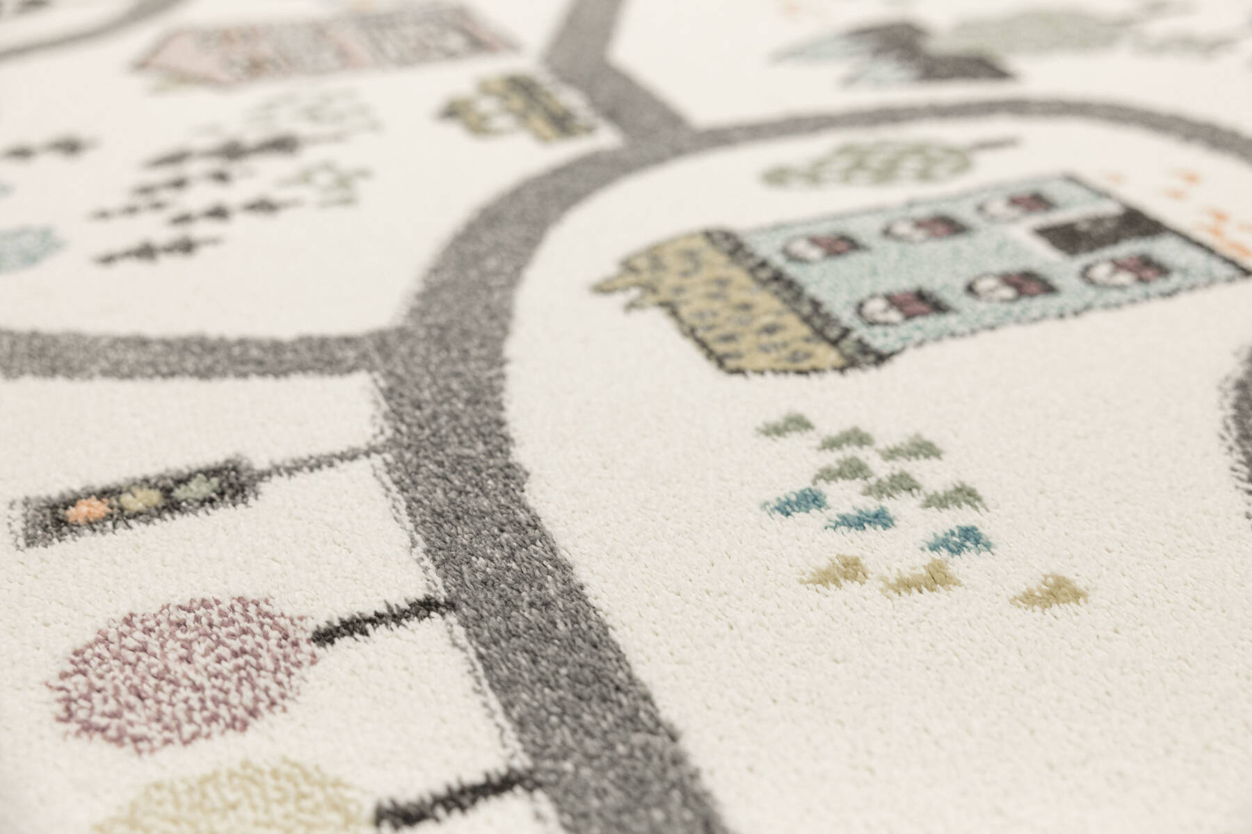 - Kolorowy dywan z wykładziny dziecięcej Lima z rysunkowym wzorem w uliczki z samochodzikami, domkami w odcieniach zieleni, turkusu, fioletu, żółci, szarości i kremu.