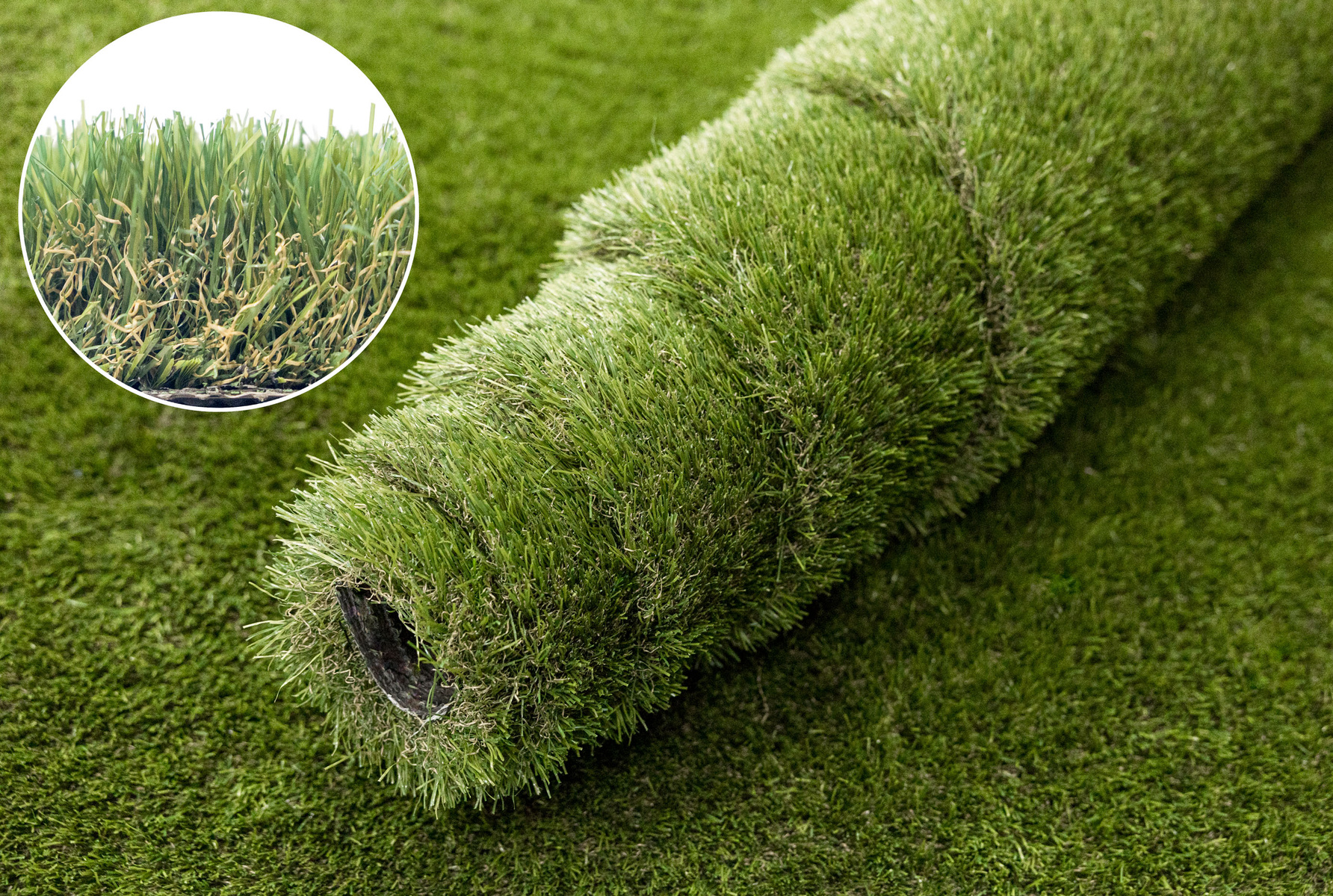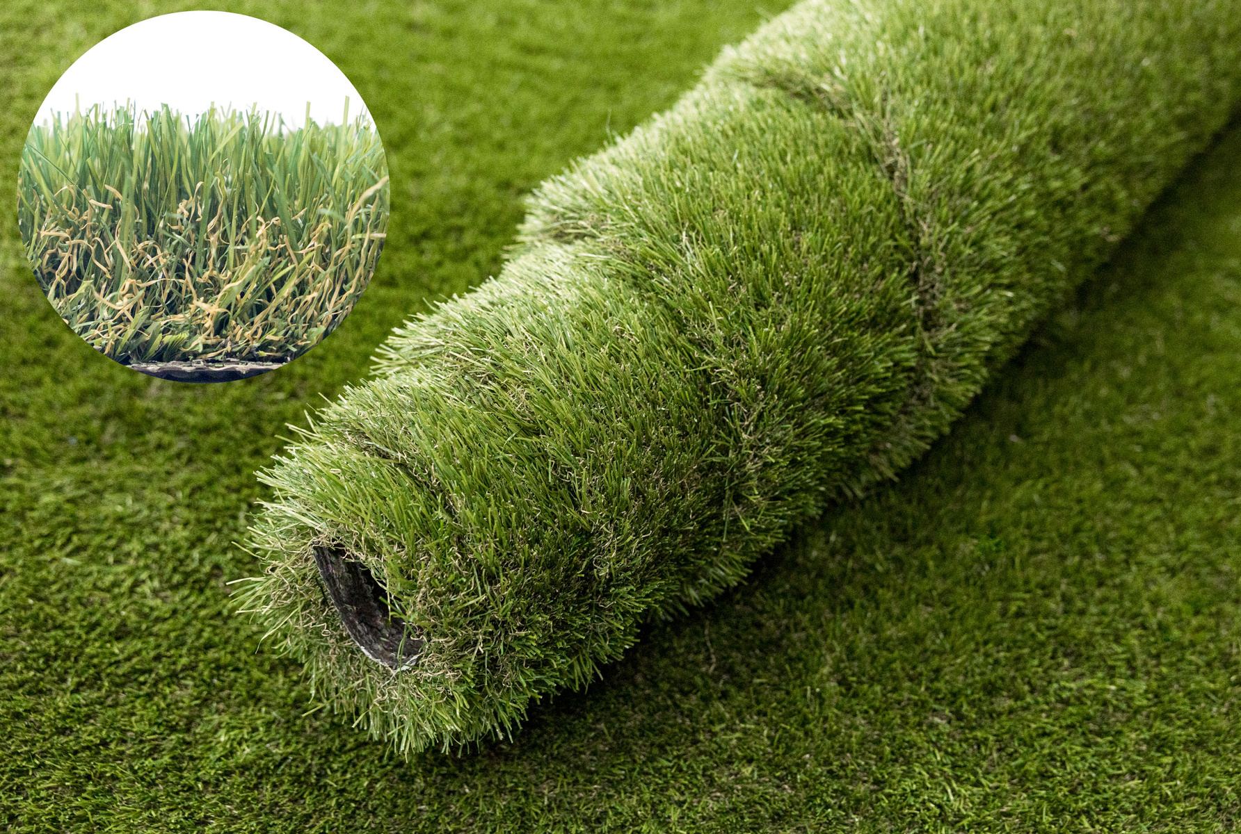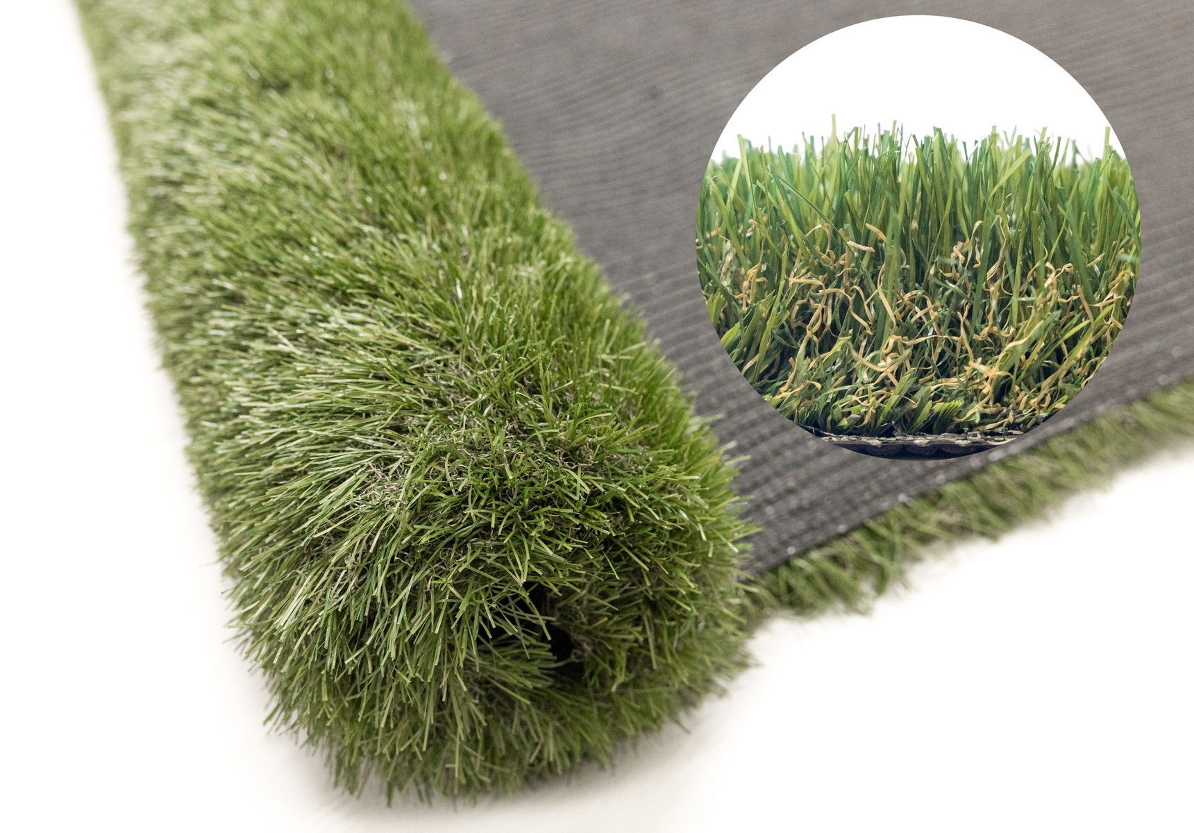 • Miękka i praktyczna sztuczna trawa Lucy o wysokości 44 mm w różnych odcieniach zieleni z dodatkiem jasnego beżu o różnych profilach, kształtach włosia.