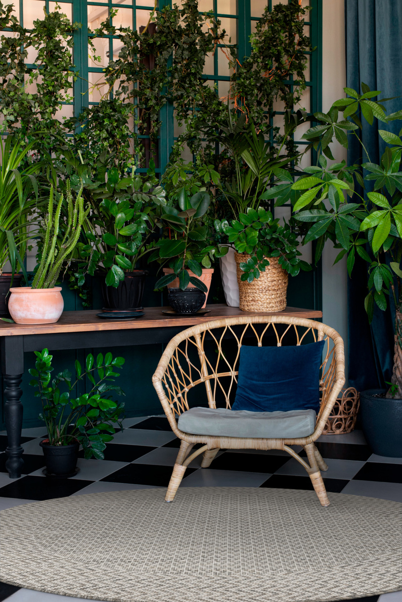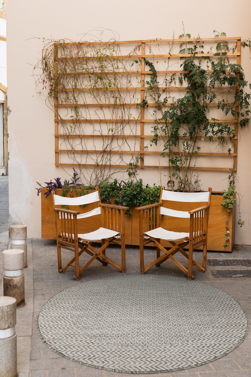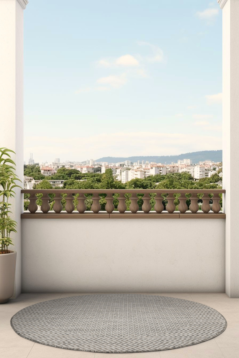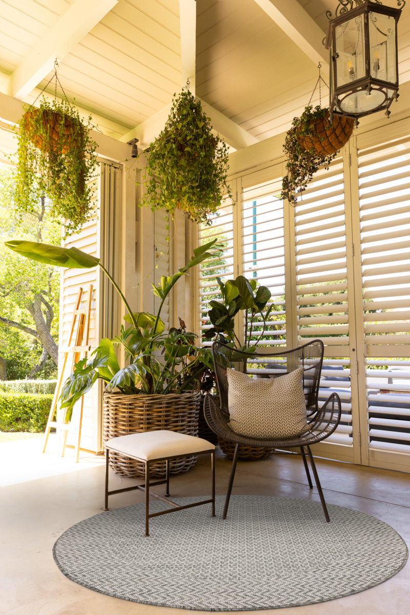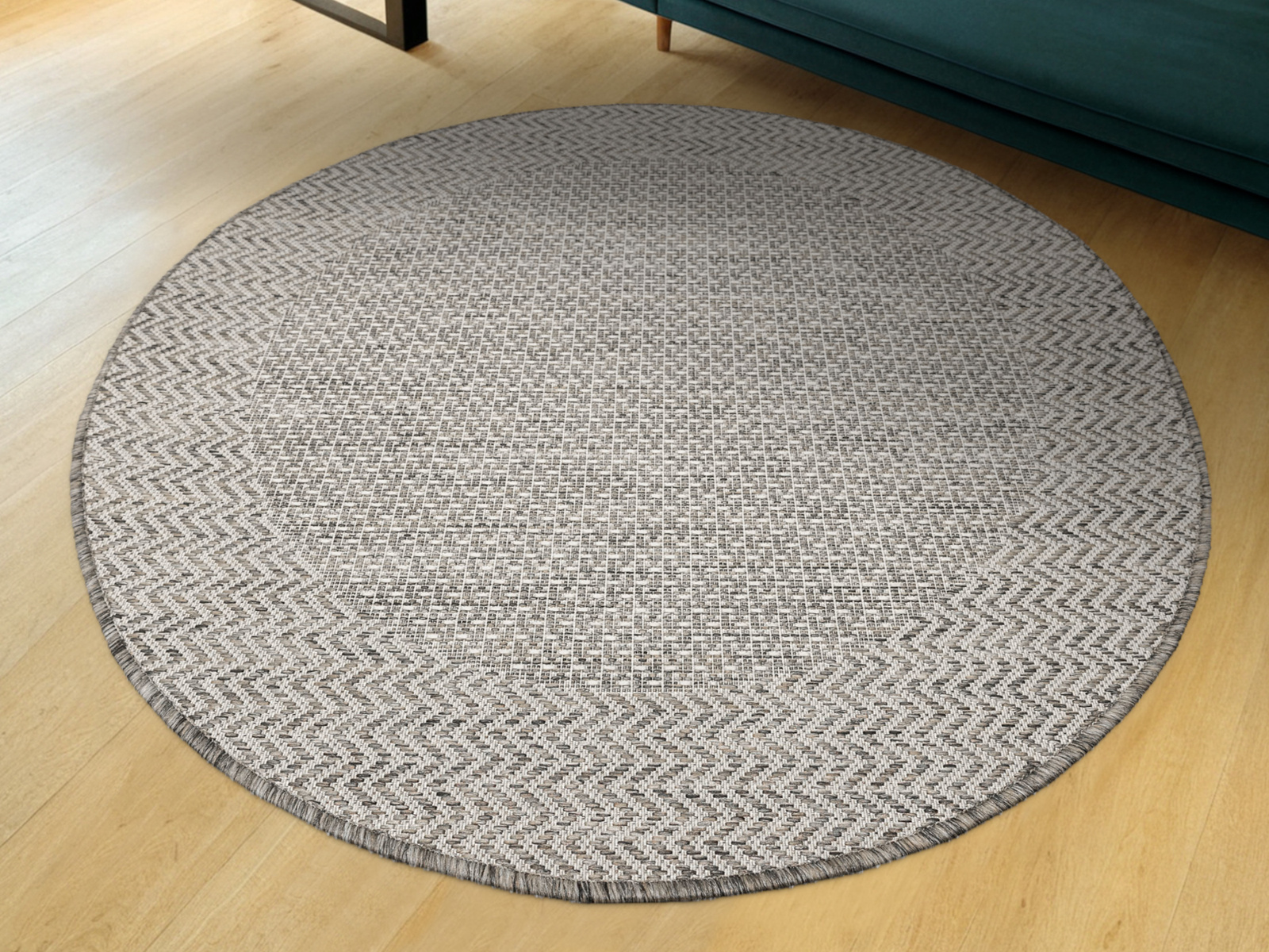 - Okrągły dywan sznurkowy Jeans z geometrycznym wzorem w jodełkę, w odcieniach beżu, kremu i antracytu który może być stosowany zarówno wewnątrz jak i na zewnątrz.