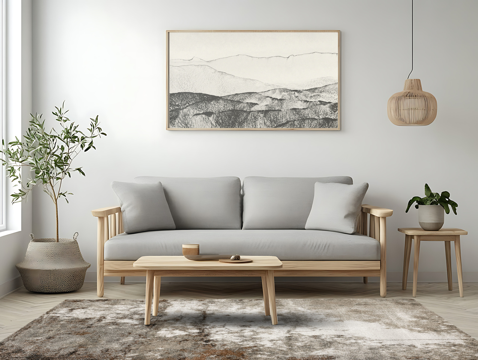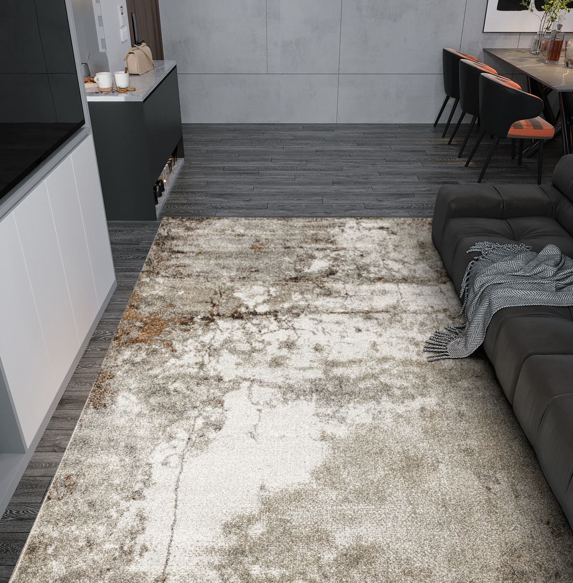 - Miękki i przyjemny w dotyku dywan Ponte o runie ozdobionym nowoczesnym wzorem w szarościach z akcentami kremu, srebrnego, beżu, brązu i czerni. Spód wykończony jutą.