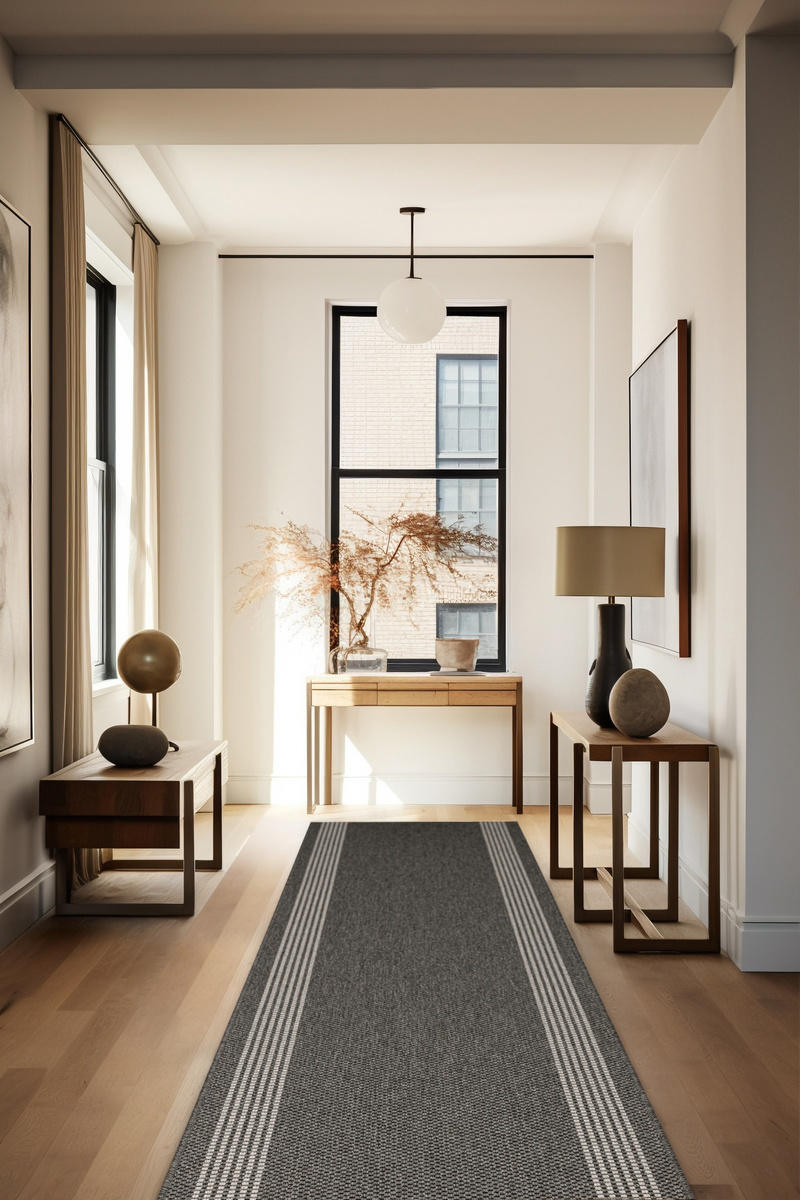 - Chodnik sznurkowy Natura Loper o runie ze wzorem geometrycznym z motywem pasków w odcieniach szarości i kremu oraz filcowym podkładem typu Eco Grip o właściwościach antypoślizgowych.