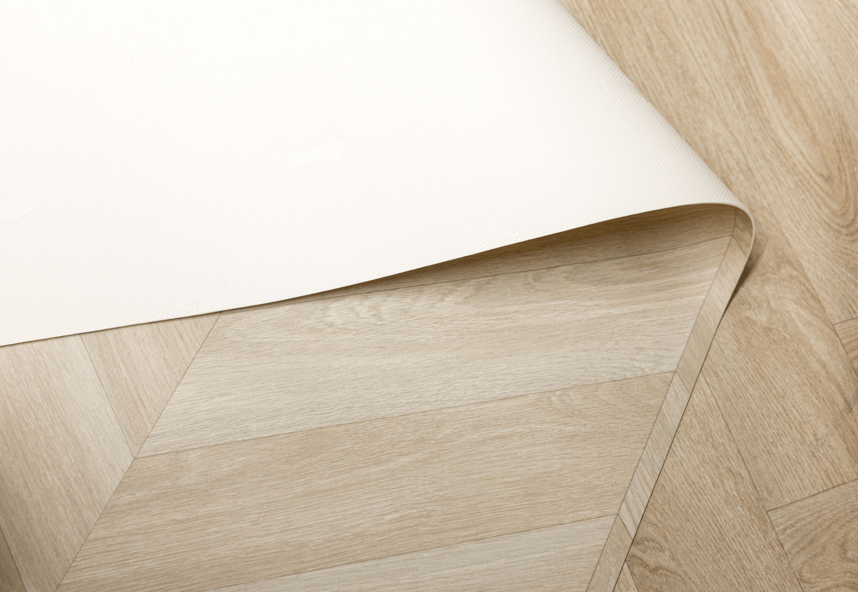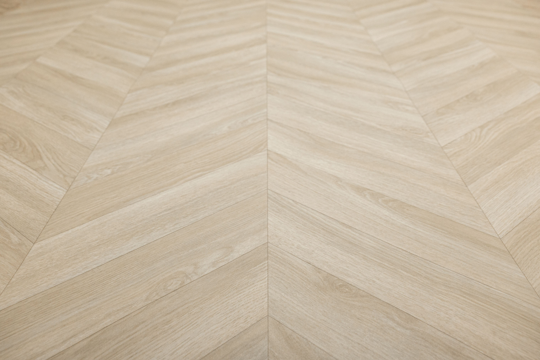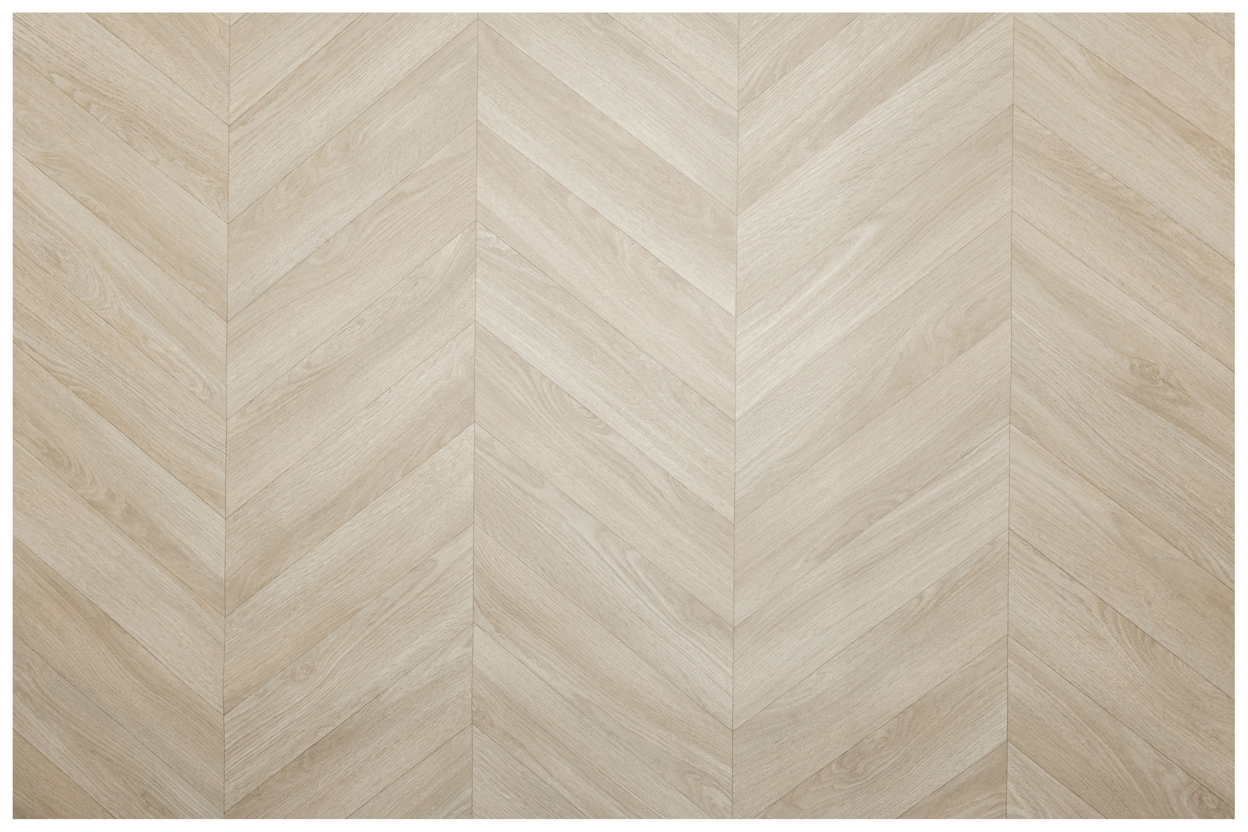 - Elastyczna wykładzina podłogowa PCV Ultimate Cornelia imitująca wzorem drewniany parkiet ułożony w jodełkę w odcieniach beżu, kremu z akcentami brązu.