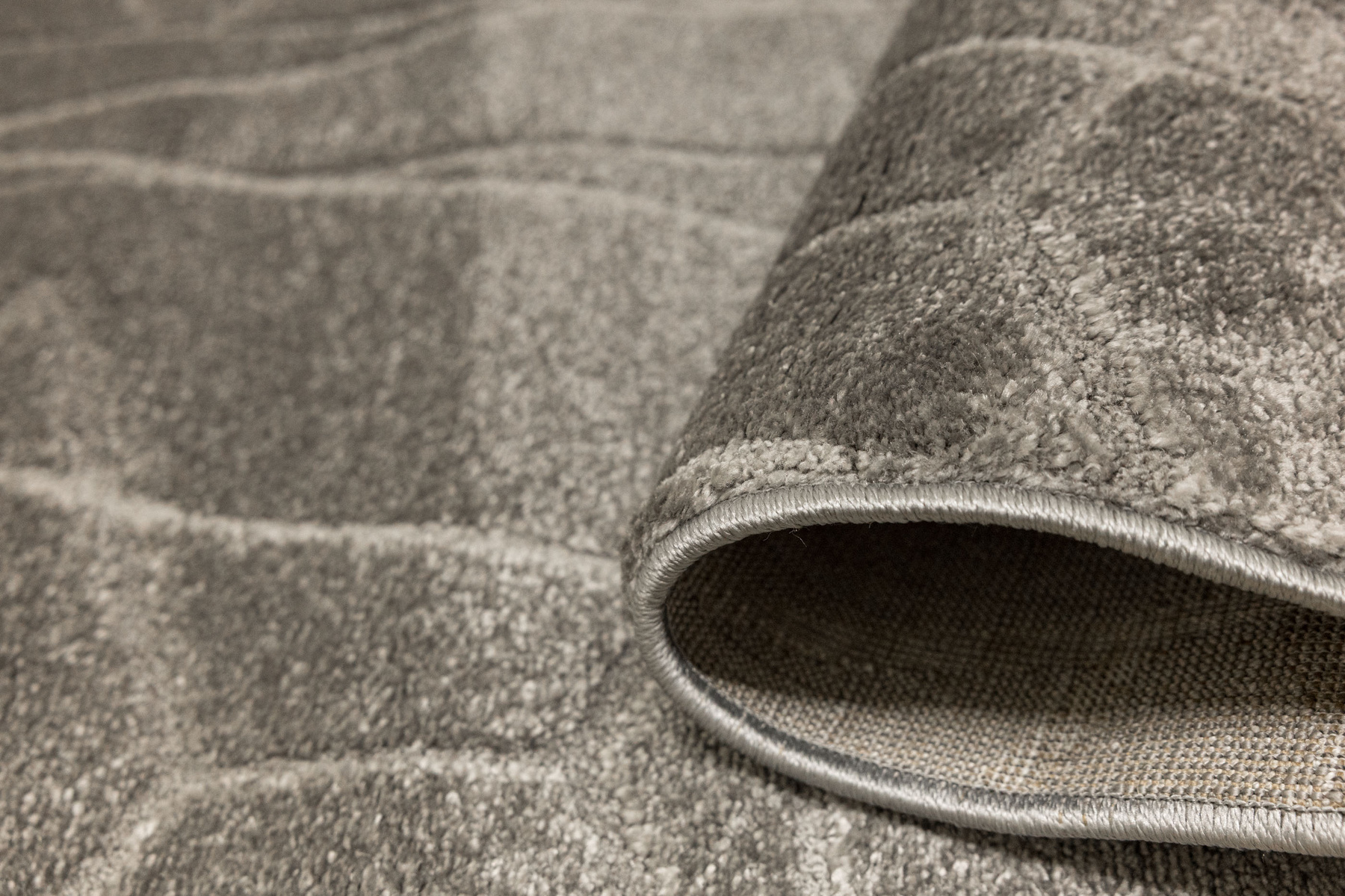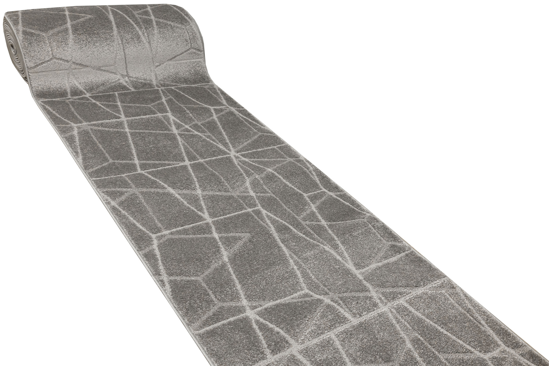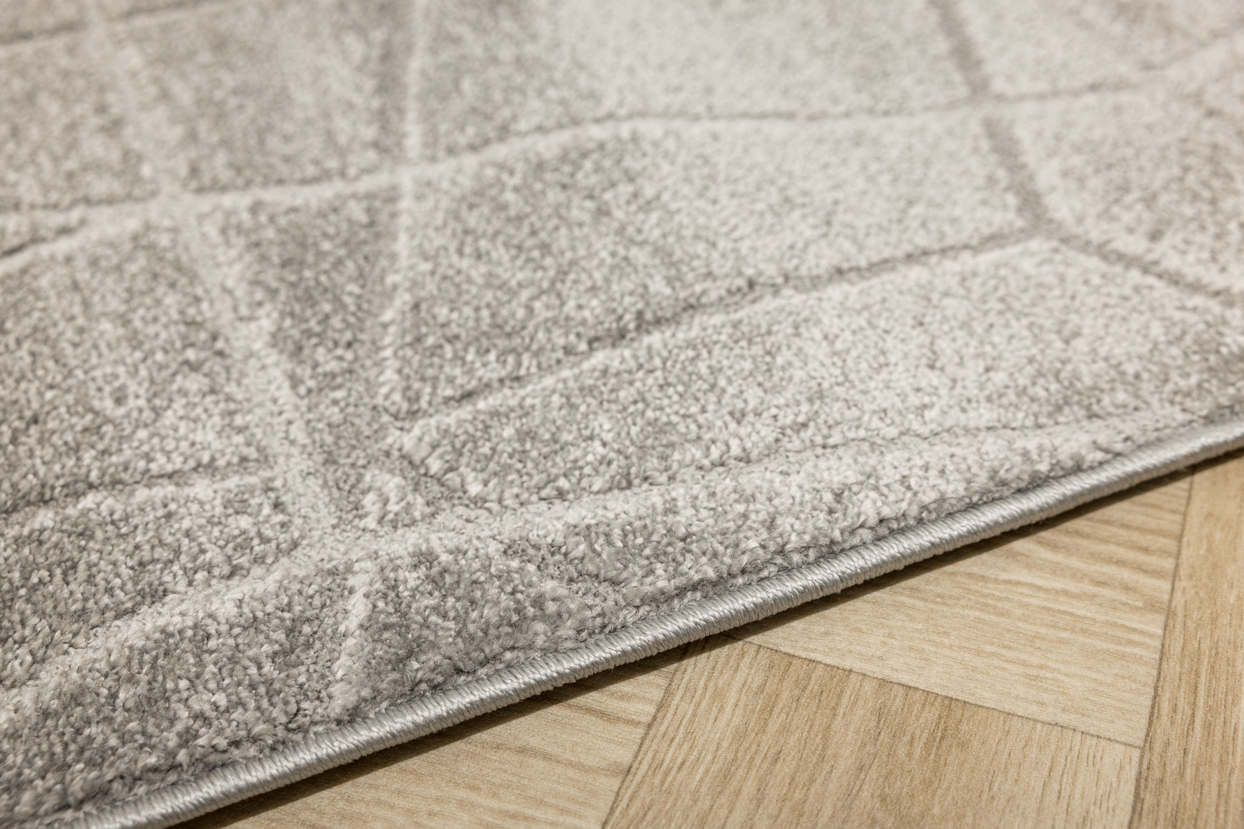 • Miękki i przyjemny w dotyku chodnik dywanowy Aruba o dwupoziomowym runie w odcieniach szarości, z geometrycznym wzorem ze spodem wykończonym jutą.