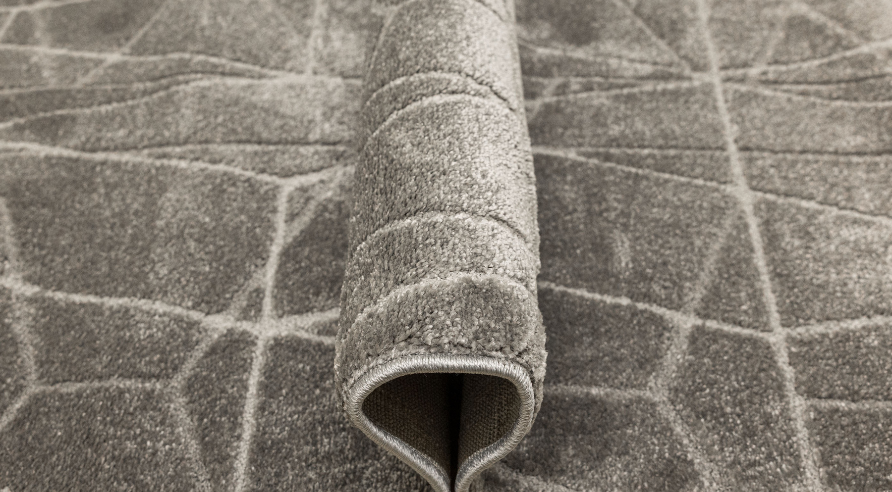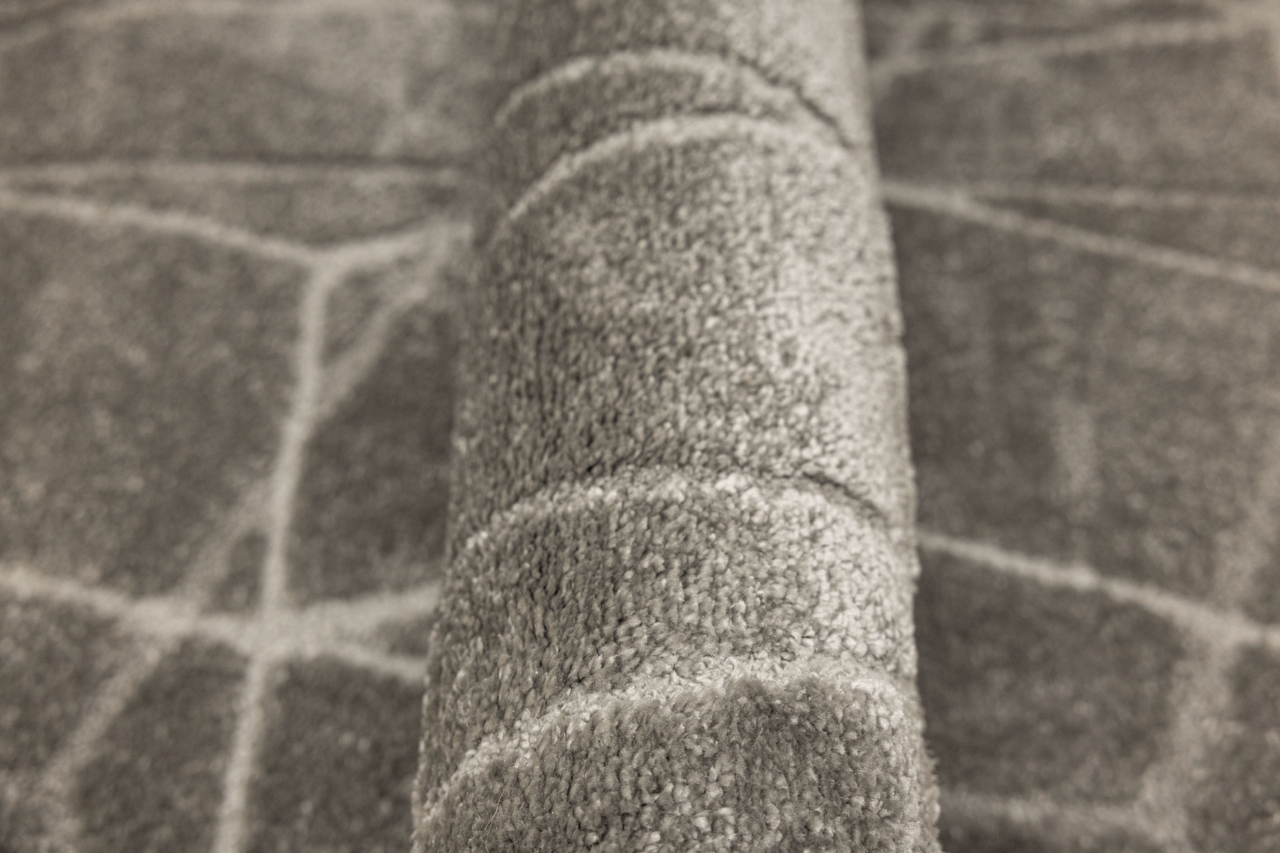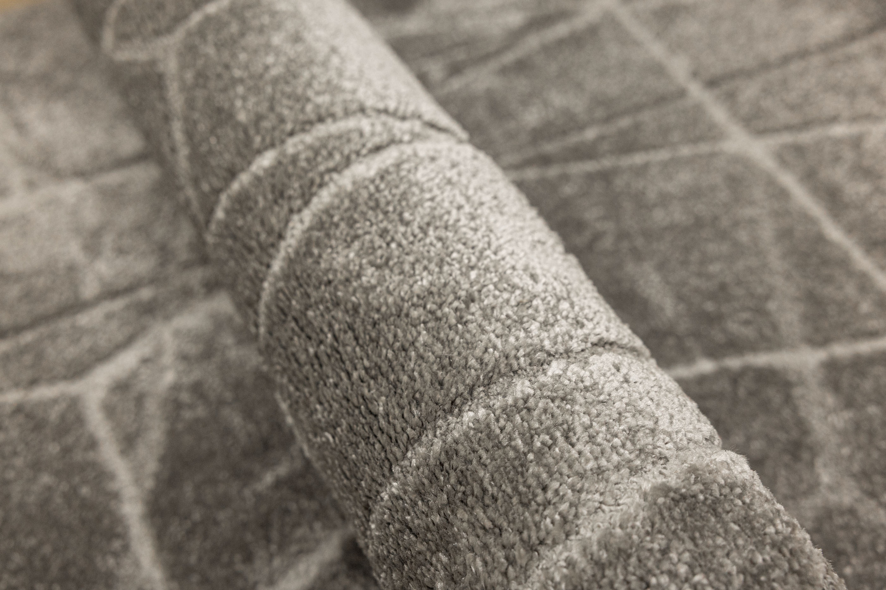 • Miękki i przyjemny w dotyku chodnik dywanowy Aruba o dwupoziomowym runie w odcieniach szarości, z geometrycznym wzorem ze spodem wykończonym jutą.