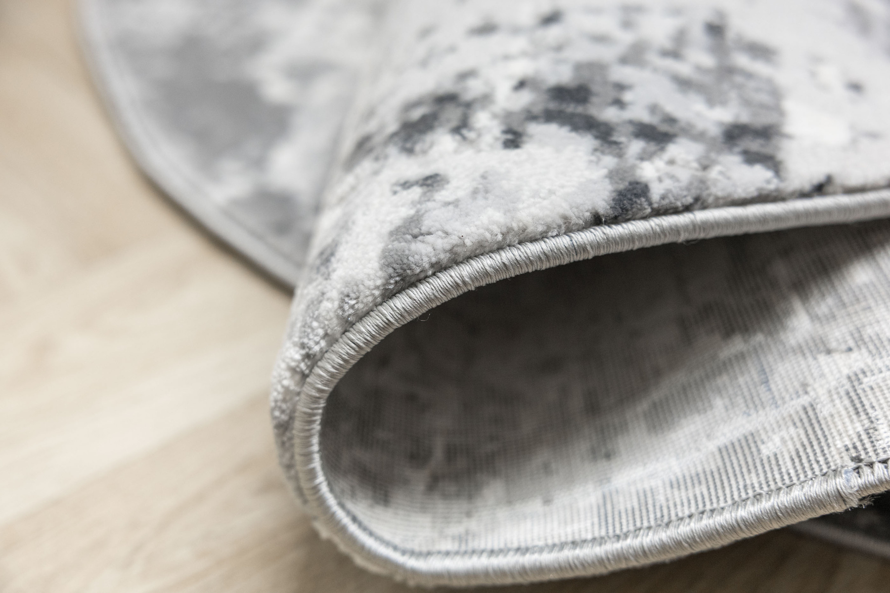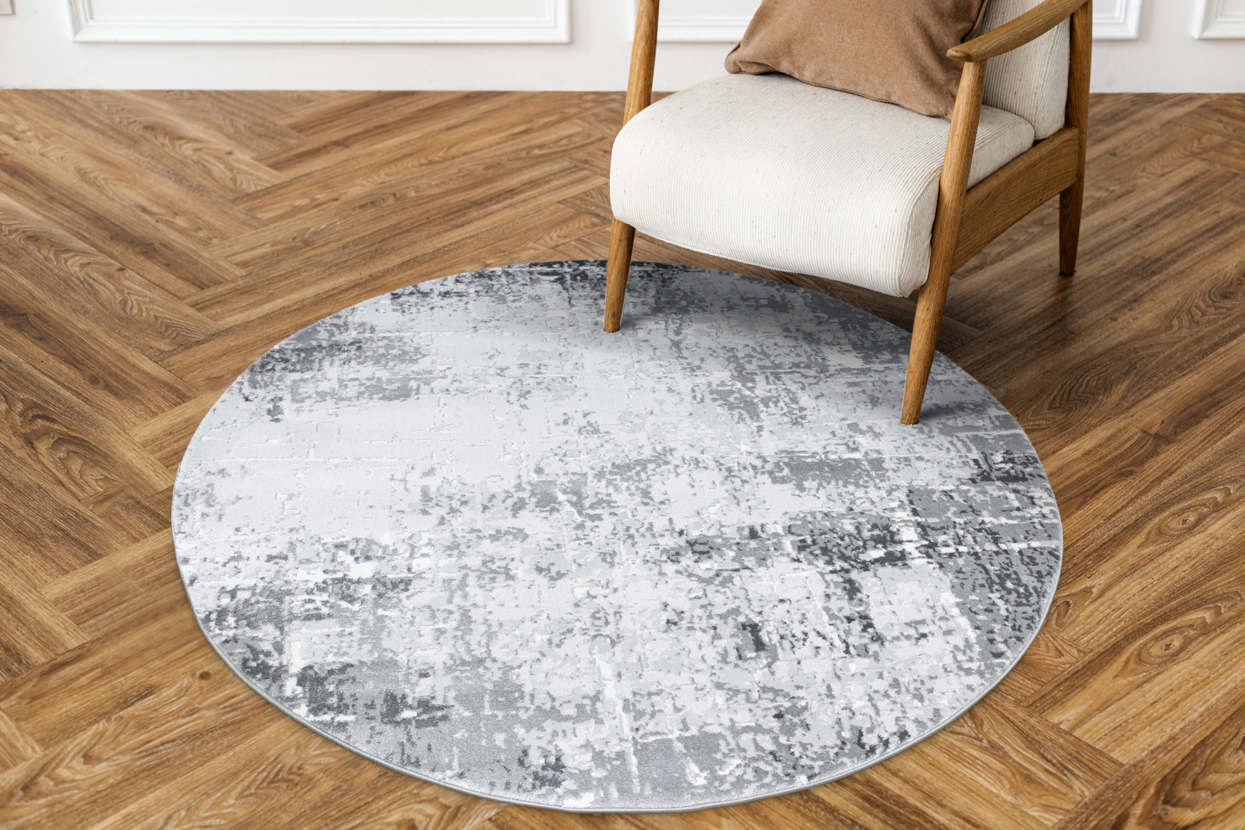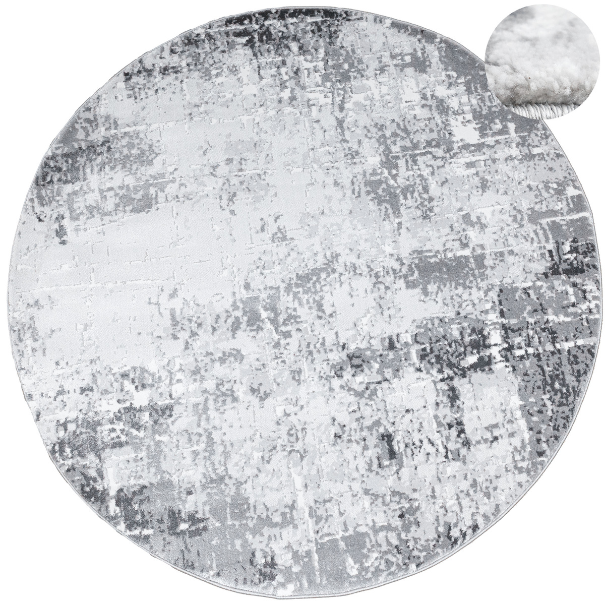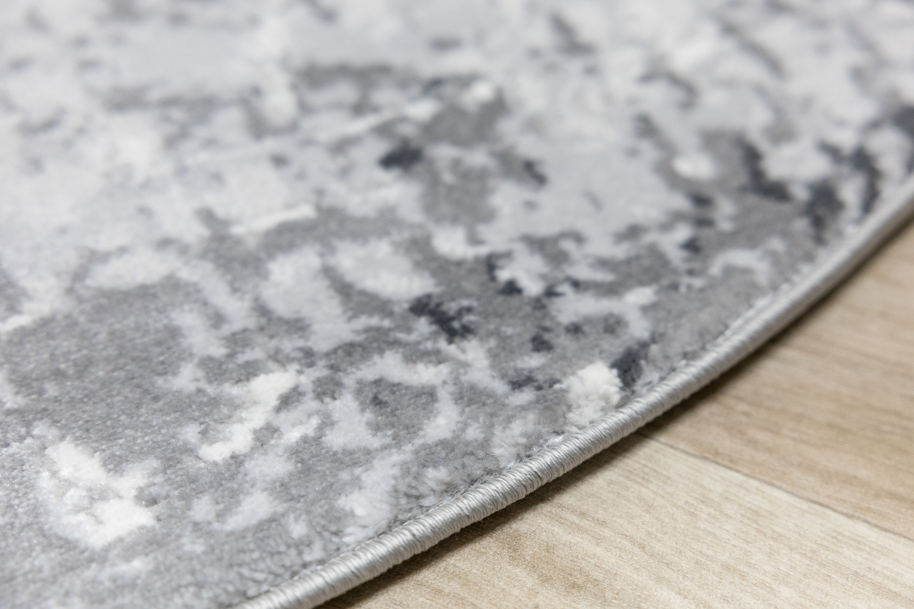 • Okrągły luksusowy dywan Nantes o mięciutkim, lekko lśniącym, dwupoziomowym runie z przecieranym wzorem w stylu abstrakcyjnym, w odcieniach szarości i kremu, ze spodem wykończonym bawełną.