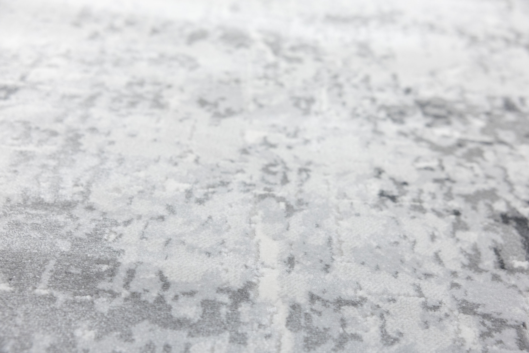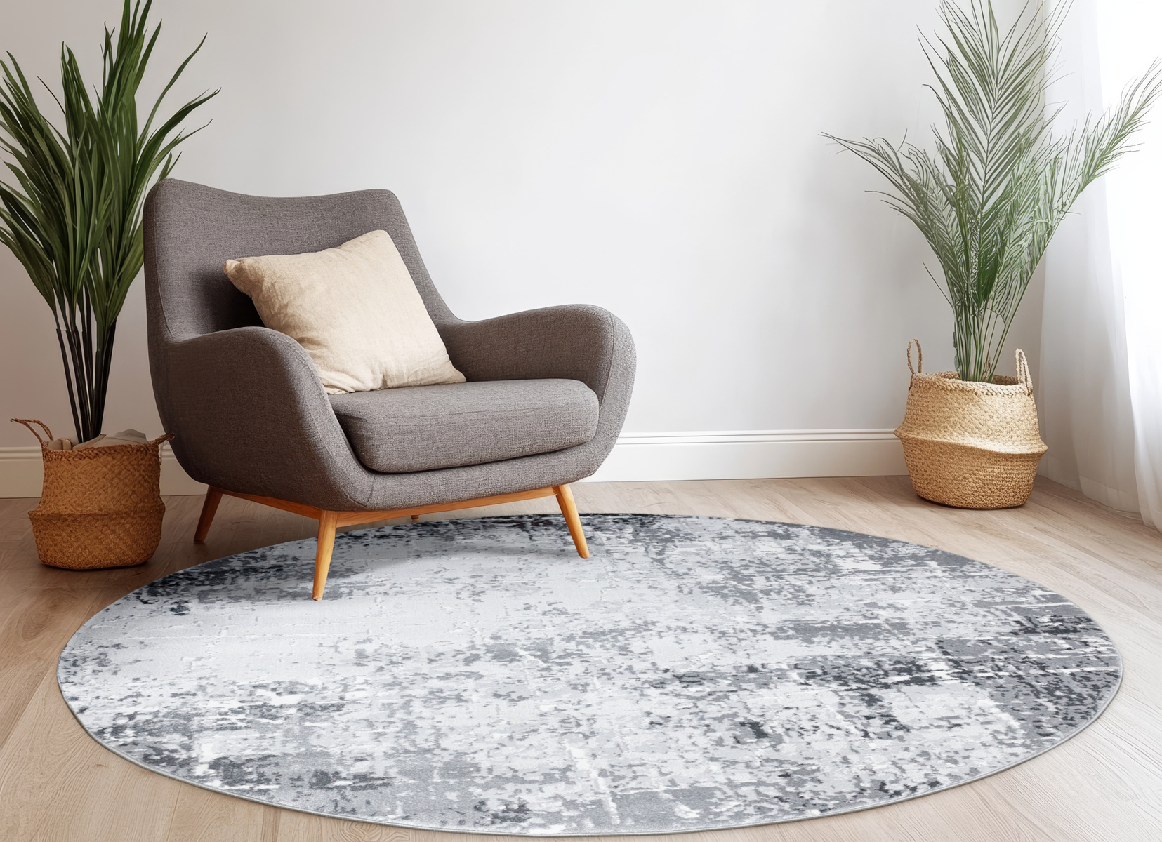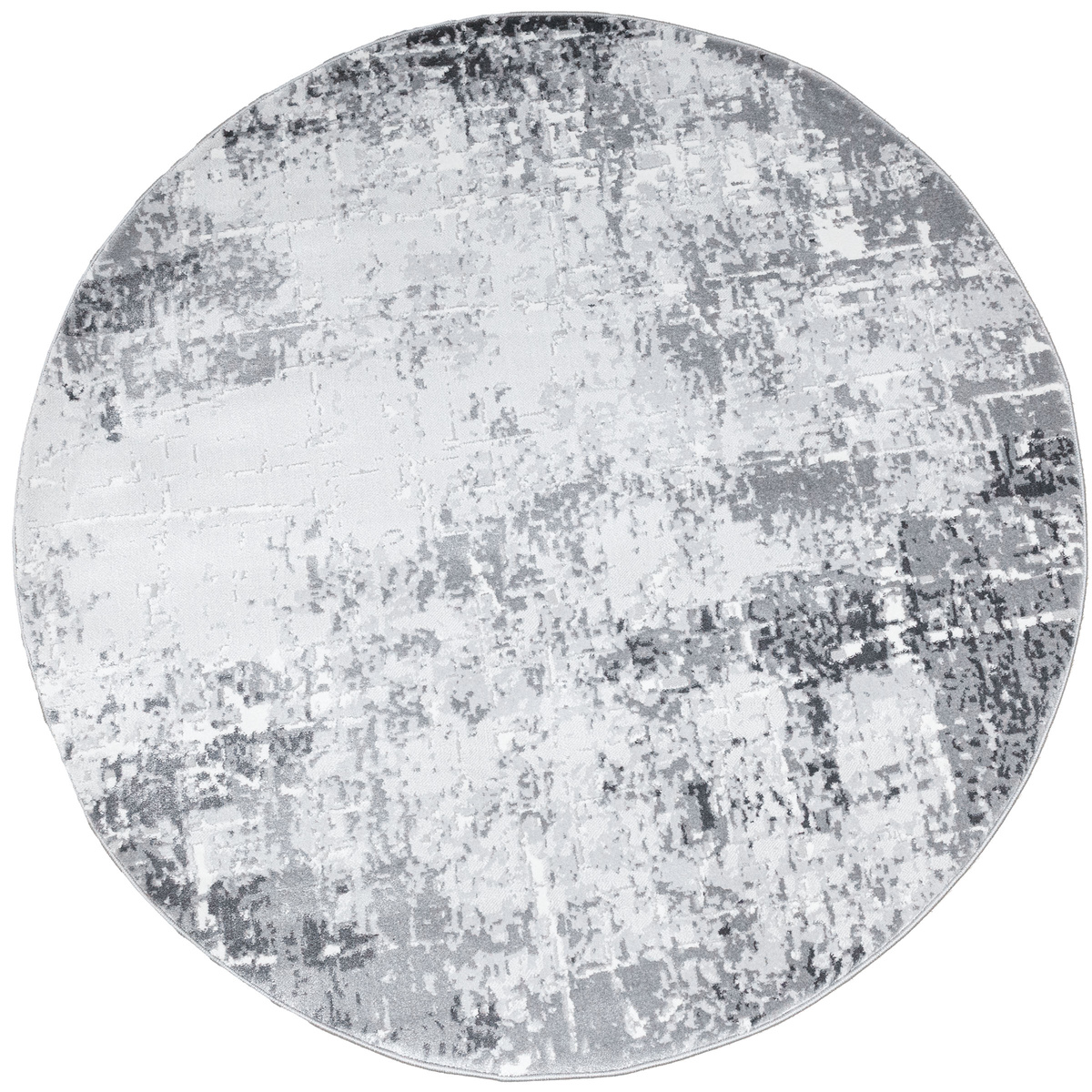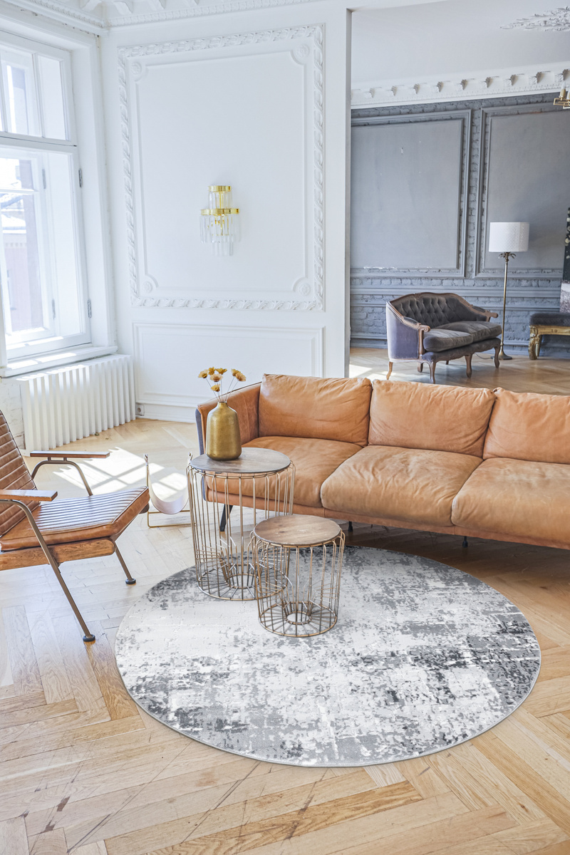 • Okrągły luksusowy dywan Nantes o mięciutkim, lekko lśniącym, dwupoziomowym runie z przecieranym wzorem w stylu abstrakcyjnym, w odcieniach szarości i kremu, ze spodem wykończonym bawełną.