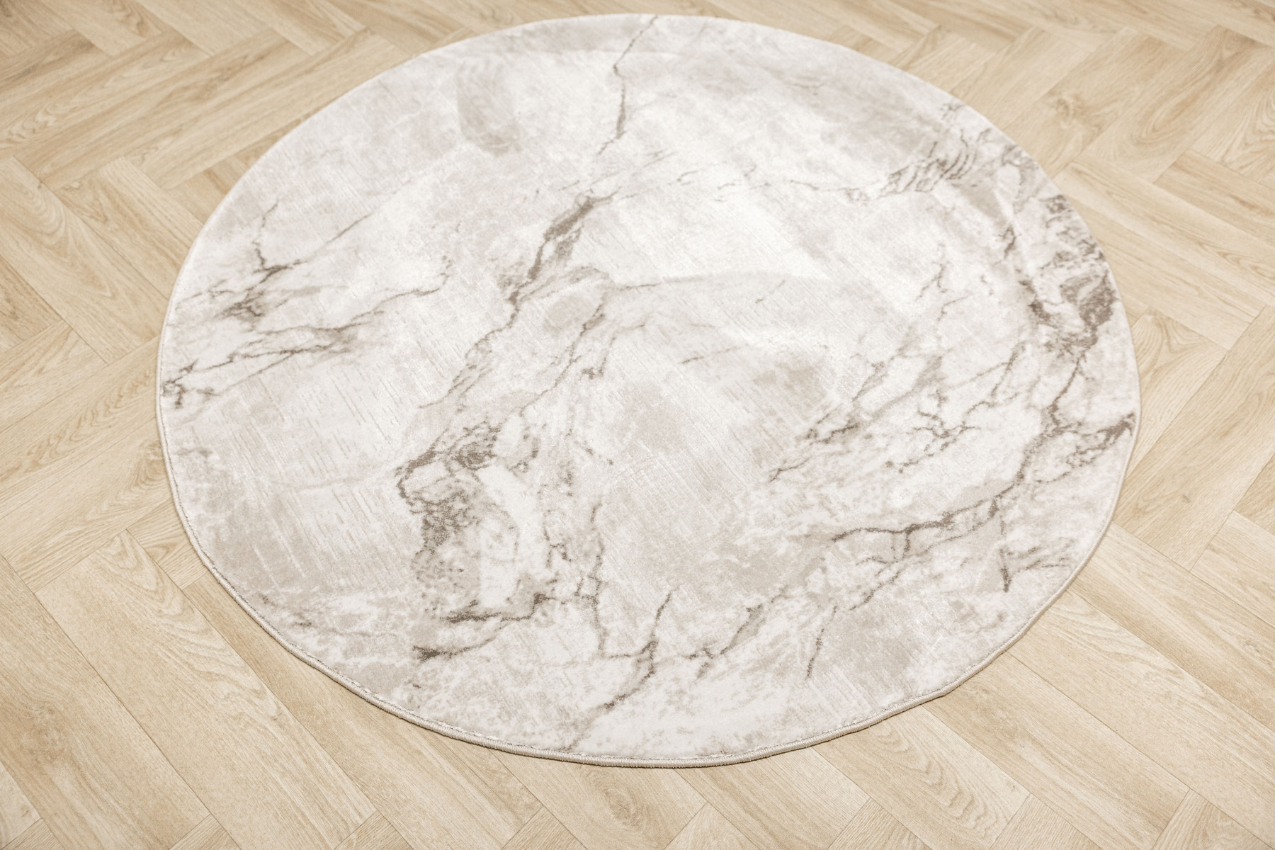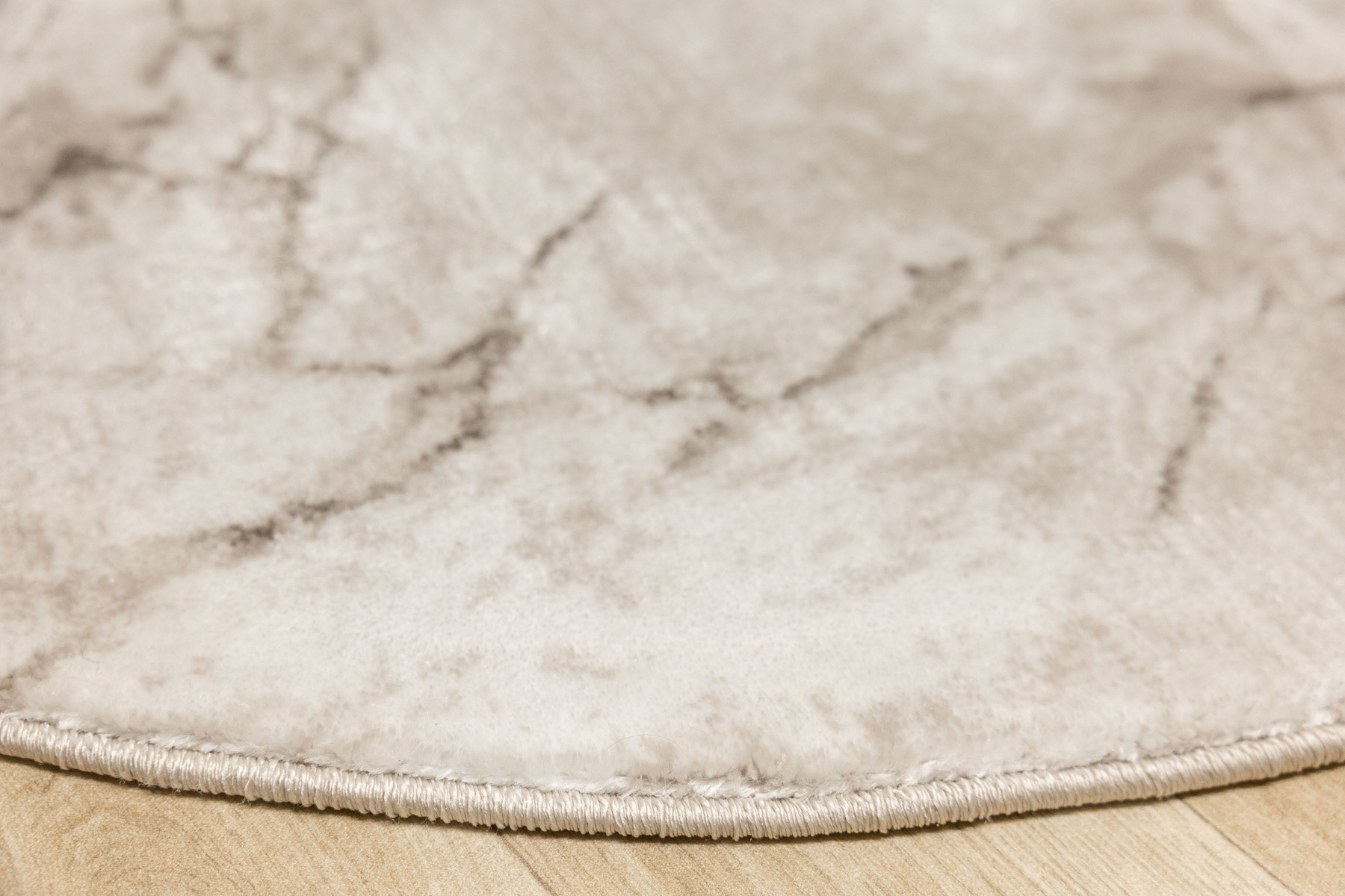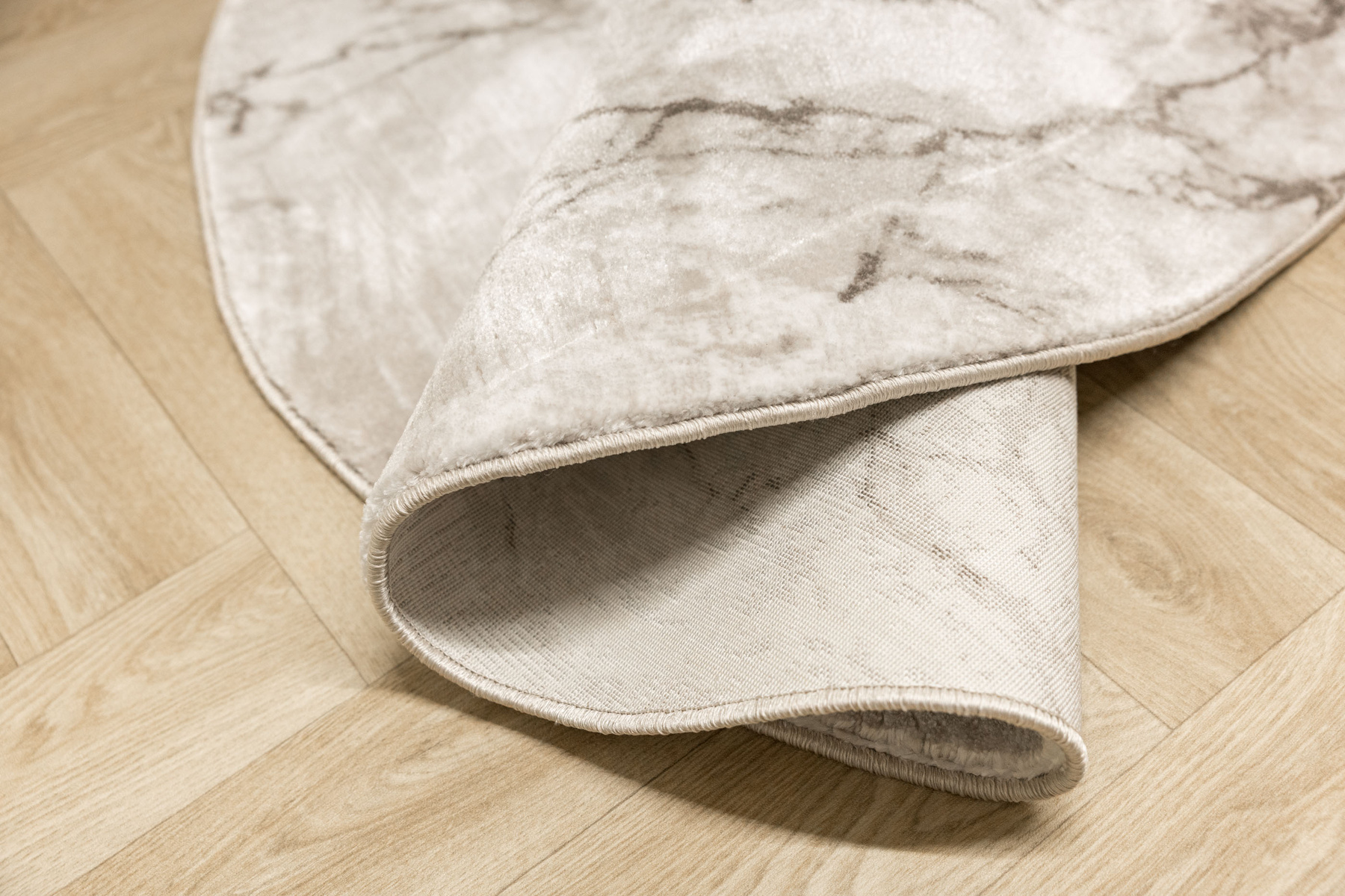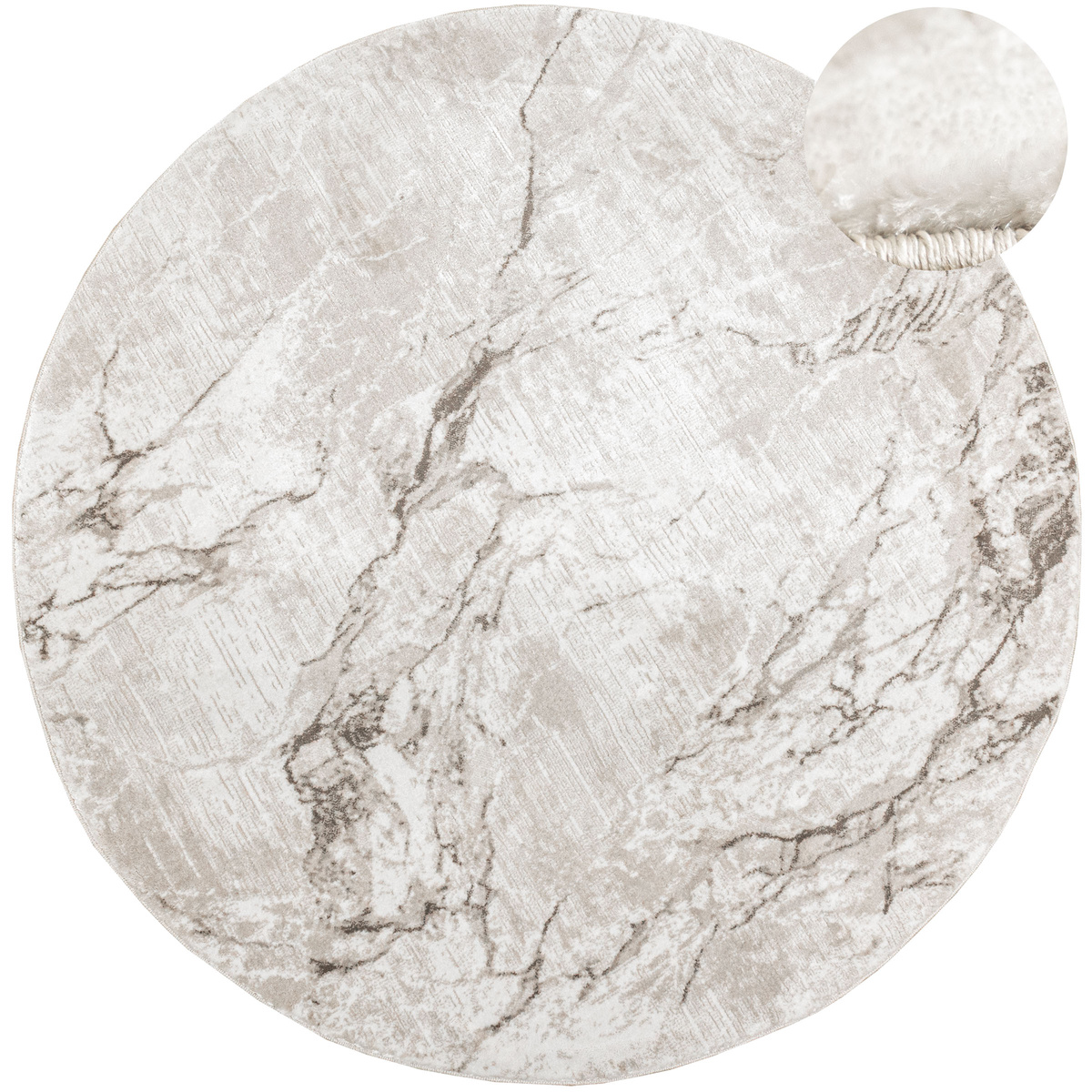 - Okrągły luksusowy dywan Nantes o mięciutkim, lekko lśniącym, dwupoziomowym runie z przecieranym wzorem imitującym taflę marmuru, w odcieniach szarości zmieszanej z beżem z akcentami kremu, ze spodem wykończonym bawełną.